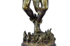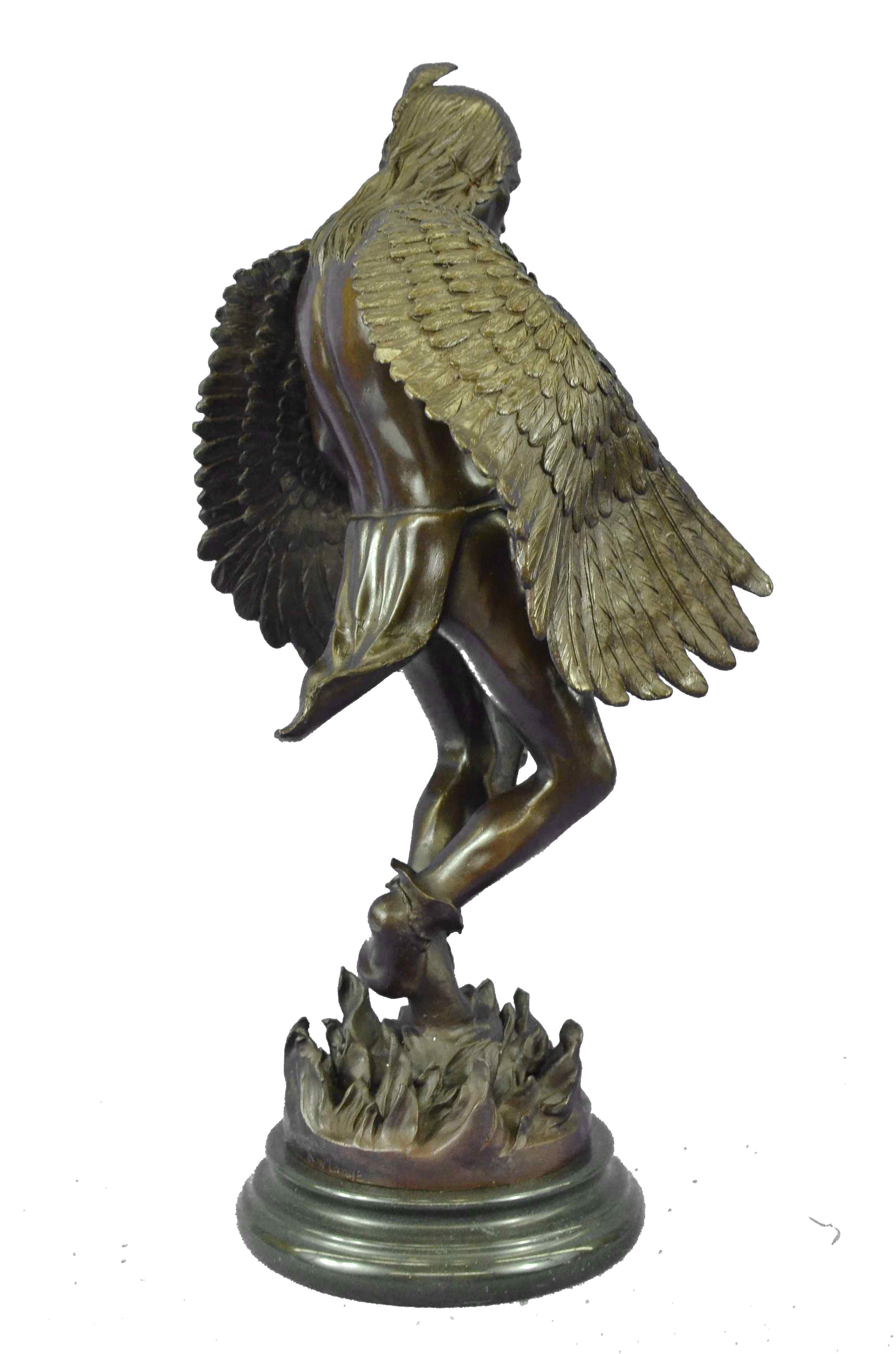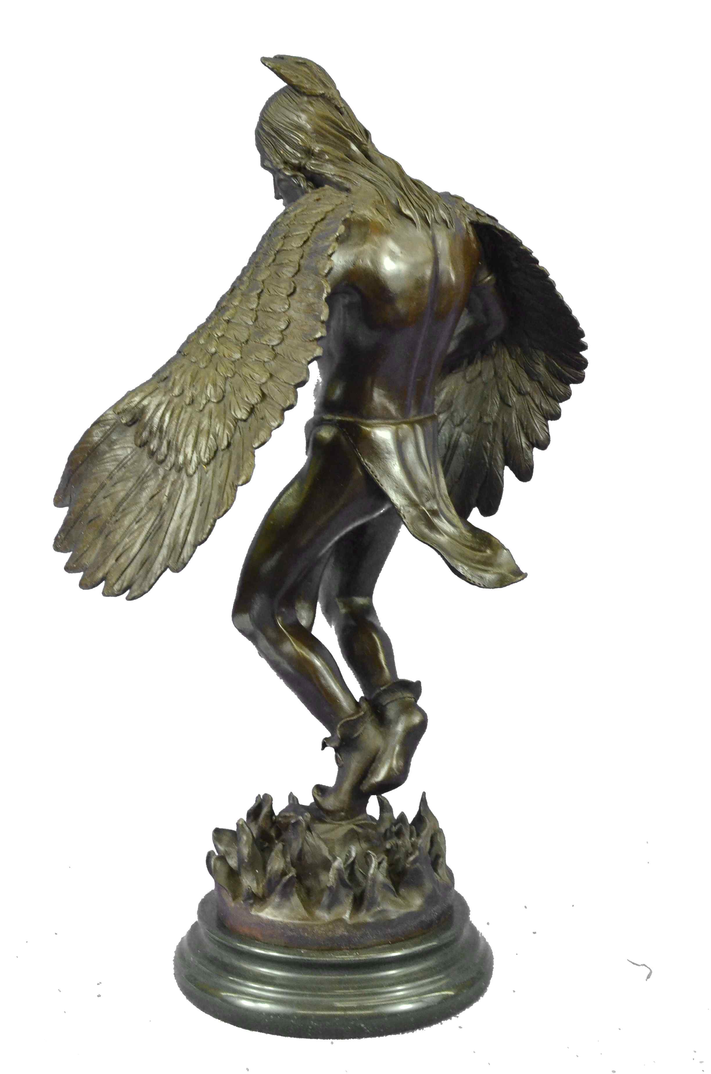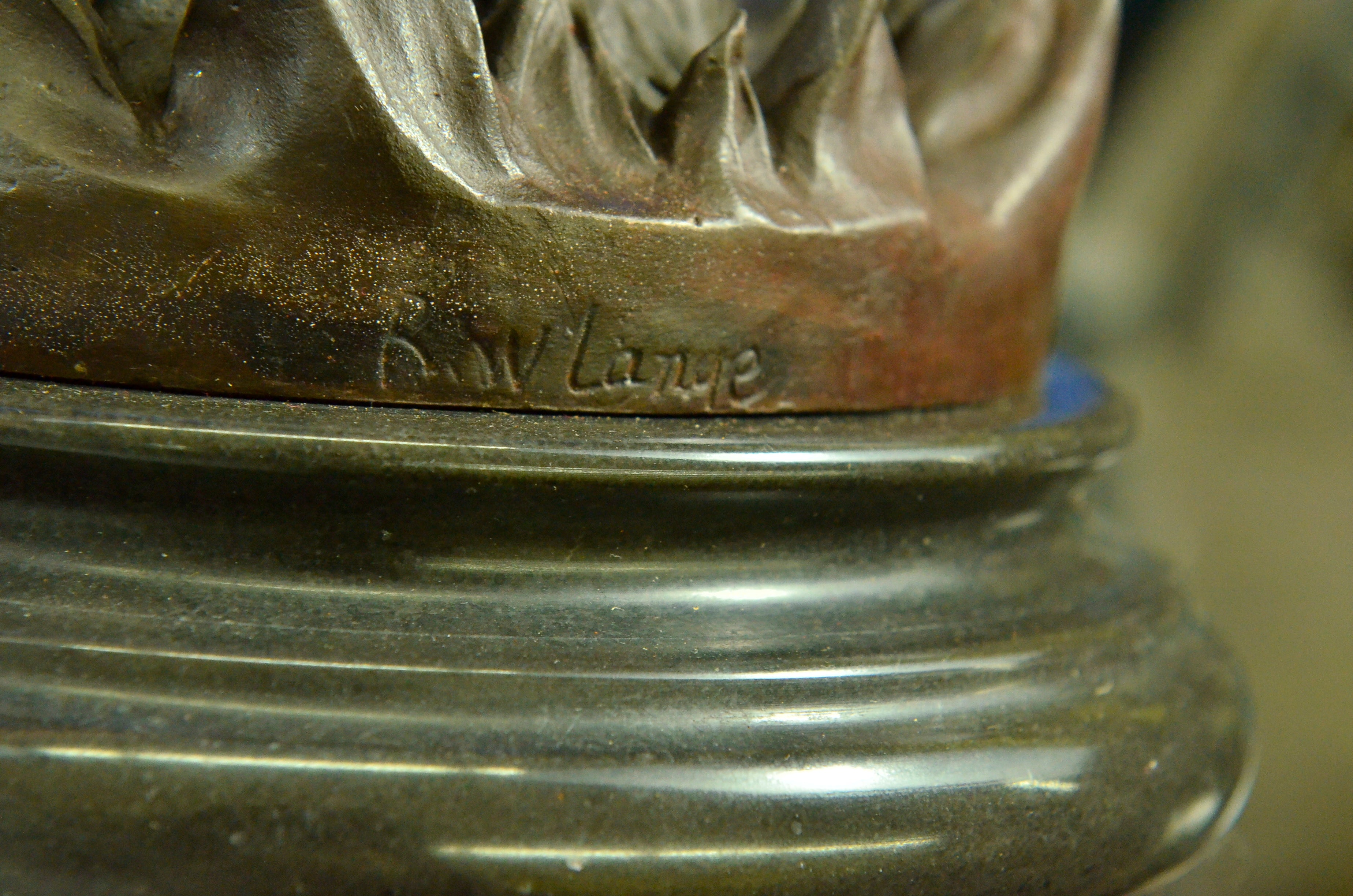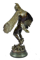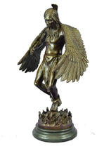 The Native American shaman, or medicine man, stands looking downward, with his arms bent that are attached to eagle wings. The eagle is a sacred messenger, carrying our prayers on its wings to the Creator, and returning with gifts and visions for the people. Eagle feathers assist shamans in connecting with the Spirit for healing. They are deemed the most sacred healing tools, a symbol of power, healing and wisdom. The bronze sculpture was molded using the ancient method of lost-wax casting and finished with a brown patina tarnish. The sculpture is mounted upon a black variegated marble base with the artist R.W. Lange`s signature.Original or Reproduction: Reproduction