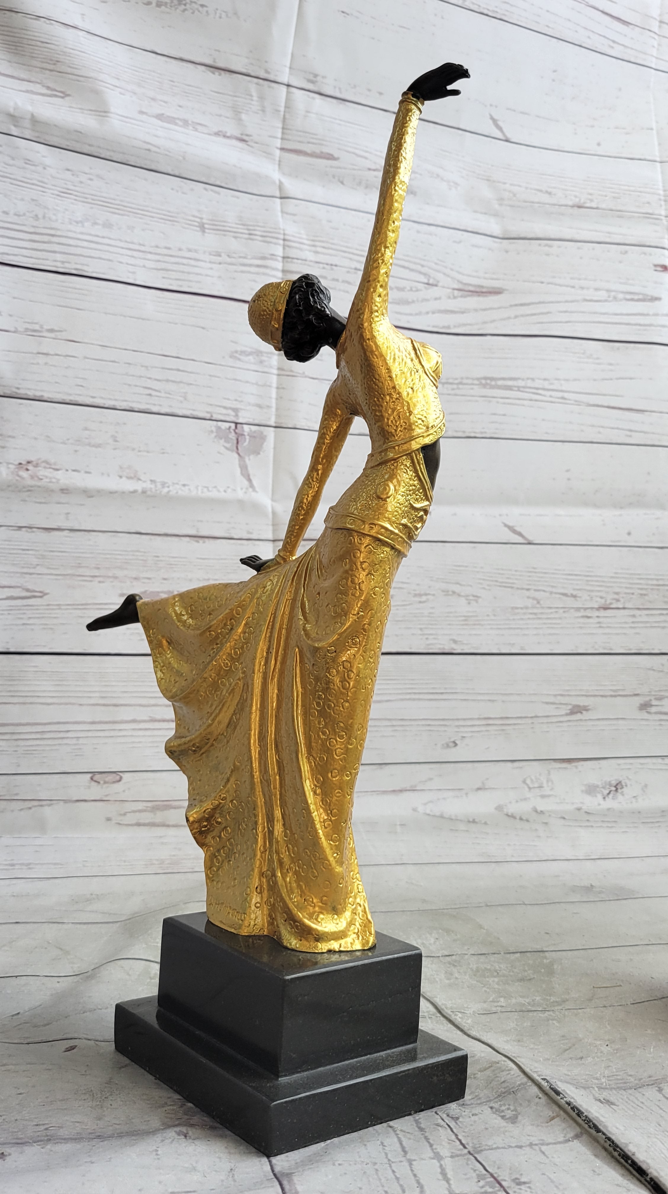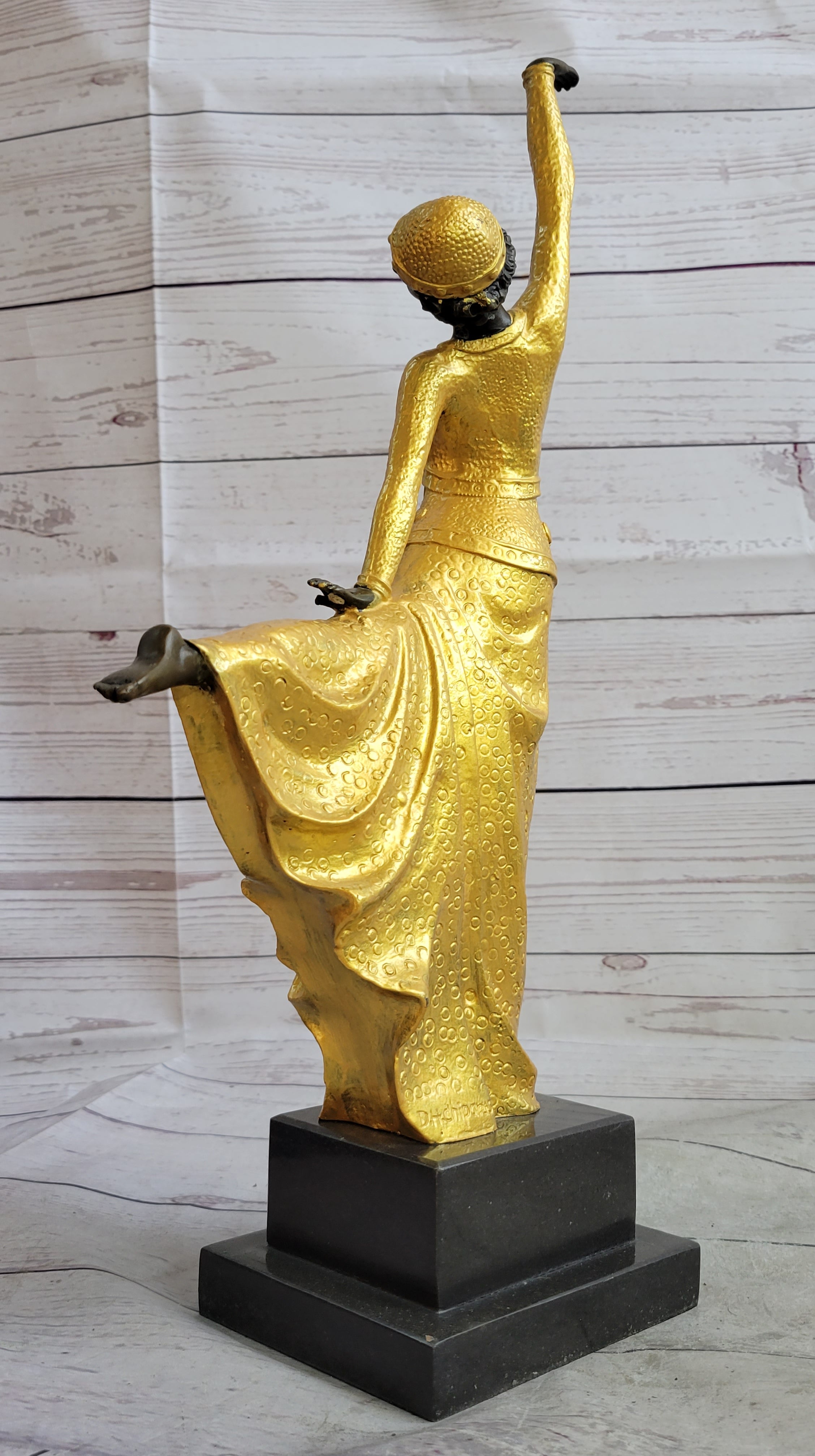 Immerse yourself in the world of dance with this enchanting bronze sculpture. The dancer's elongated form and dynamic pose exude a sense of energy and passion. Her flowing dress adds a touch of vibrancy to the sculpture, enhancing its visual appeal. This piece is a testament to the skill and artistry of D.H. Chiparus, a celebrated artist known for his mastery in capturing the essence of movement and beauty. With its black marble base and the artist's signature, this sculpture is not only a striking decorative piece but also a valuable collectible for art enthusiasts. Created using the time-honored lost wax method, it reflects the dedication and precision that goes into producing such exceptional artwork.