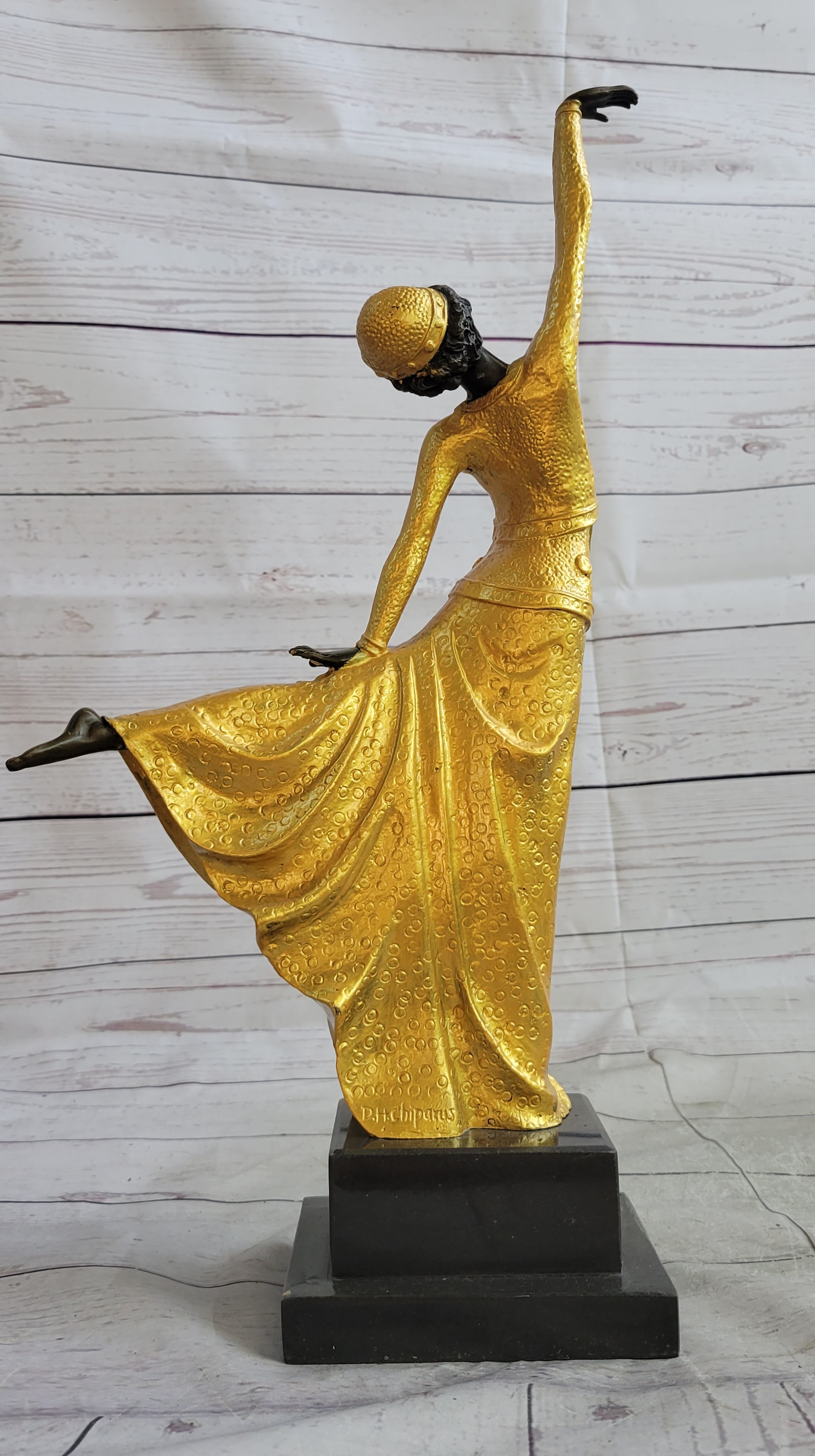 Introducing a captivating bronze sculpture that embodies the grace and beauty of dance. This exquisite piece features an elegant dancer extending her long leg in a mesmerizing arabesque. Her vibrant dress gracefully flows with her movement, creating a sense of fluidity and motion. As she reaches towards the sky, her head tilts in harmony with the dance. This sculpture is a stunning tribute to the art of dance, capturing its essence with finesse and elegance. Mounted on a sleek black marble base, it bears the signature of the renowned artist D.H. Chiparus. Crafted using the ancient lost wax method, this sculpture showcases the meticulous attention to detail and craftsmanship that brings it to life.