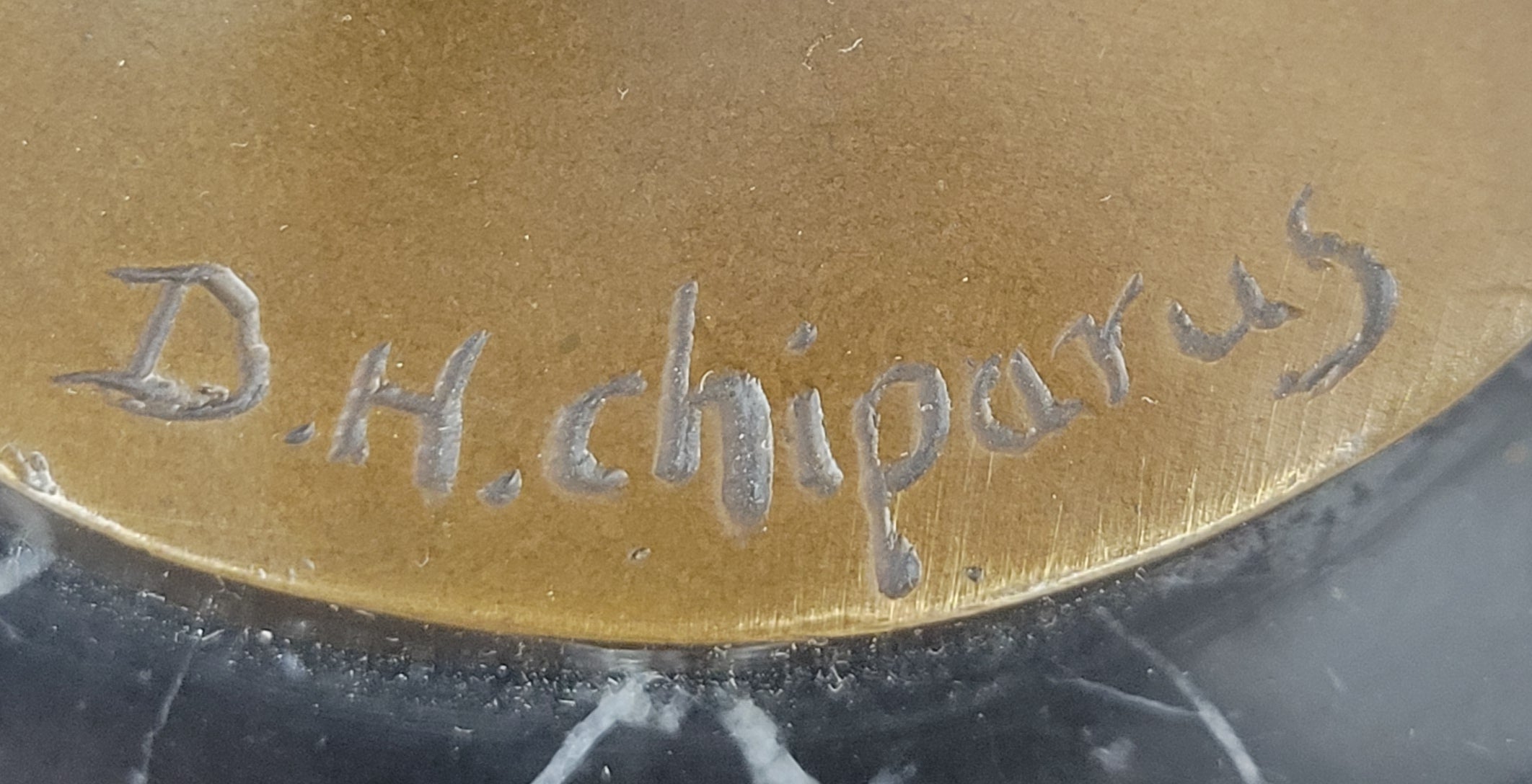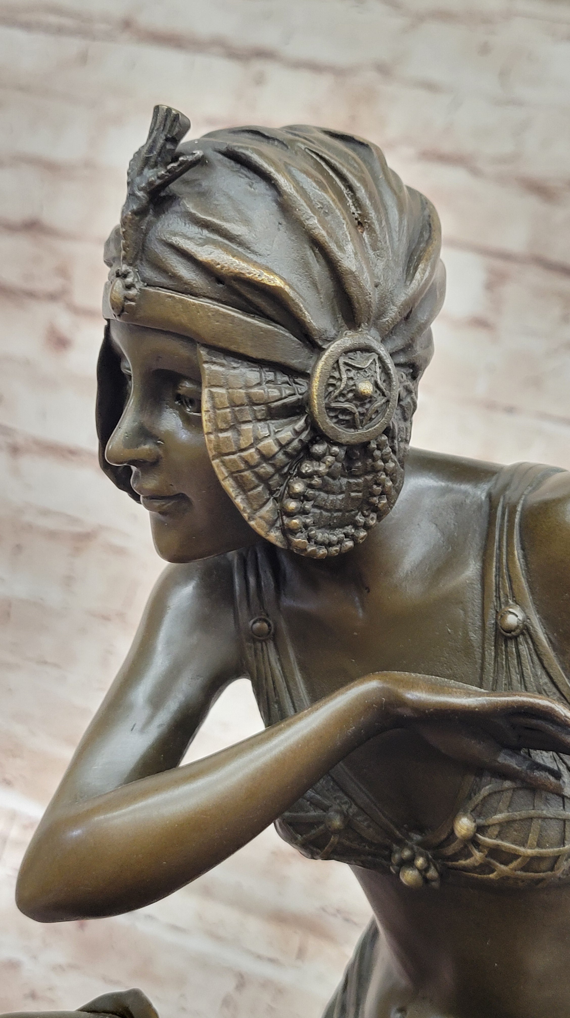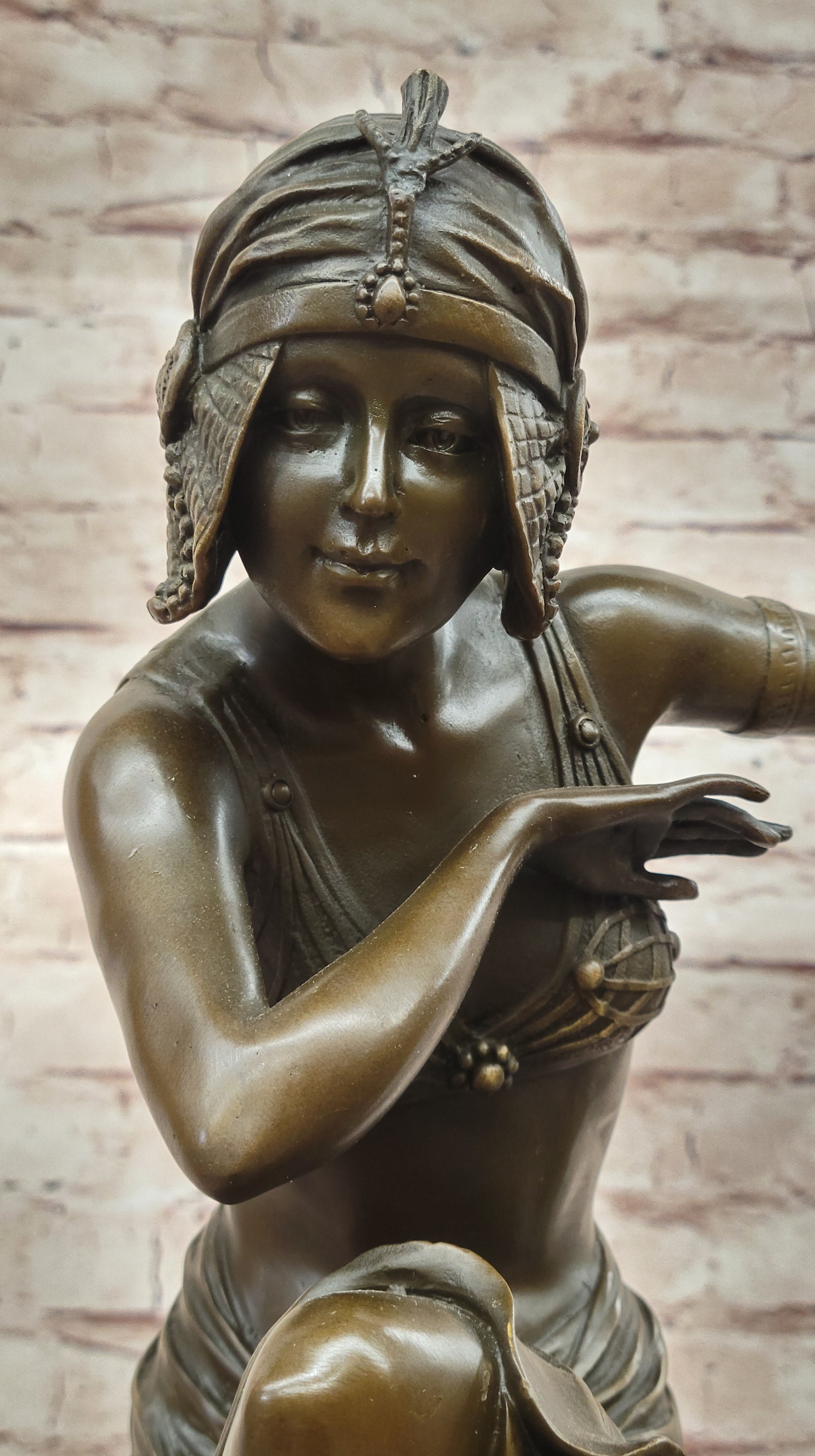 Introducing a stunning Art Deco Dancer Bronze Sculpture on Marble Base by D.H. Chiparus! This exquisite piece captures the essence of the Art Deco era, showcasing the beauty and elegance of the dancing form. With meticulous attention to detail, the sculpture portrays a graceful woman kneeling and leaning forward, exuding a sense of movement and poise. The bronze art object is proudly displayed on a rectangular marble base, adding a touch of sophistication to any space.