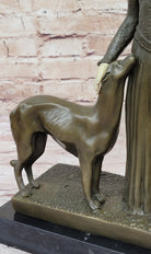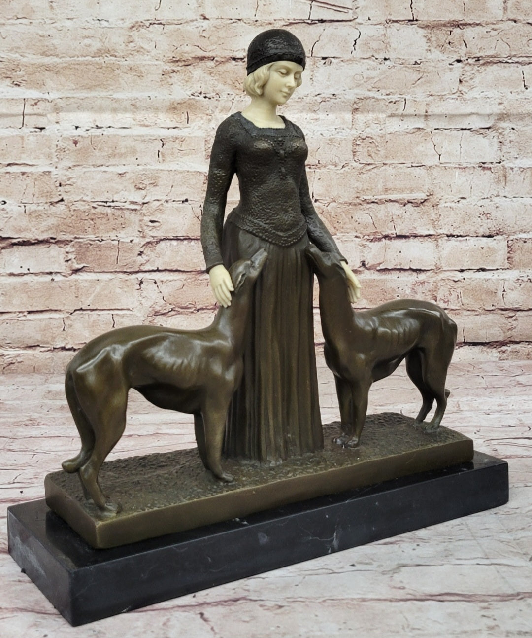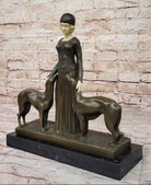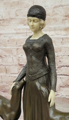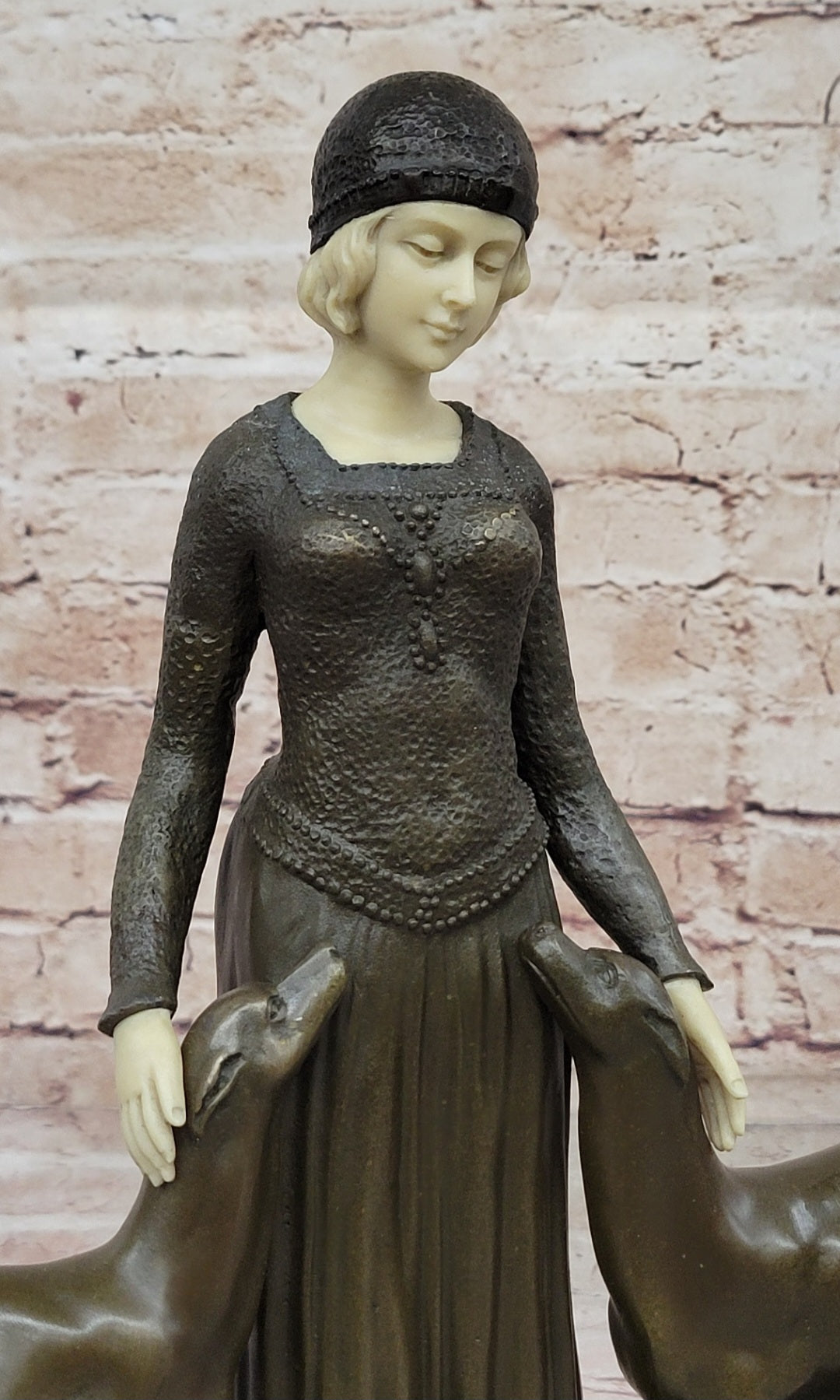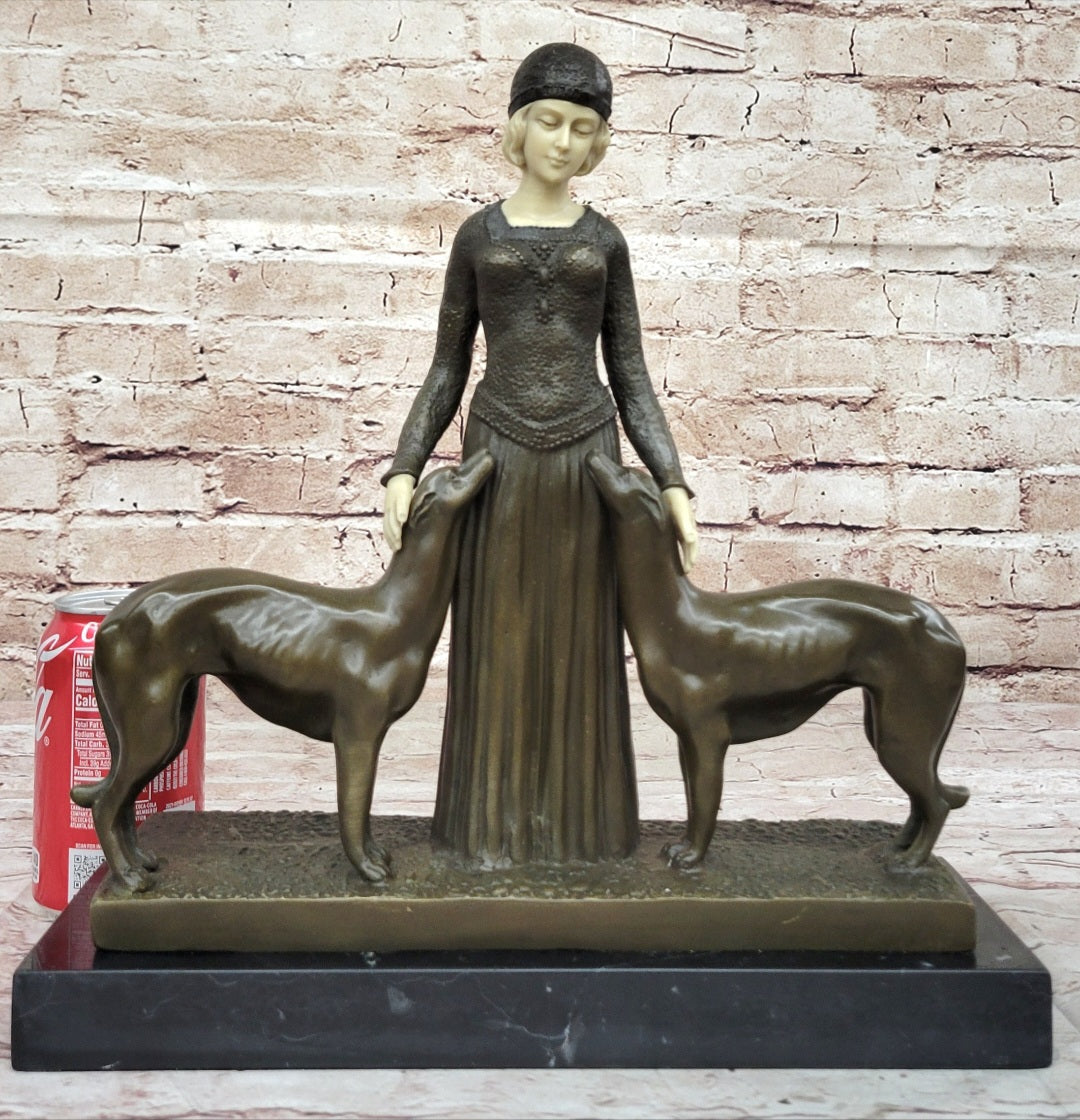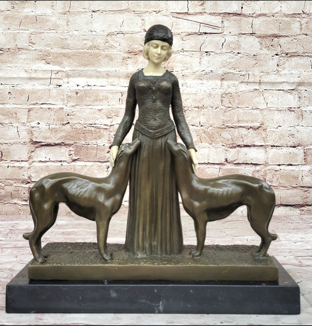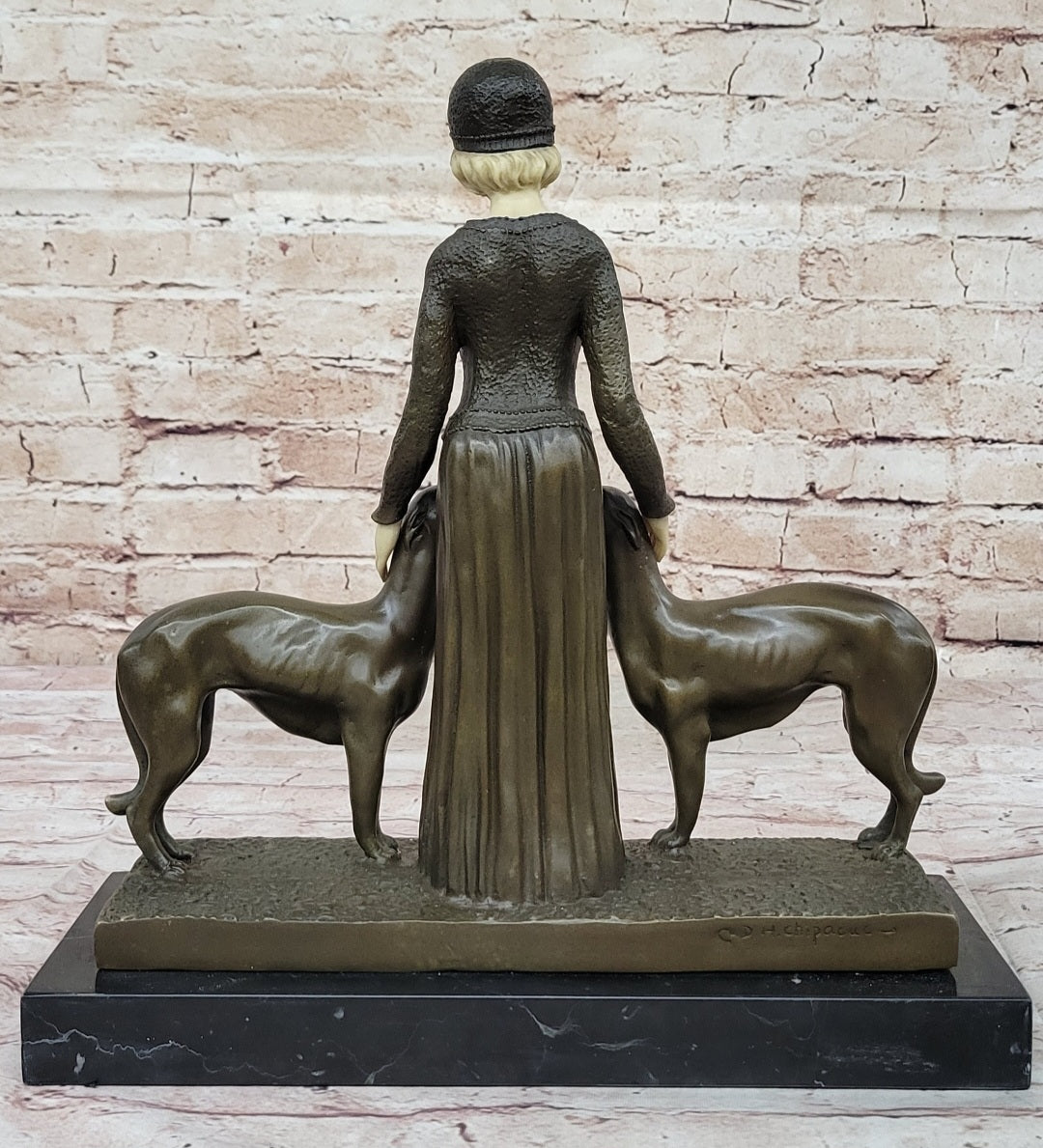 Chiparus Art Deco Bronze Sculpture of Girl with Pair of Afghan Dogs