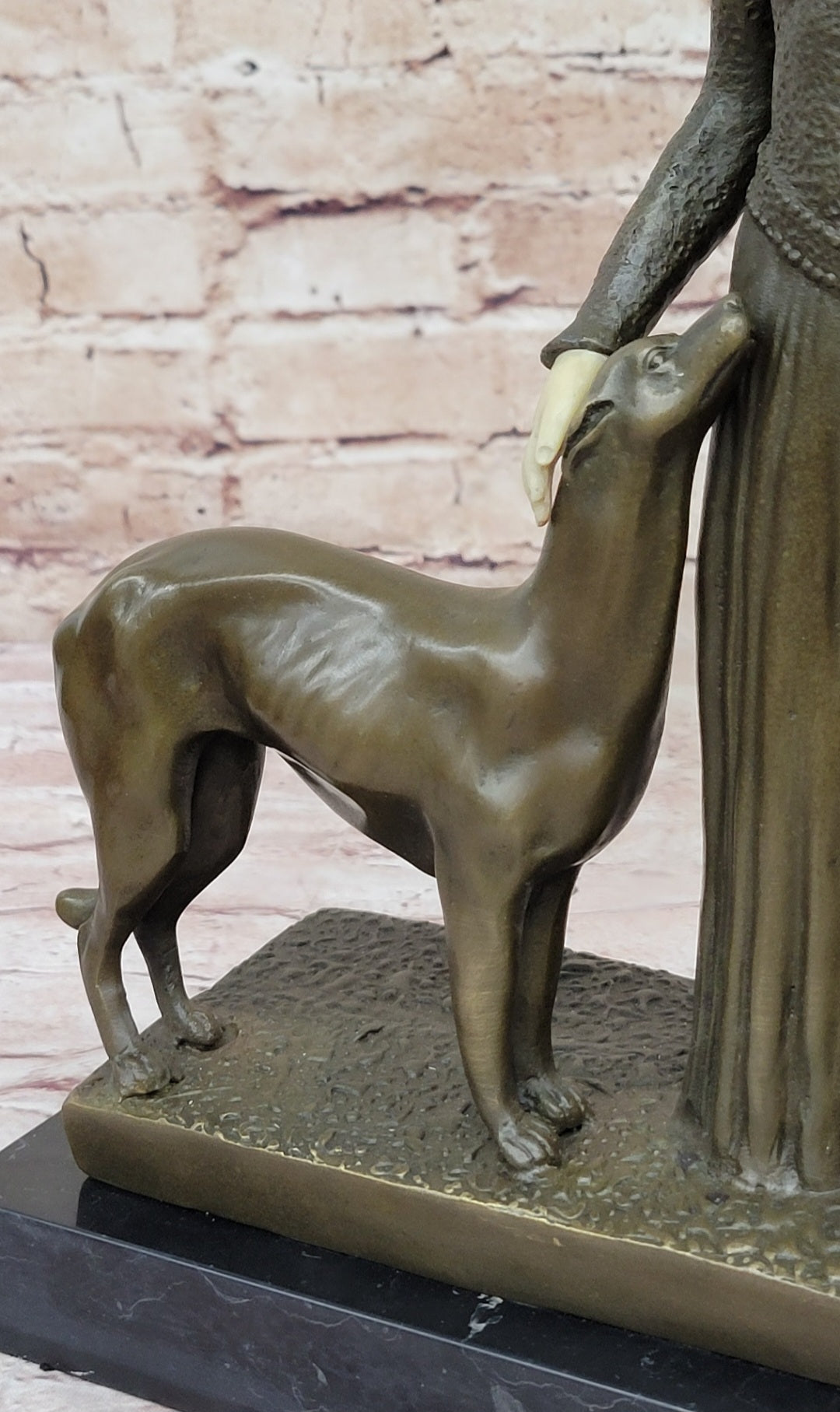 Crafted with meticulous attention to detail, the sculpture captures the graceful symmetry of the hounds as they approach their owner, their movements synchronized in perfect harmony. The delicate features of the owner's face and hands, made from resin for added realism, convey a sense of warmth and tenderness as she reaches out to pat her loyal companions.