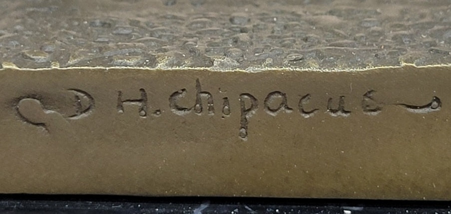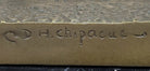 Mounted on a variegated red Tennessee marble base, adorned with the signature of the esteemed artist D.H. Chiparus, the sculpture stands as a timeless tribute to the enduring bond between humans and their animal companions. Through its exquisite craftsmanship and emotive portrayal, it invites viewers to experience the beauty of this special moment shared between the owner and her beloved hounds.Bronze Dimensions with Marble Base: Height 13" X Width 12.5"