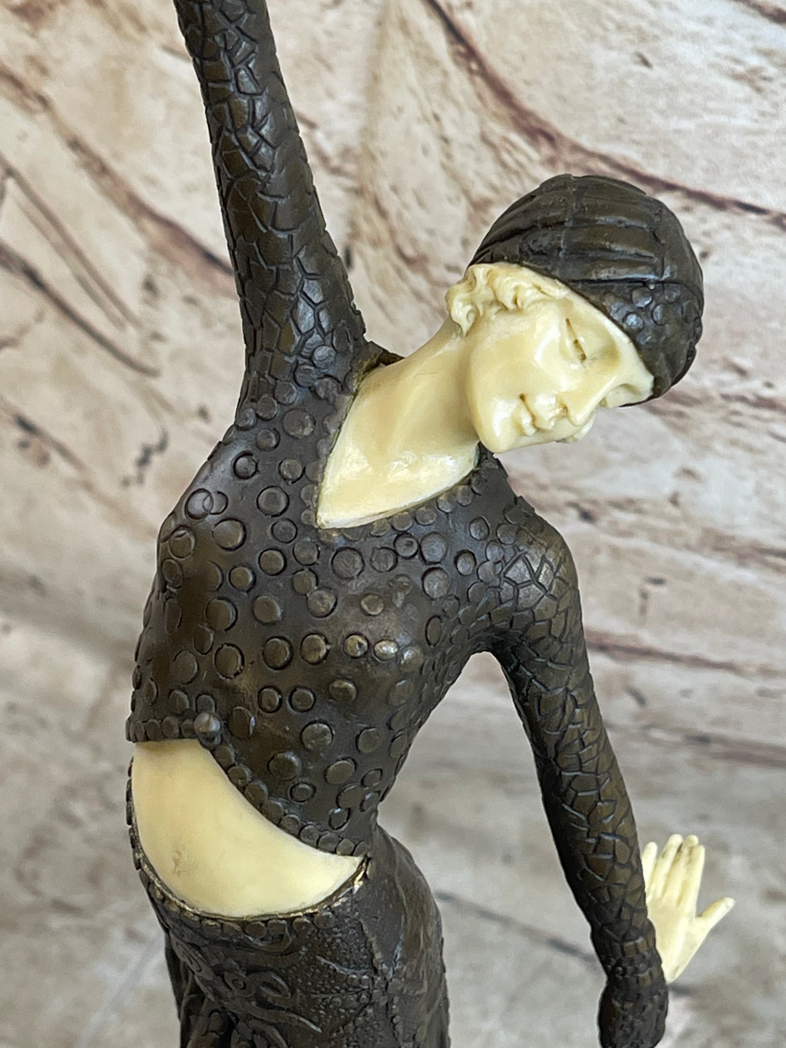 Handcrafted with meticulous attention to detail, this bronze sculpture captures the essence of the belly dancer's mesmerizing presence. The body is crafted from 100% bronze, while the hands and face are meticulously sculpted from resin, ensuring a lifelike and exquisite portrayal. Created using the renowned "Lost Wax Method," this sculpture exemplifies the dedication to artistry and craftsmanship. Mounted on a sturdy marble base, this artwork is signed by the renowned artist D.H Chiparus, adding a touch of quality and prestige to its already captivating presence.Bronze Dimensions with Marble Base: Height 15" X Width 5"