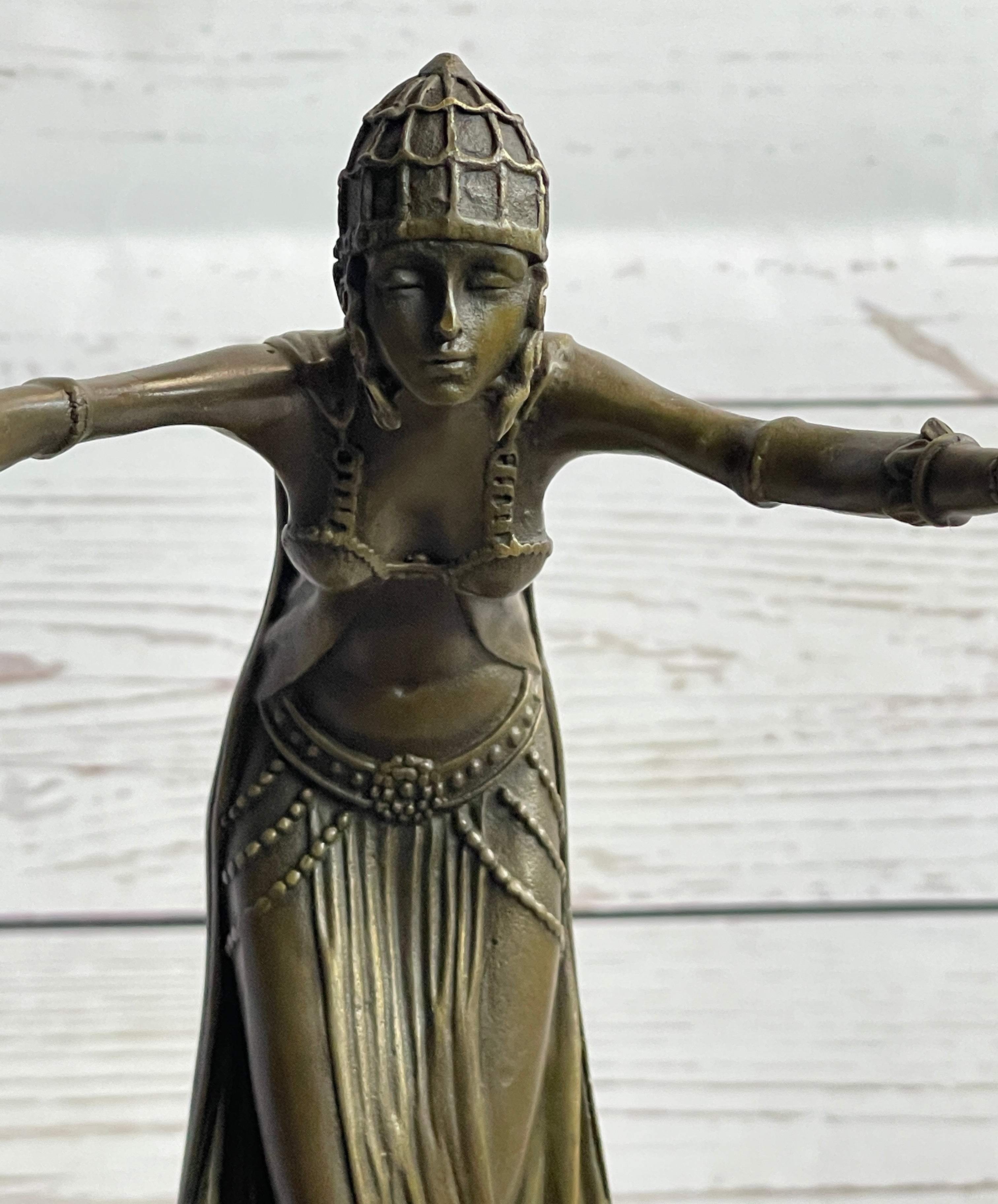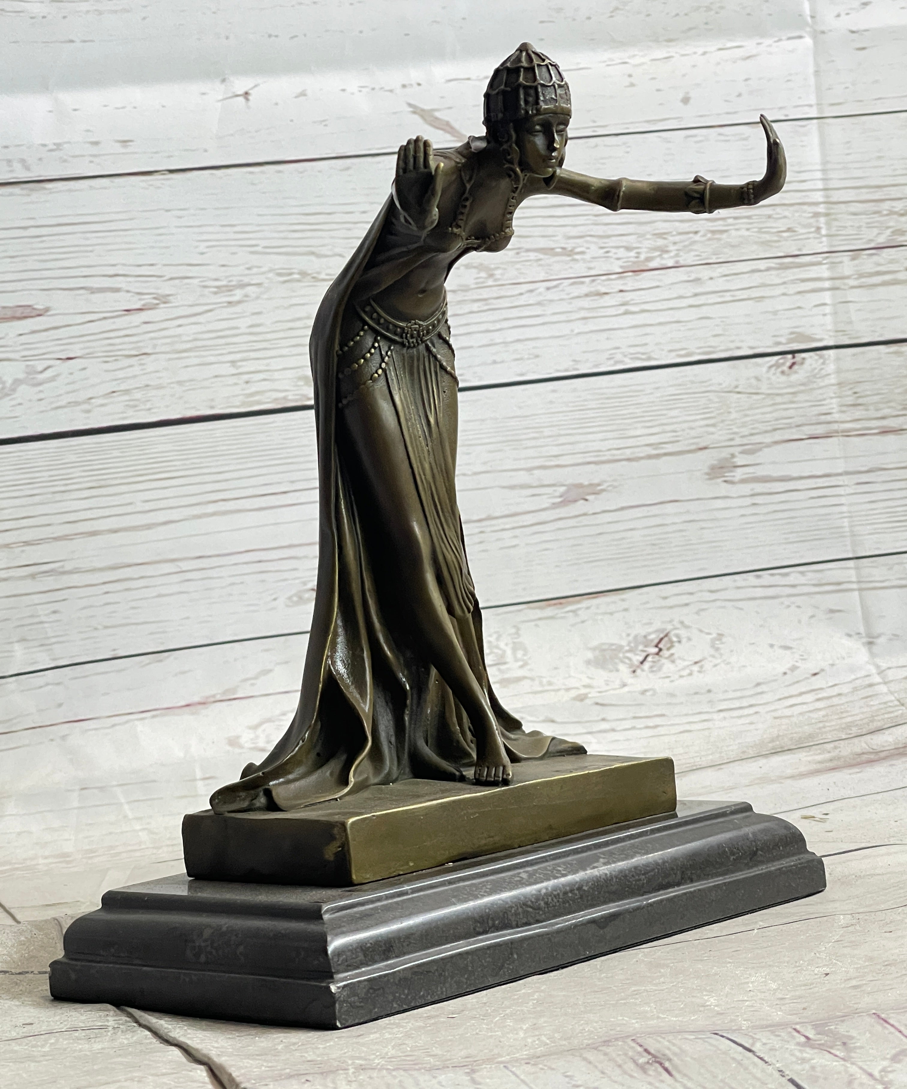 Indulge in the timeless beauty of ancient Egypt with this captivating bronze sculpture of an Egyptian princess. With graceful poise, she bows graciously, her hands extended to her sides, while her regal dress elegantly flows down her legs and gathers at her feet. Adorned with a jeweled crown that drapes around her face, she exudes an air of royalty and majesty.