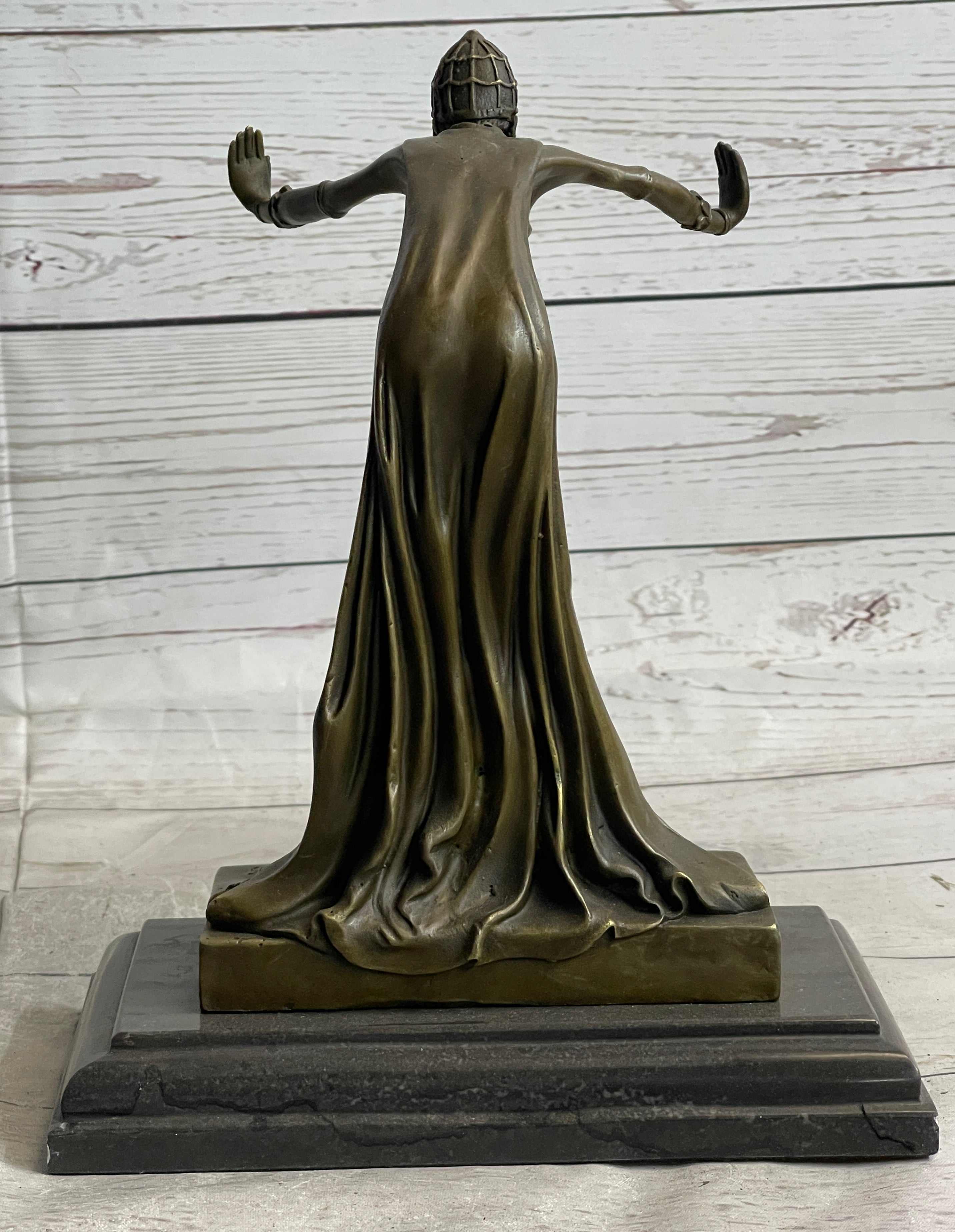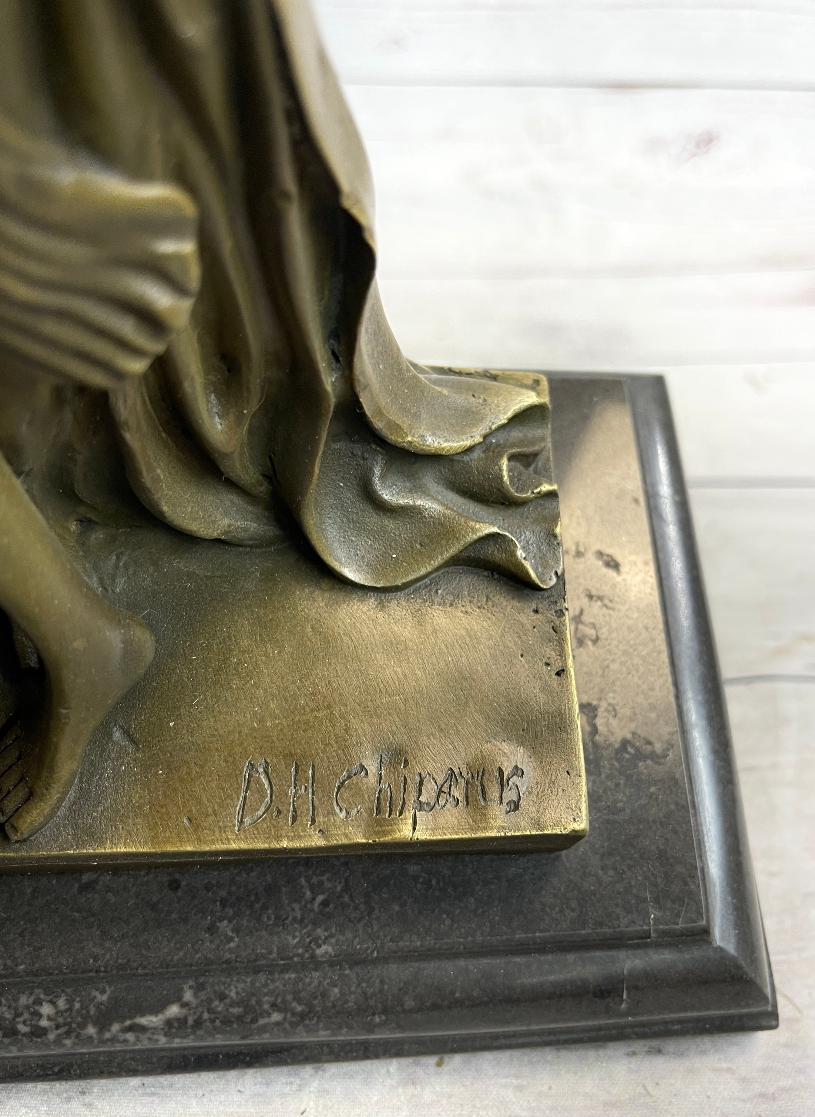 Crafted using the revered "Lost Wax Method," this sculpture exemplifies the meticulous craftsmanship involved in its creation. Mounted on a black beveled marble base, it exudes a sense of sophistication and grandeur. The sculpture is signed by the renowned artist Chiparus, further enhancing its value and quality. The two-tone brown patina accentuates the sculpture's details, creating highlights and shadows that bring the artwork to life.