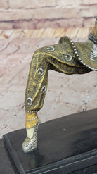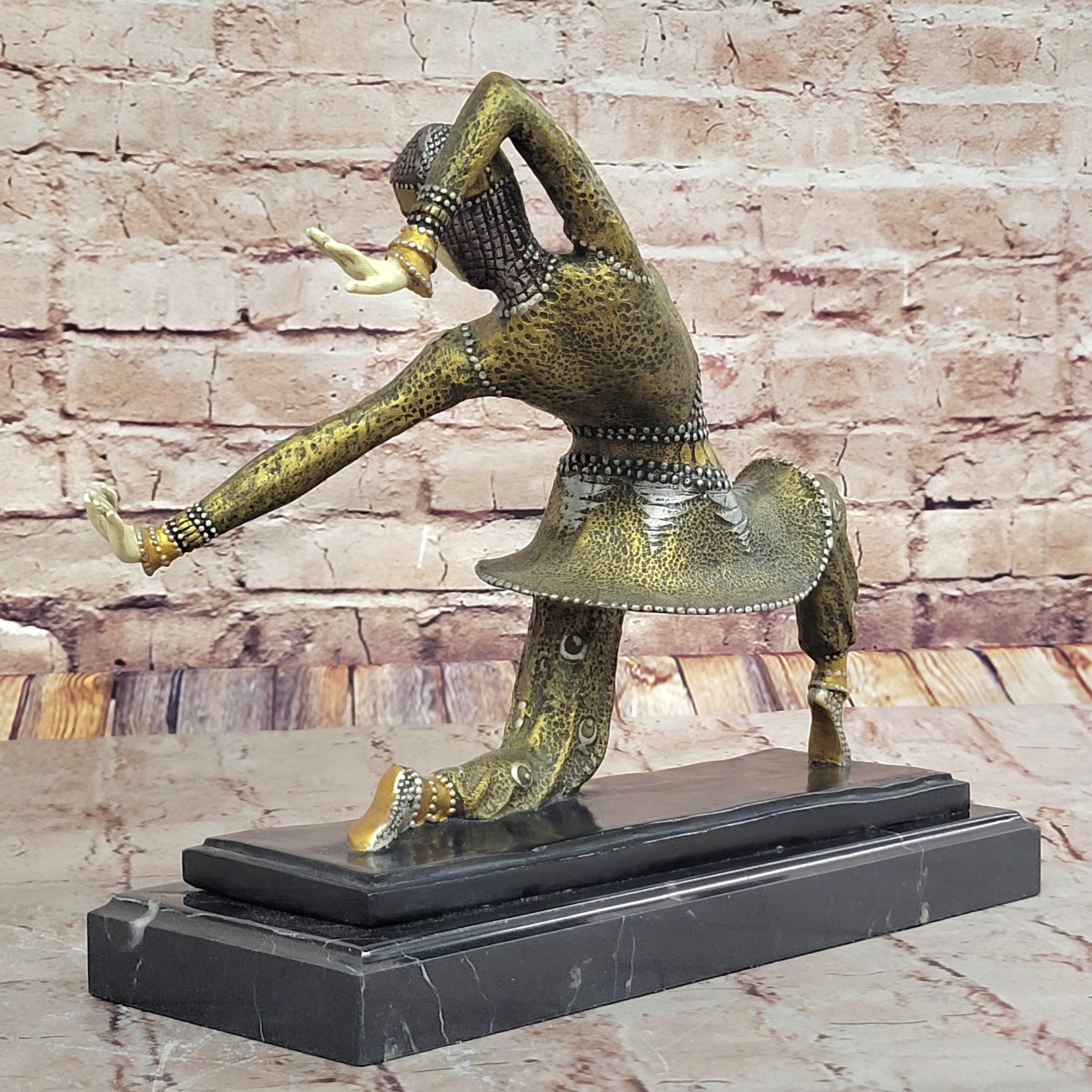 Mounted on a sleek black marble base, this signed Chiparus piece not only celebrates the art of dance but also makes a bold statement in any collection. The vibrant colors and classic bronze finish allow this work of art to stand out as both a decorative accent and a timeless collectible. Perfect for collectors of Art Deco sculptures or those with a passion for dance, this sculpture brings elegance and movement to any space.Bronze Dimensions with Marble Base: 10" X 12.5"