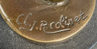 This exquisite bronze sculpture titled "Oriental Dancer with Disc and Dagger" by Claire Colinet captures the grace and allure of an enchanting oriental dancer. The artist's attention to detail is evident in the intricate design of the dancer's costume, featuring flowing drapery and elaborate embellishments. With one hand holding a disc and the other poised with a dagger, she exudes both elegance and strength.