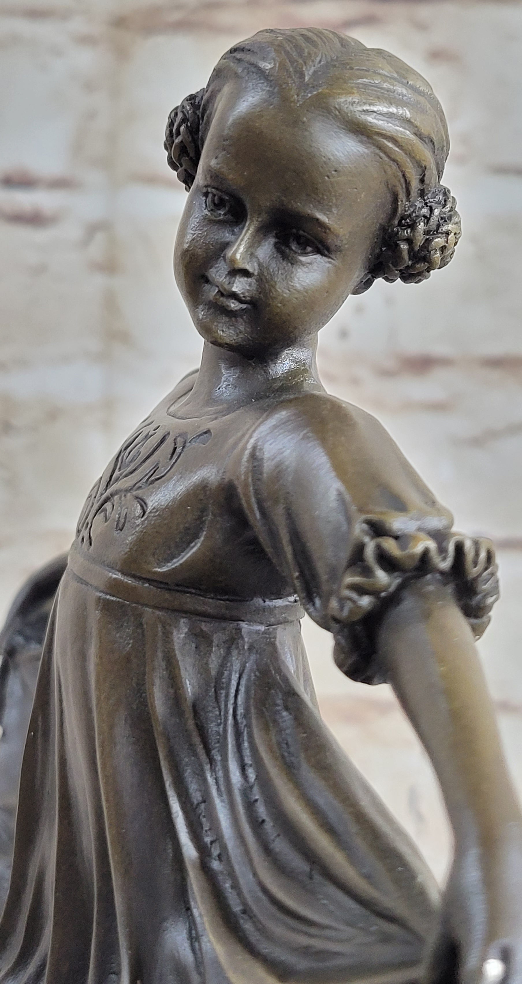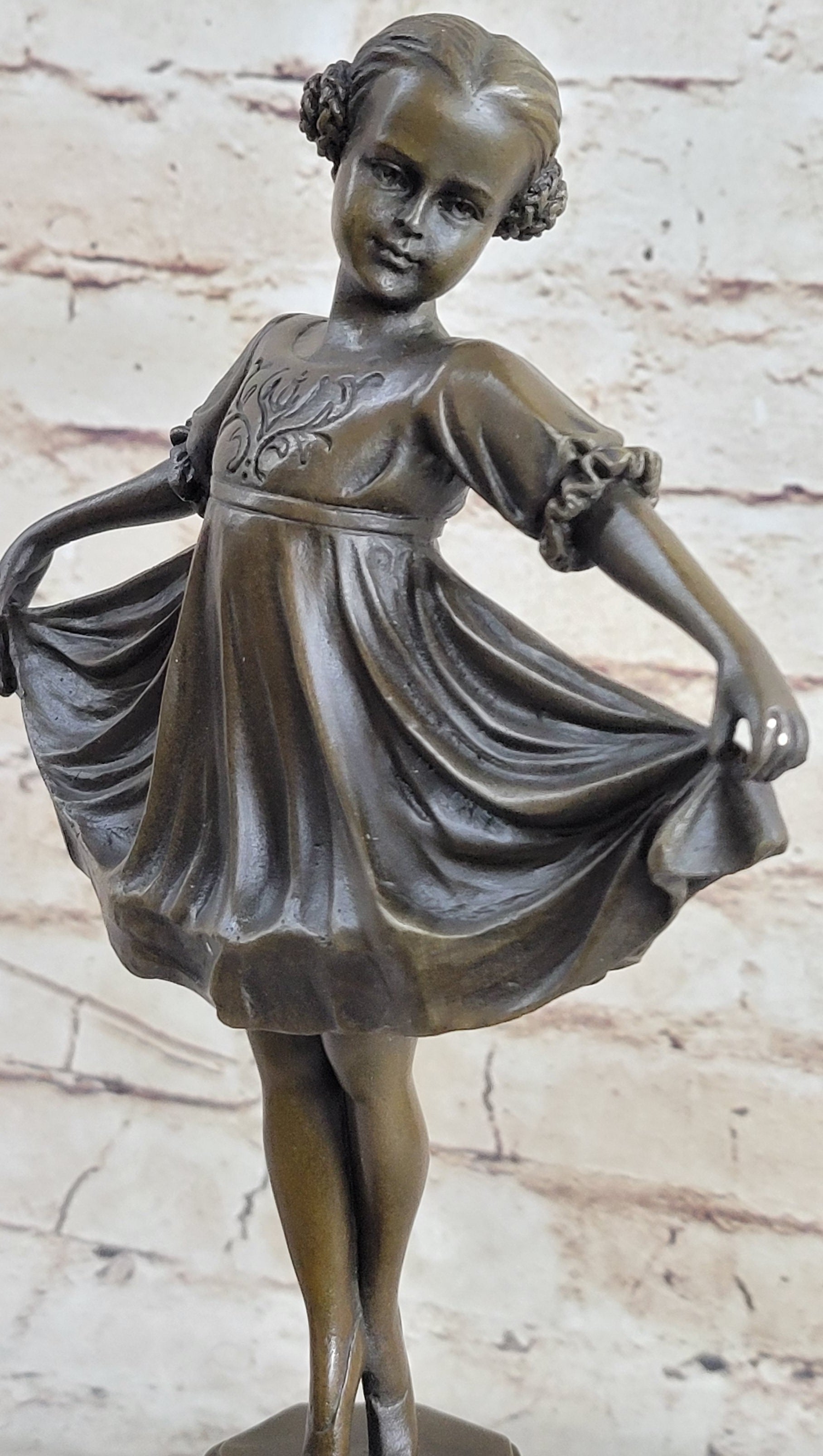 Experience the grace and elegance of this captivating bronze statue depicting a young girl in the midst of a mesmerizing dance. Balanced delicately on her tiptoes, she exudes a sense of effortless movement and artistry. Her head tilts gracefully to the side, her eyes reflecting her passion and determination for the performance.