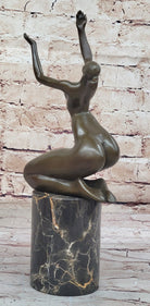 Embark on a journey of abstract beauty with this captivating bronze sculpture, a true work of art by the skilled hands of artist Juno. The sculpture features an abstract portrayal of a beautiful woman posing for a timeless portrait. With her long and rounded body, she stretches gracefully, creating an alluring silhouette. Kneeling and curling an arm upward, she exudes a classic pin-up charm.