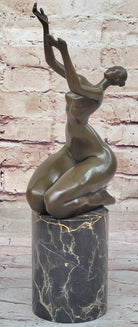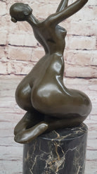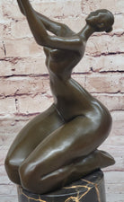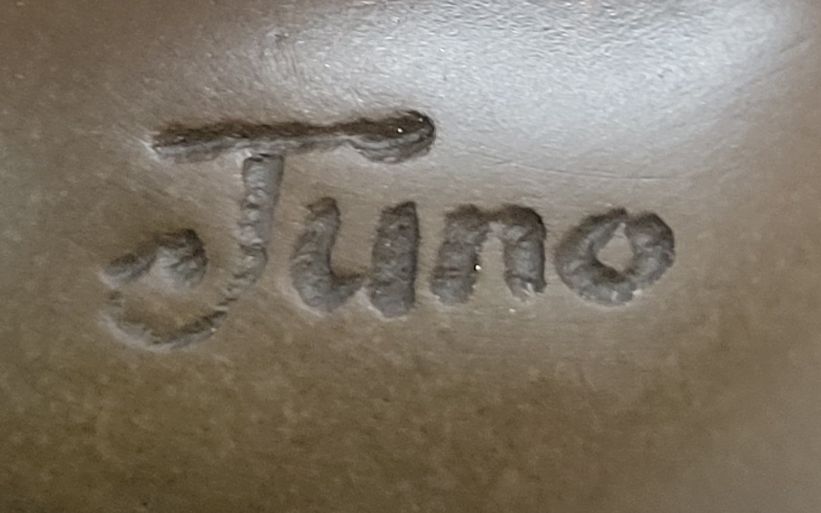 Mounted on a sturdy marble base, this sculpture stands as a symbol of both strength and elegance. Juno's signature on the artwork further emphasizes its authenticity and artistic value. Whether displayed in a home or art collection, this sculpture invites viewers to appreciate the abstract beauty and timeless allure captured within its form.Bronze Dimensions with Marble Base: Height 12.5" X Width 4"