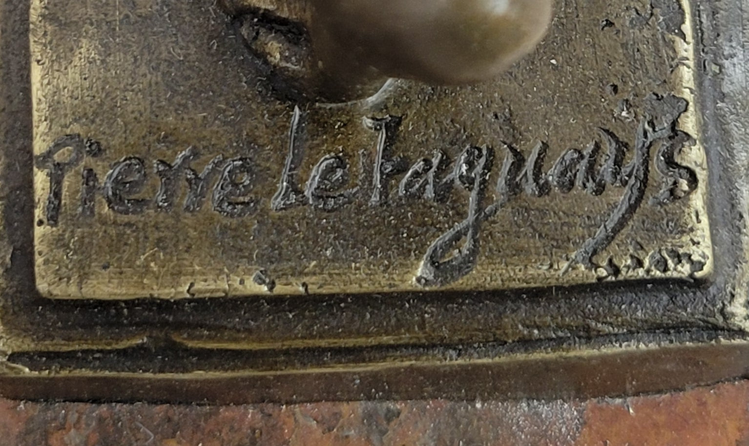 Crafted using the lost wax method, which is known for its ability to preserve fine details and nuances, this bronze sculpture is mounted on a beige marble base that complements the rich brown patina finish of the artwork. It is a testament to Le Faguays' skill and artistic vision, making it a prized addition to any art collection.Bronze Dimensions with Marble Base: Height 21" X Width 18"
