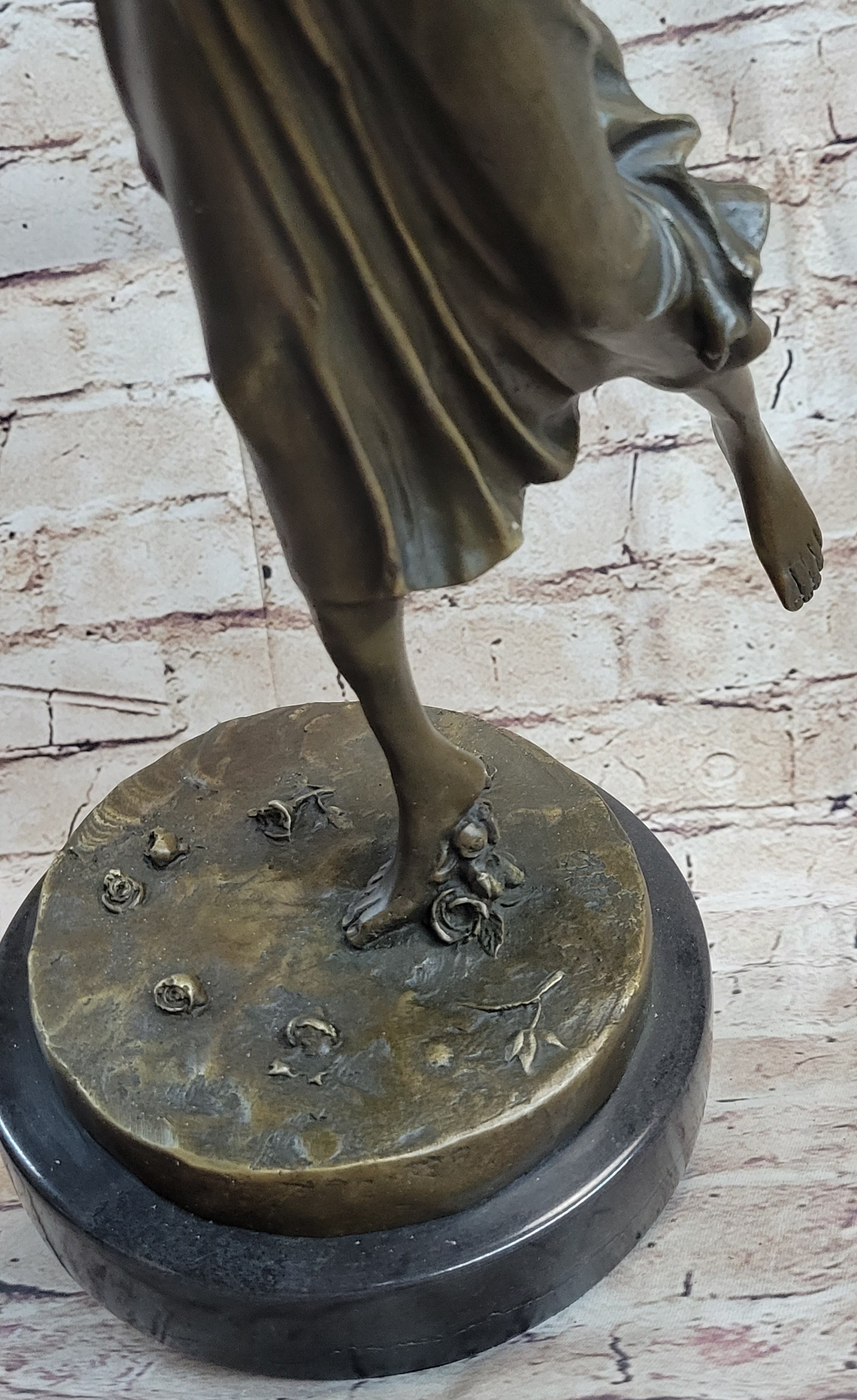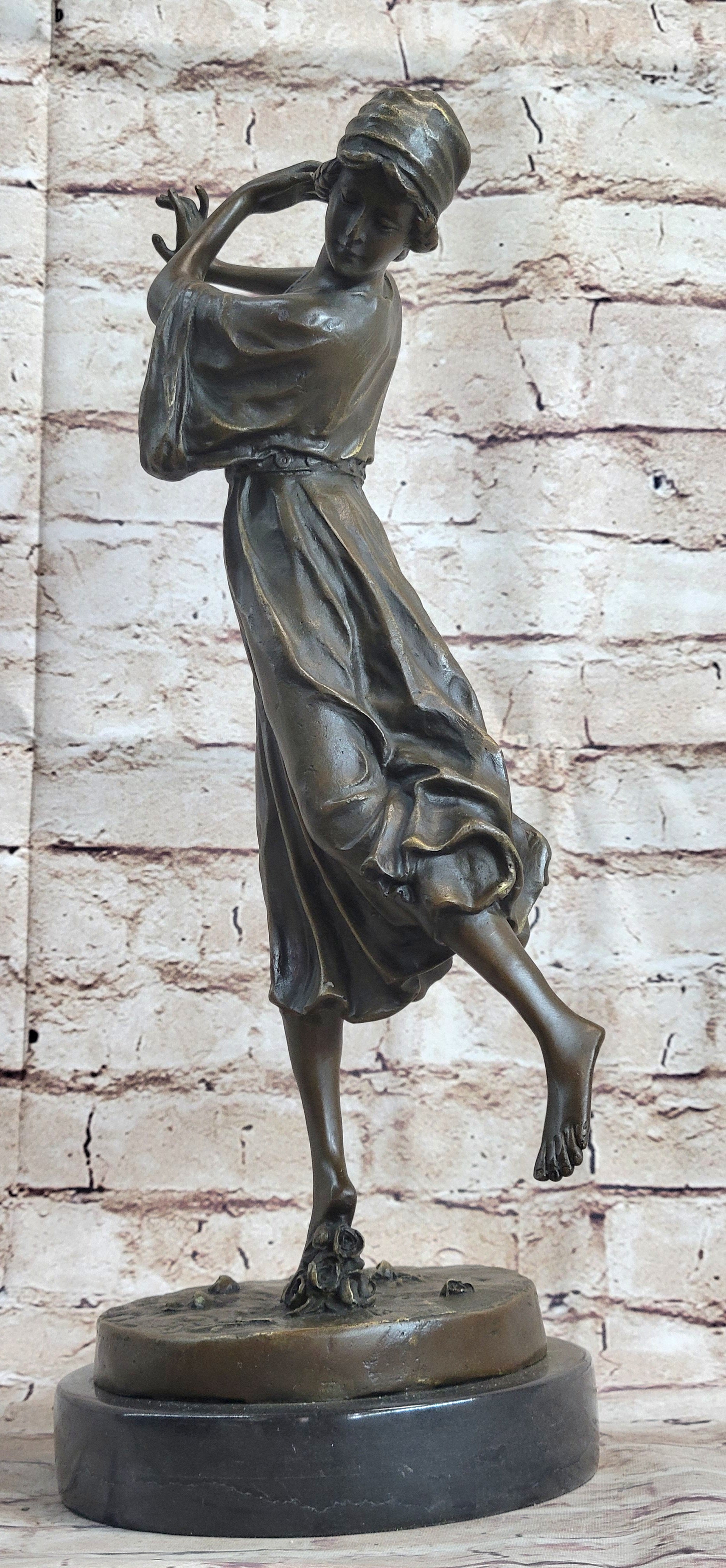 Experience the enchanting beauty of a graceful dancer captured in this exquisite bronze statue. As she glides across the stage, the audience is captivated, showering her with roses in appreciation of her mesmerizing performance. In the midst of her dance, she delicately lifts her leg, avoiding a bouquet of roses scattered on the floor. Her braided hair, adorned with a bonnet, adds an elegant touch to her appearance, ensuring that she remains focused on her art.