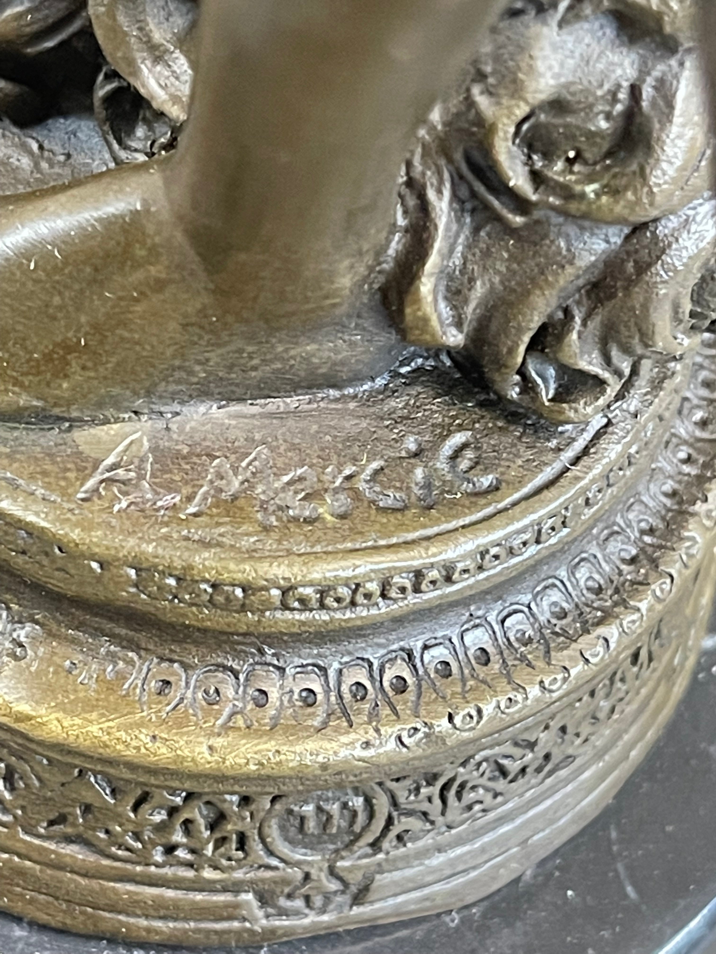 Mercie's signature on the base of the sculpture authenticates its craftsmanship and artistic heritage. This stunning piece not only captures the heroic essence of the biblical David but also invites viewers to consider the broader cultural and symbolic implications of its portrayal. Whether appreciated for its historical significance, artistic merit, or its nuanced appeal to different audiences, Mercie's "David" remains a thought-provoking and exquisite work of art.Bronze Dimensions with Marble Base: Height 13 1/2" X Width 7"