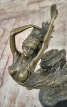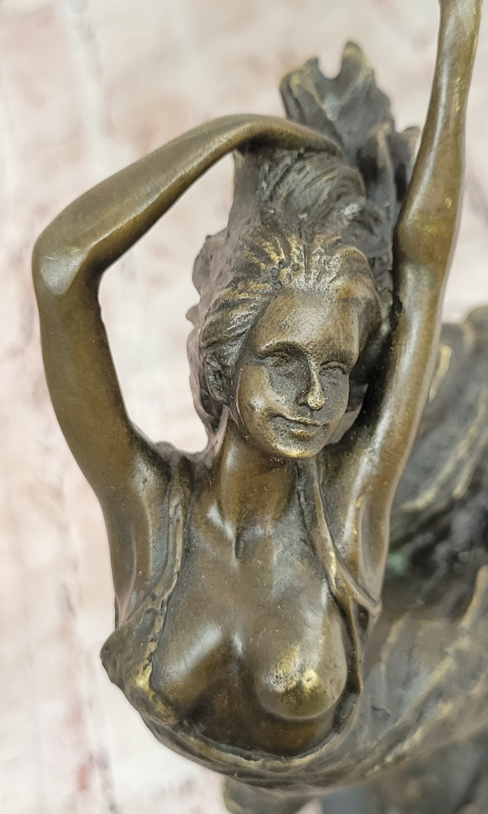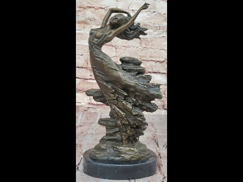 This mesmerizing bronze sculpture captures the free-spirited essence of a Gypsy dancer, her body moving fluidly like rolling waves with wild, untamed energy. Full of vibrancy and life, she performs a classic belly dance, captivating her audience with every graceful motion. Her curvaceous figure is highlighted by the intricate details of her outfit, which beautifully showcases her dynamic form as she leans back, running her fingers through her wild hair in a moment of pure freedom.
