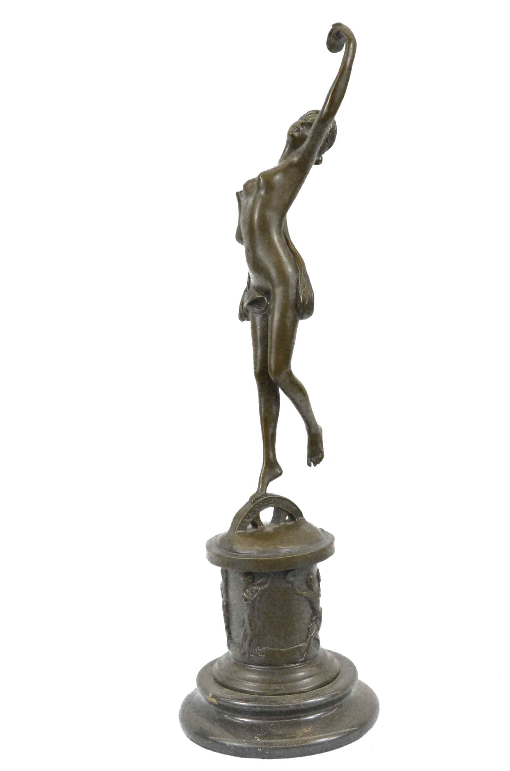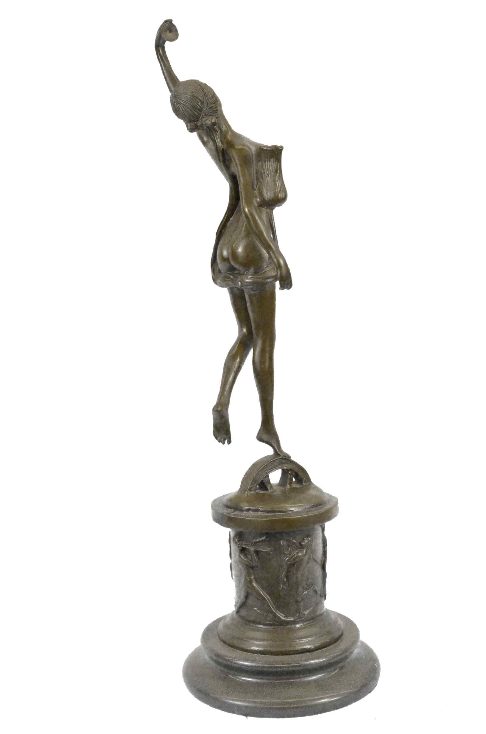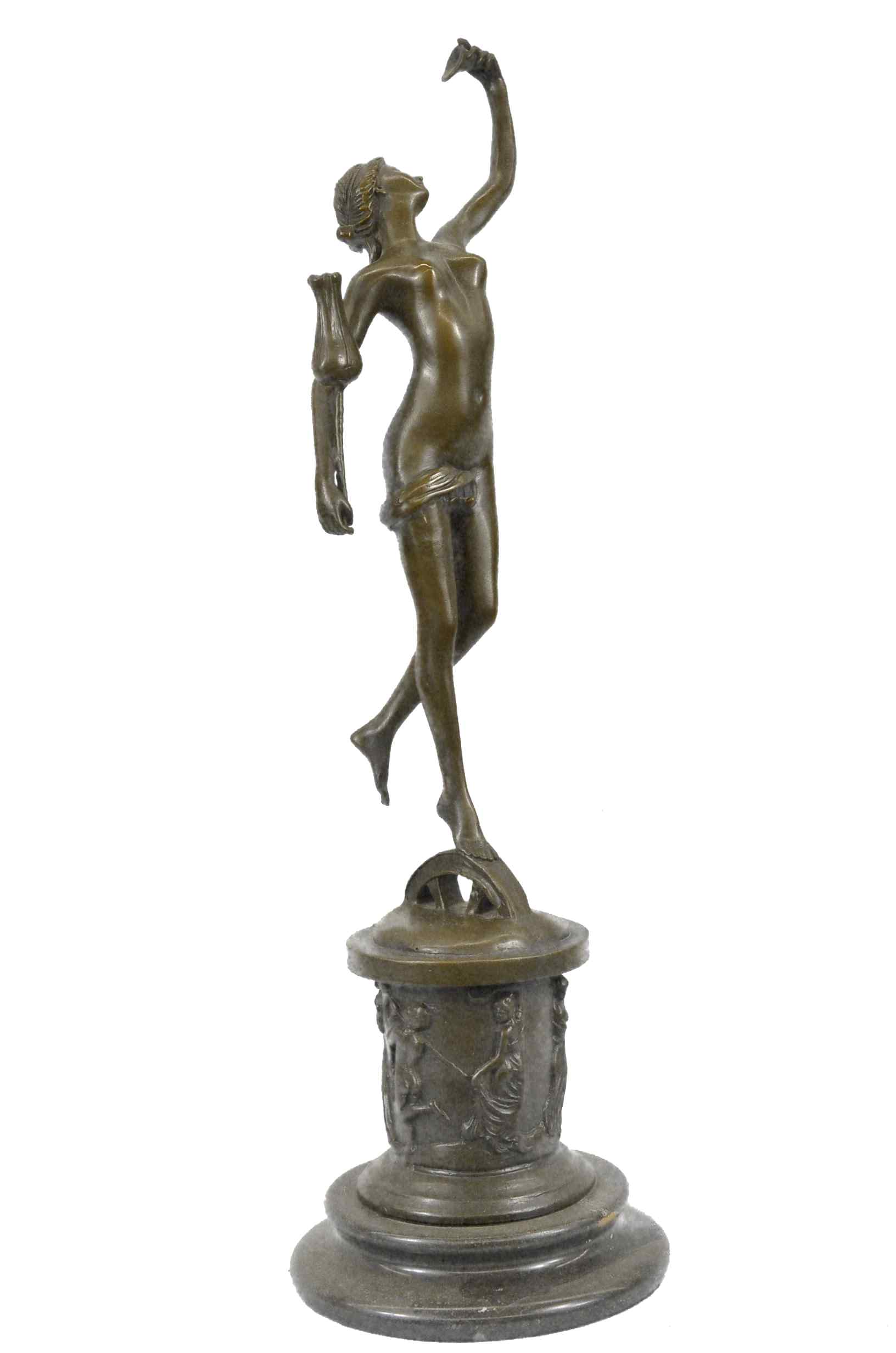 She dances among the flowers. She floats on the tips of her toes. She plucks a petal from a large blossoming flower. Her slender elegant body stretches. A silk cloth covers her partially nude body. She tilts her head back and shut her eyes, as she feels the soft wind on her skin. Along the round base she stands on you can see dancing maidens and gents. 100% bronze and handmade, this sculpture was cast using the "Lost Wax Method" and mounted on a marble base and is signed by artist Milo.Original or Reproduction: Original
