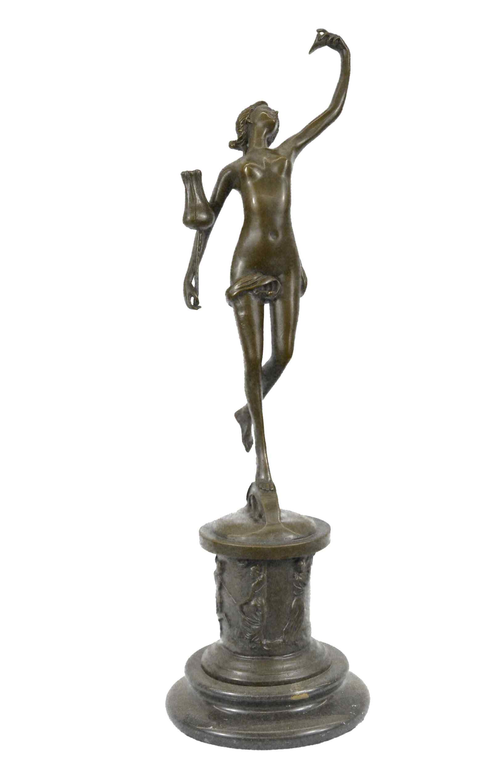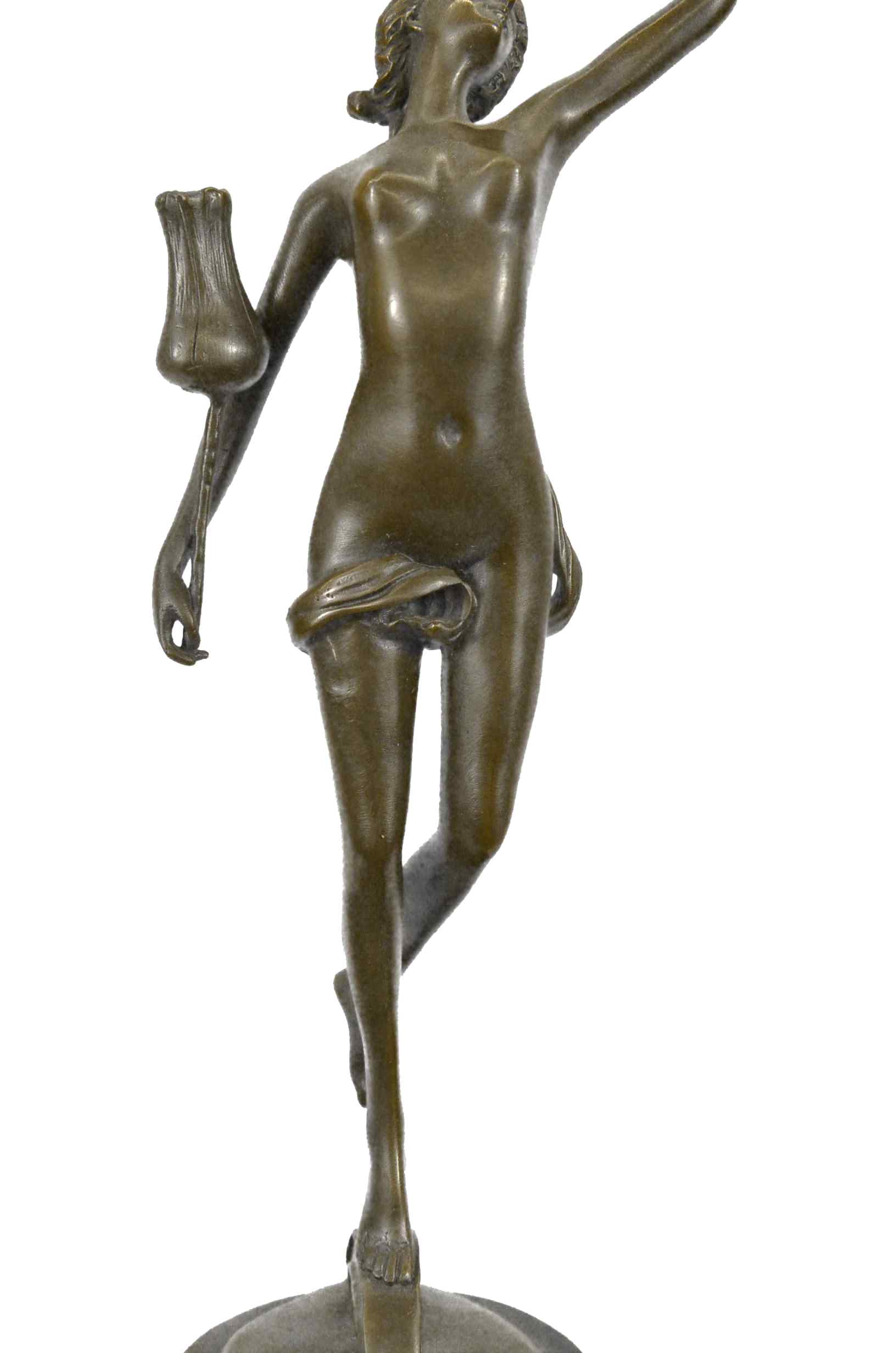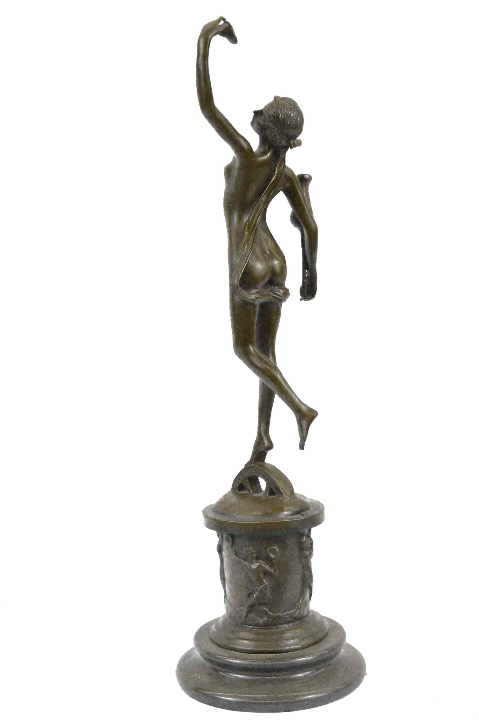 She dances among the flowers. She floats on the tips of her toes. She plucks a petal from a large blossoming flower. Her slender elegant body stretches. A silk cloth covers her partially nude body. She tilts her head back and shut her eyes, as she feels the soft wind on her skin. Along the round base she stands on you can see dancing maidens and gents. 100% bronze and handmade, this sculpture was cast using the "Lost Wax Method" and mounted on a marble base and is signed by artist Milo.Original or Reproduction: Original