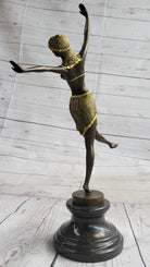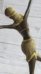 Her attire, featuring a matching beaded bra top and headdress, adds to the allure and spectacle of her performance. This nimble dancer is meticulously rendered with a brown patina and accented with gold, which enhances the sculpture's visual richness. Mounted on a marble base, this bronze masterpiece not only elevates its aesthetic appeal but also ensures its stability. Crafted with the renowned "Lost Wax Method," this sculpture captures the intricacies of her pose and the fluidity of her movements. It is 100% bronze, meticulously handcrafted, and proudly bears the signature of the artist Mirval, reaffirming its quality.
