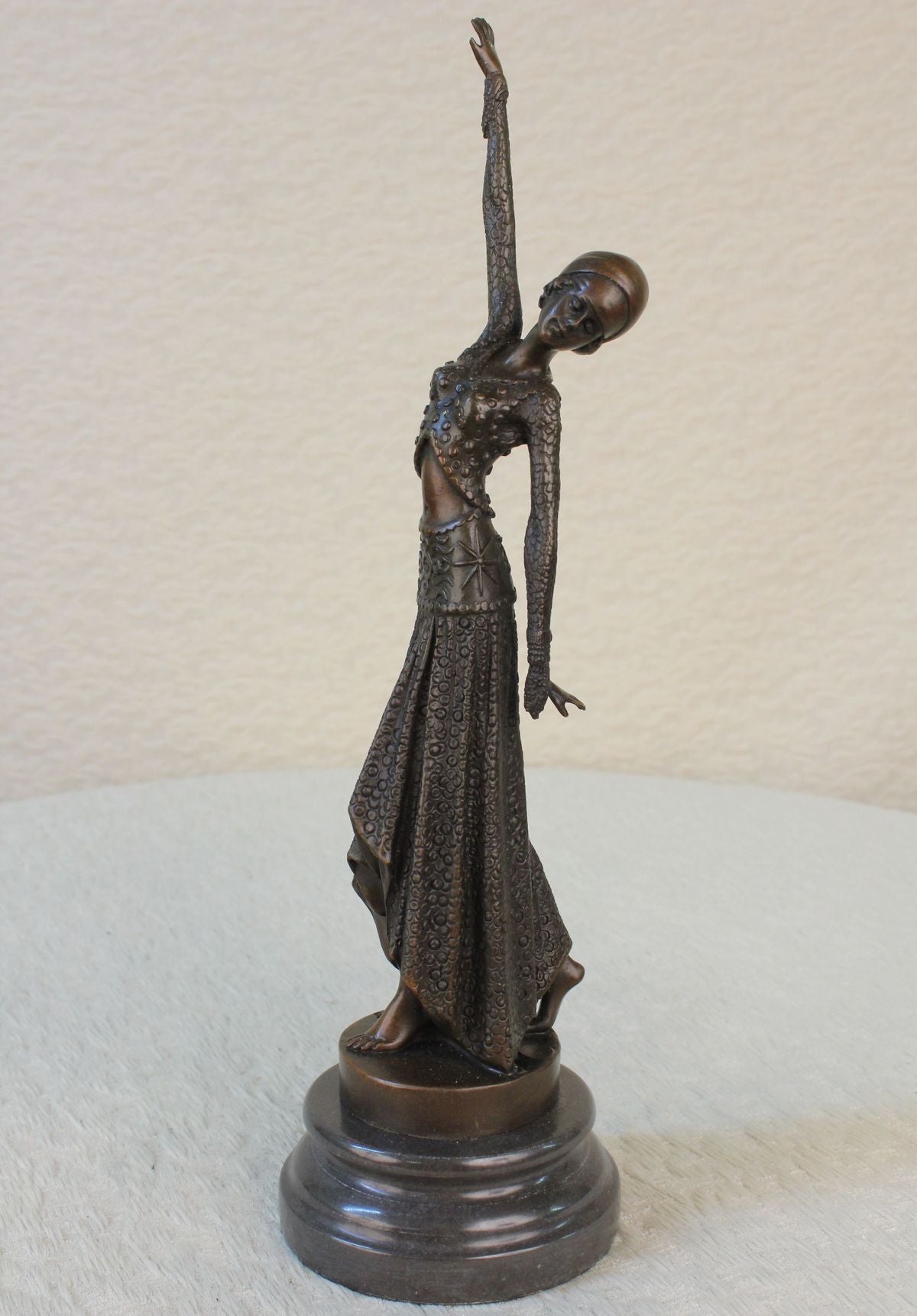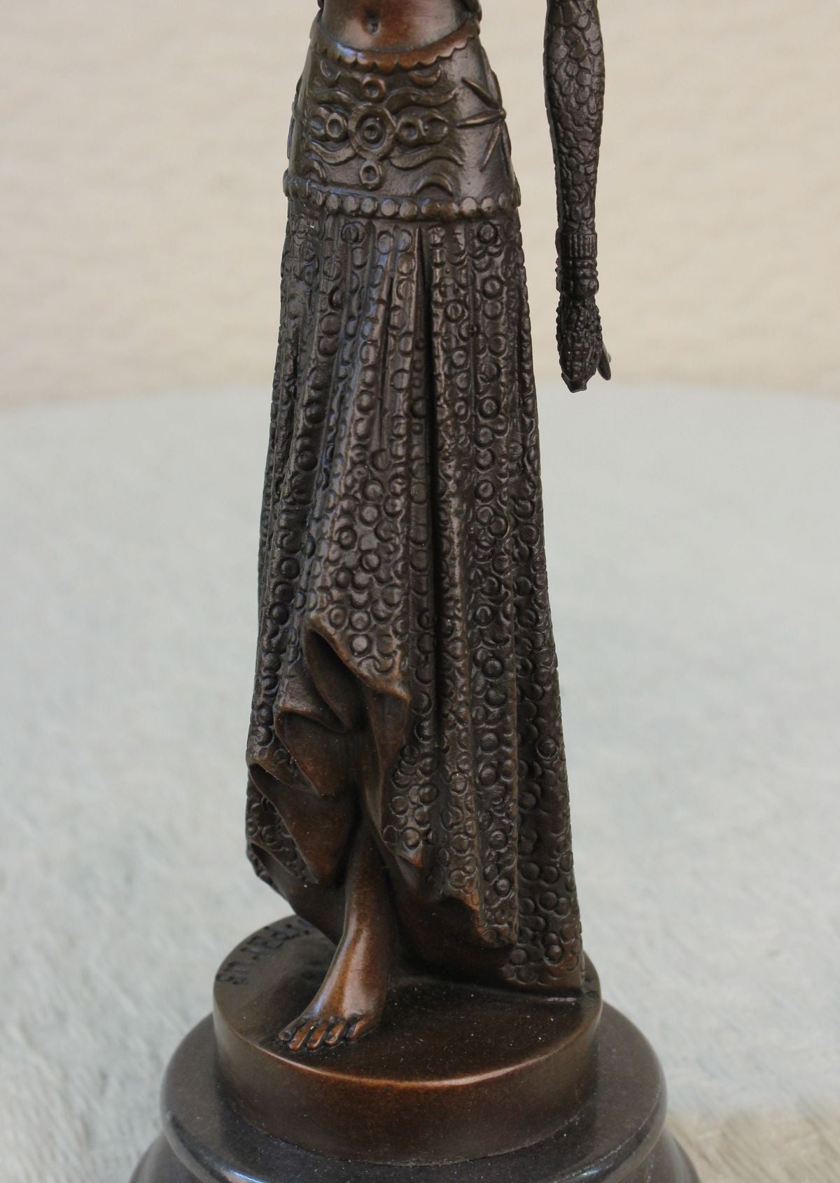 The belly dancer is light on her feet and fluid with her waistline. She stretches one arm high above her head and tilts to the side, draping her other hand along her thigh. She dances on the tips of her bare toes and floats across the dance floor. She wears a two-piece dress. Her cropped top exposes her small midriff and her long skirt cascades down to the floor. She wears a wrapped scarf around her short hair. This gorgeous Gypsy performs her classic belly dance, letting strangers fall in love with the sight of her. Her curvaceous body is astounding and her outfit shows it off beautifully. 100% bronze and handmade, this brown patina sculpture was cast using the "Lost Wax Method" and mounted on a marble base and is signed Chiparus.Bronze Dimensions with Marble Base:Height 14" x Width 4"