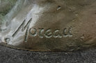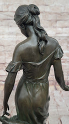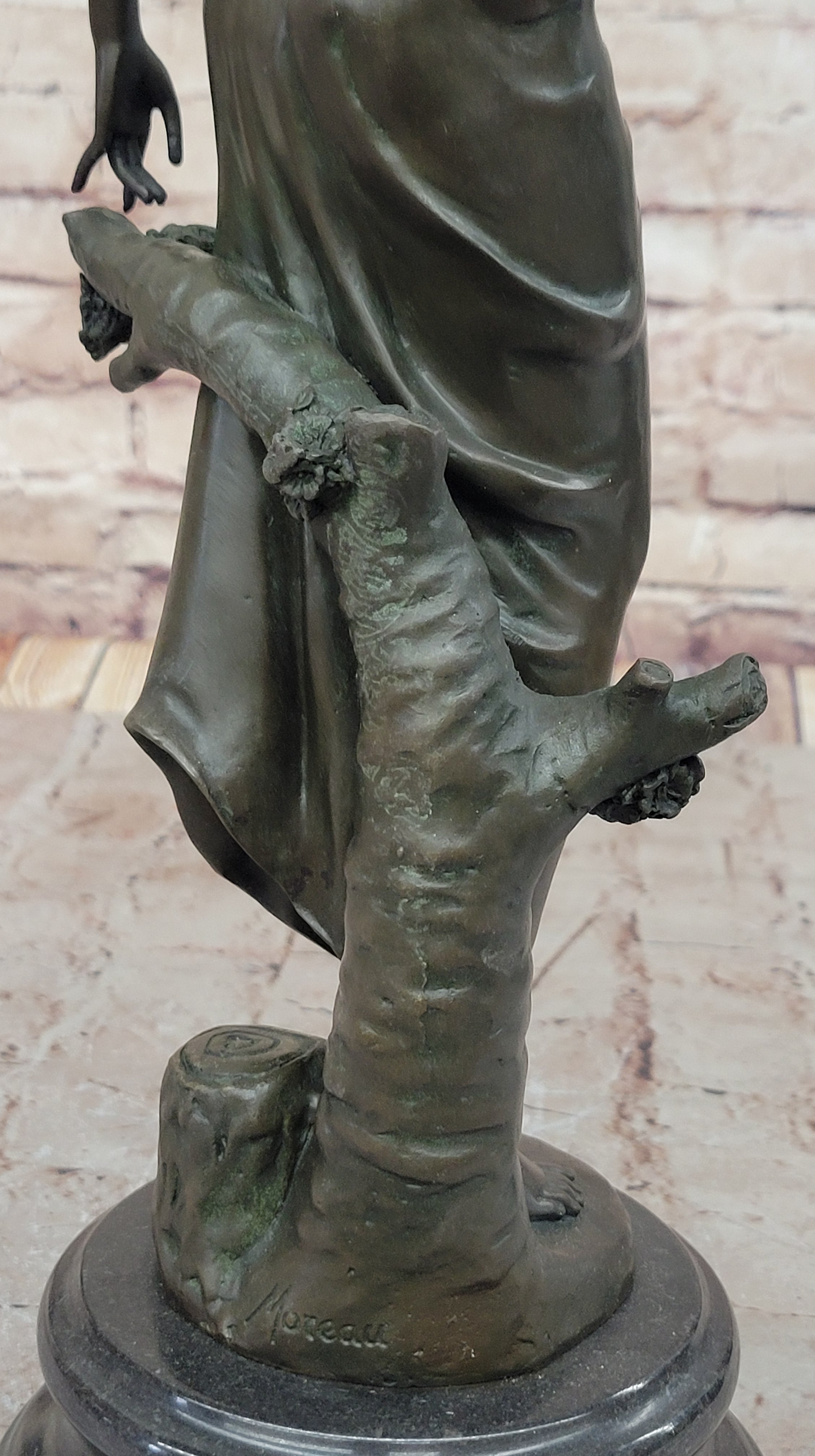 The sculpture captures the simplicity and grace of a young woman dressed in a long, loose-fitted dress that exudes comfort and elegance. The garment subtly highlights her feminine figure, cinching at the waist and featuring a high slit that reveals her leg. In her hands, she holds a long stem brimming with fruit, symbolizing abundance and natural beauty. Her face radiates a pleased expression, adding a sense of serenity to the piece. Crafted using the traditional "Lost Wax Method," this sculpture showcases remarkable detail and craftsmanship. The gentle folds of the dress, the texture of the fruit-laden stem, and the natural flow of her posture demonstrate the artist’s mastery in bringing life to bronze. The warm, earthy tones of the patina add depth to the sculpture, enhancing its timeless appeal. Resting on a polished black marble base, this elegant piece is signed by the renowned artist Moreau, further emphasizing its authenticity and artistic value. Perfect for collectors or as a centerpiece in any space, this sculpture celebrates the beauty of simplicity and the harmonious connection between humanity and nature.