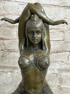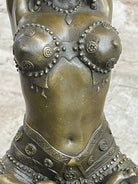 This captivating bronze sculpture encapsulates the spirit of the Art Deco era with exquisite finesse. The graceful dancer, adorned in an intricately detailed costume, exudes an air of enchantment as she sits in a contemplative, Indian-style posture. Her arms gracefully curve behind her head, perfectly synchronized with her enigmatic gaze directed towards the beholder.