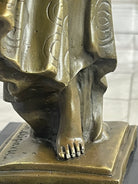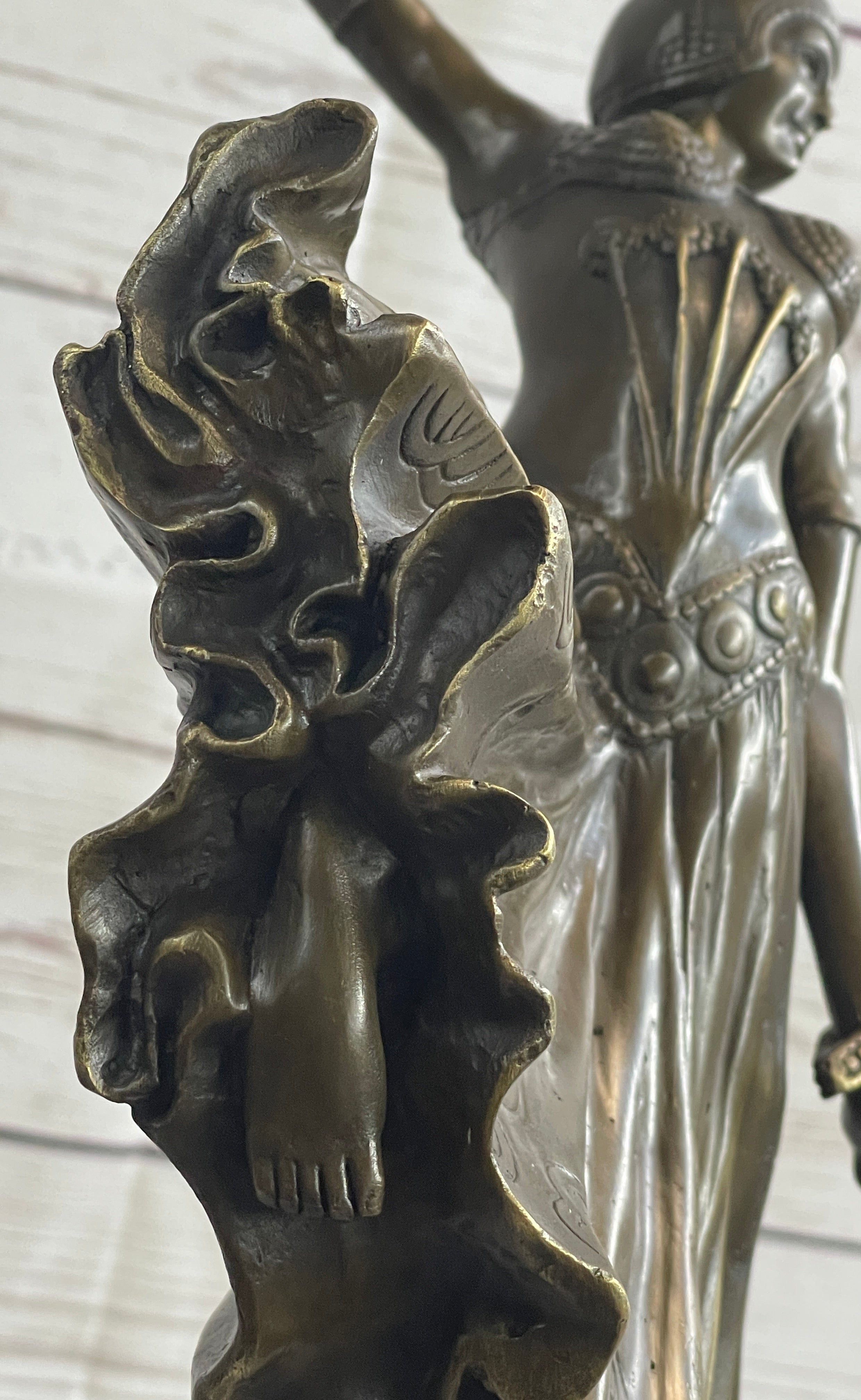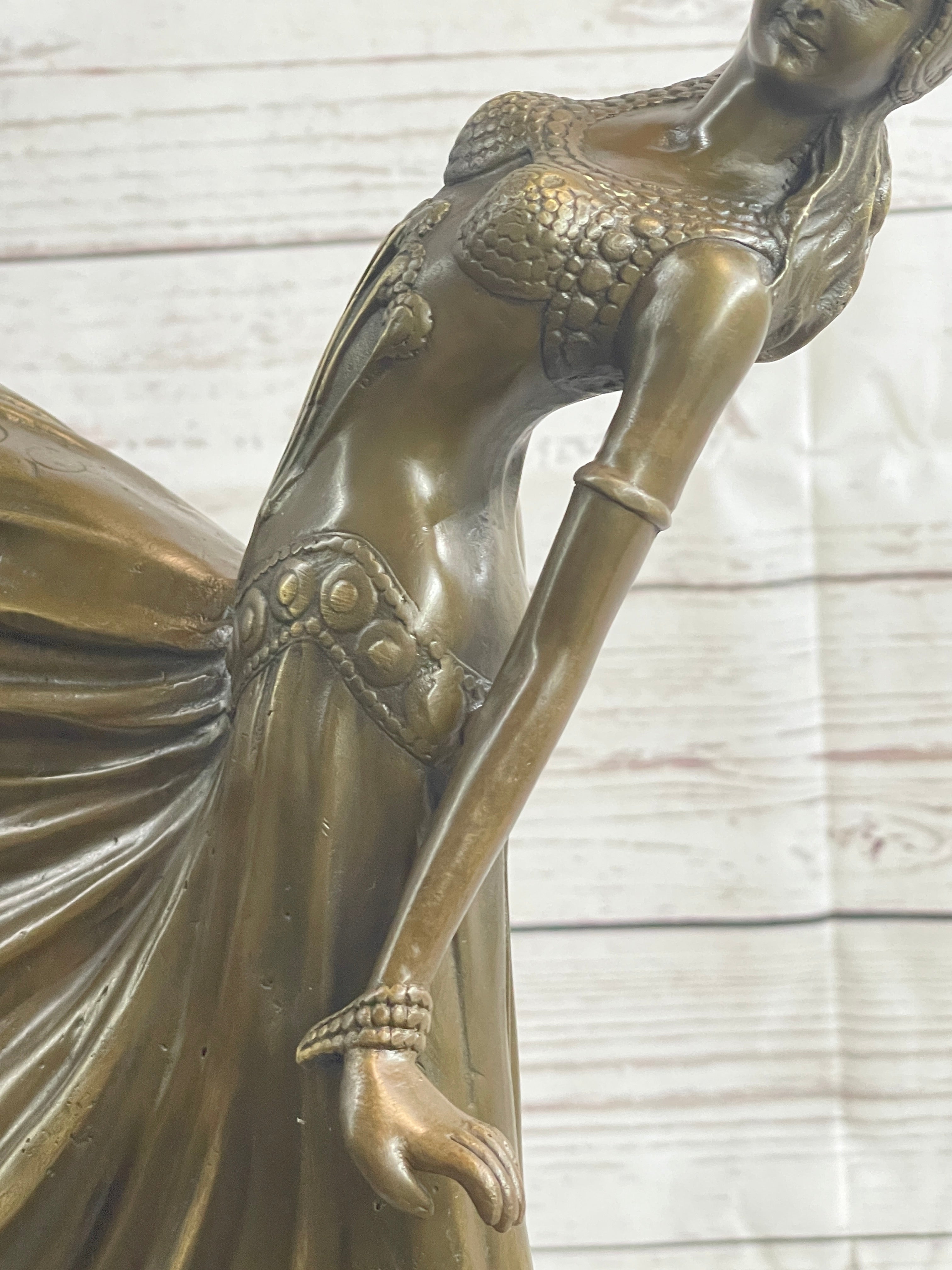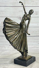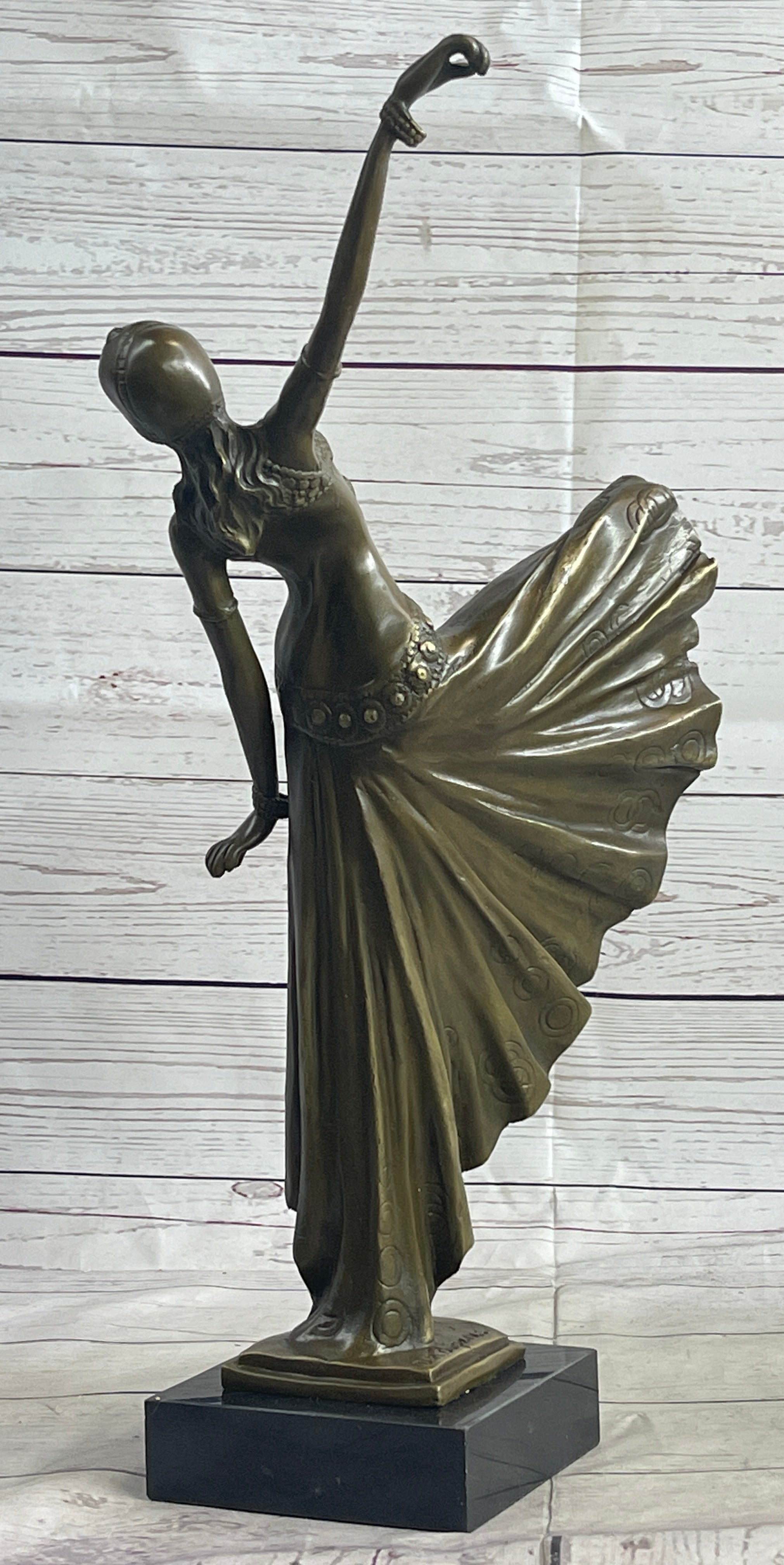 Every intricate detail of this handmade bronze sculpture has been meticulously crafted using the ancient technique of lost-wax casting. The artist's dedication to capturing the essence of movement is evident in the intricate folds of the woman's flowing dress, which fans out before her, creating a mesmerizing visual display. The subtle jingle of the beads on her costume adds an auditory element, enhancing the immersive experience.