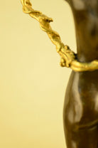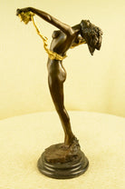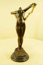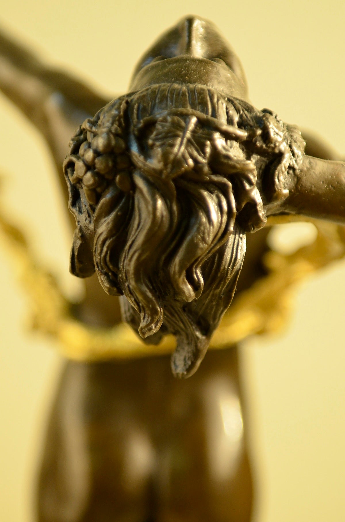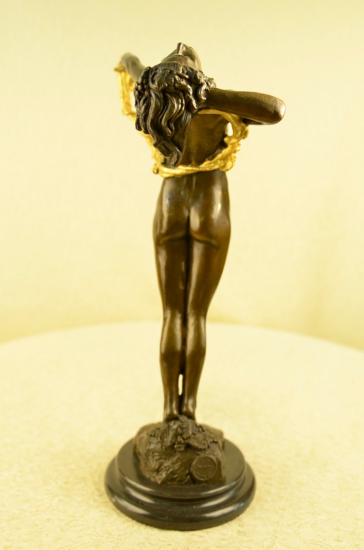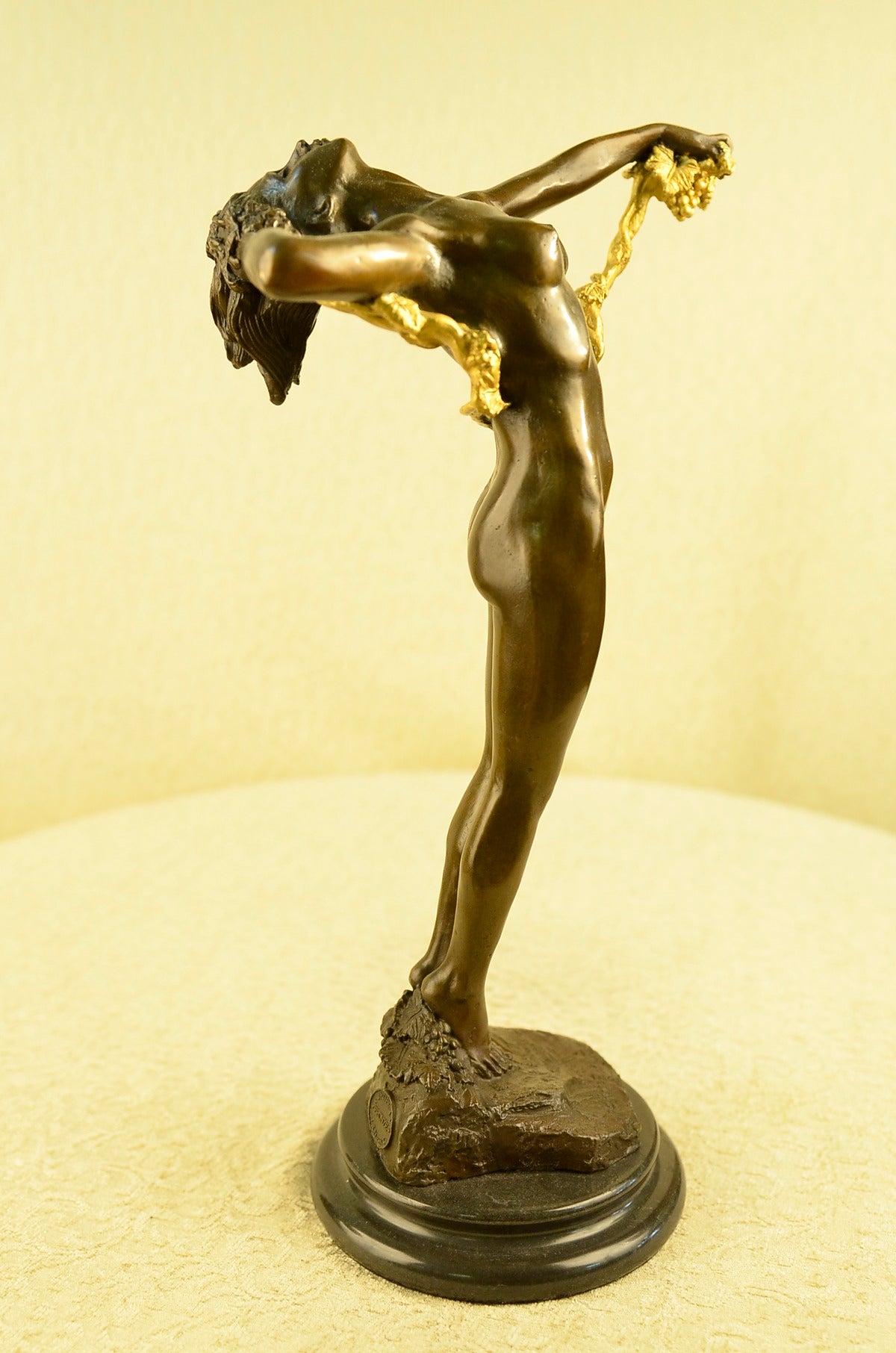 She swings her head back in ecstasy while holding a long gold vine along her body from hand to hand. The gold colored vine & grapes makes this already stunning sculpture of a nude woman extra eye-catching. Her physical beauty is consistent with the beauty of the craftsmanship. It was crafted using the lost wax method. This sculpture rests atop a black marble base. It signed Harriet.Bronze Dimensions with Marble Base:Height 16" x Width 9"