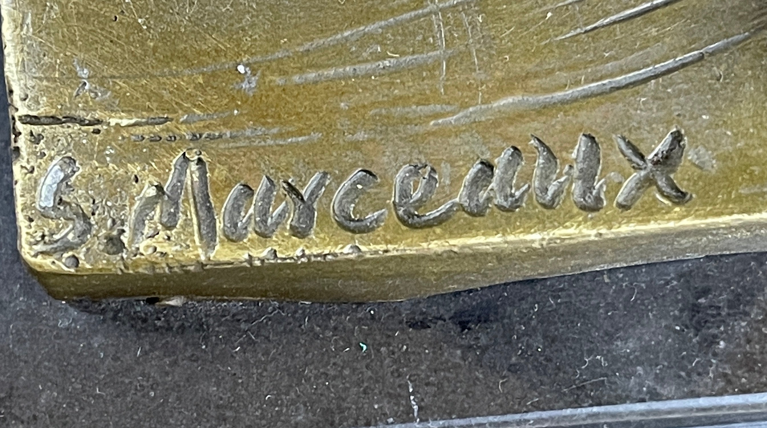 This exquisite sculpture is signed "S. Marceaux," confirming its quality and linking it to the renowned French artist. The combination of the Harlequin's graceful stance, the luxurious patina, and the elegant marble base makes this piece a stunning example of 19th-century French bronze sculpture. Whether displayed in a home, office, or gallery, this work of art is sure to captivate viewers and serve as a testament to the timeless beauty of Saint-Marceaux's creations.Bronze Dimensions with Marble Base: Height 17" X Width 7"
