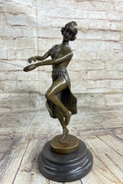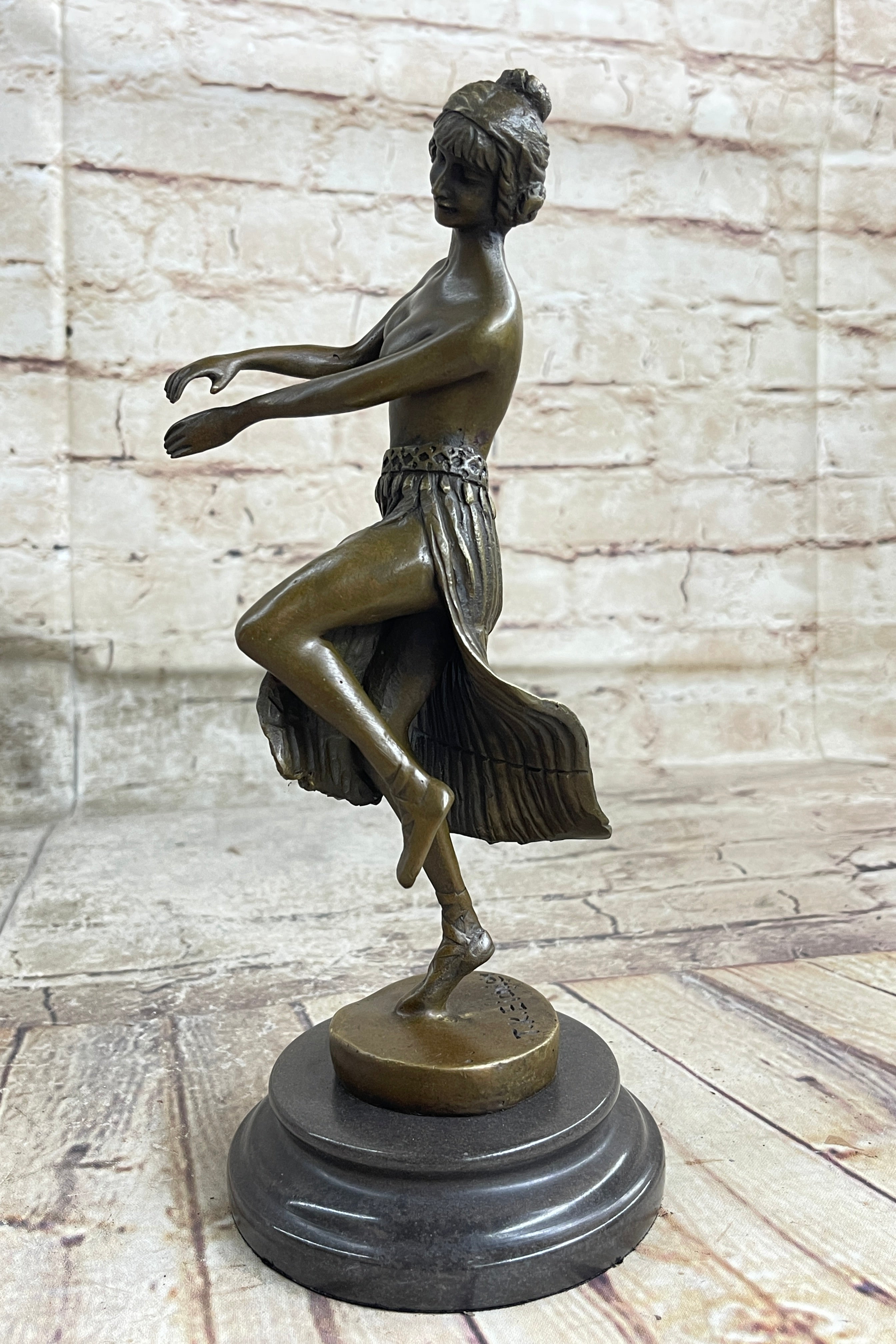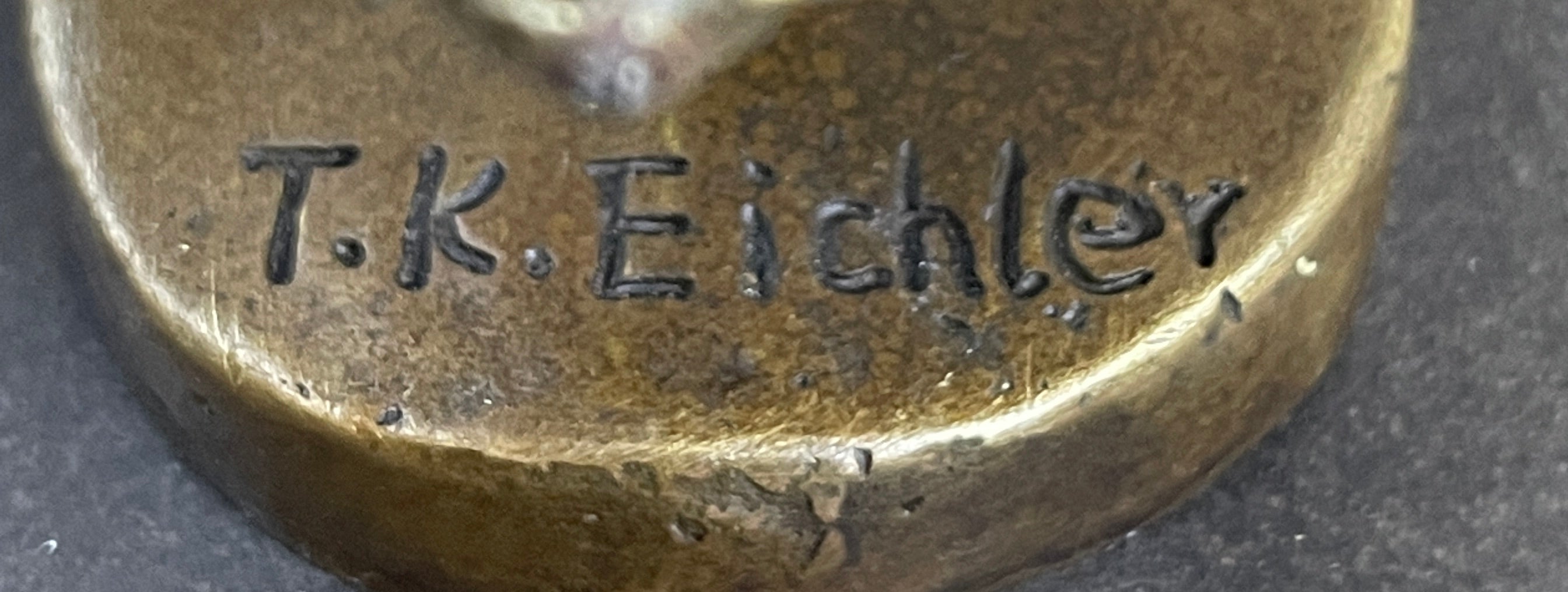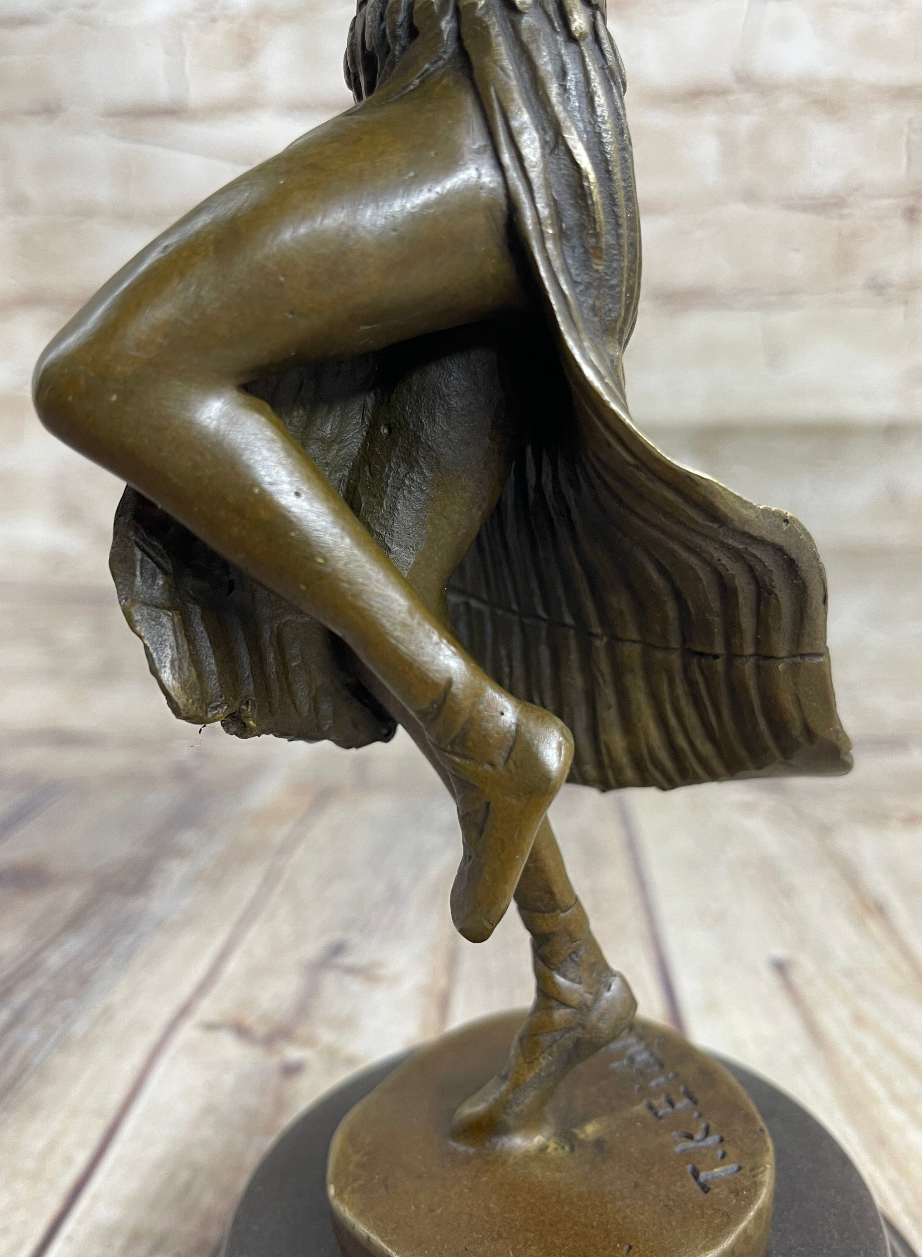 Feeling of motion and excitement conveyed by dancer`s Costome, gesture and facial expression. Smooth quality chasing of figure. Eichler also modeled porcelain dancers for Meissen. This 100% bronze sculpture was crafted using the lost wax method. It is set on a black marble base. It is signed T.K Eichler.Bronze Dimensions with Marble Base: Height 10" x Width 4"