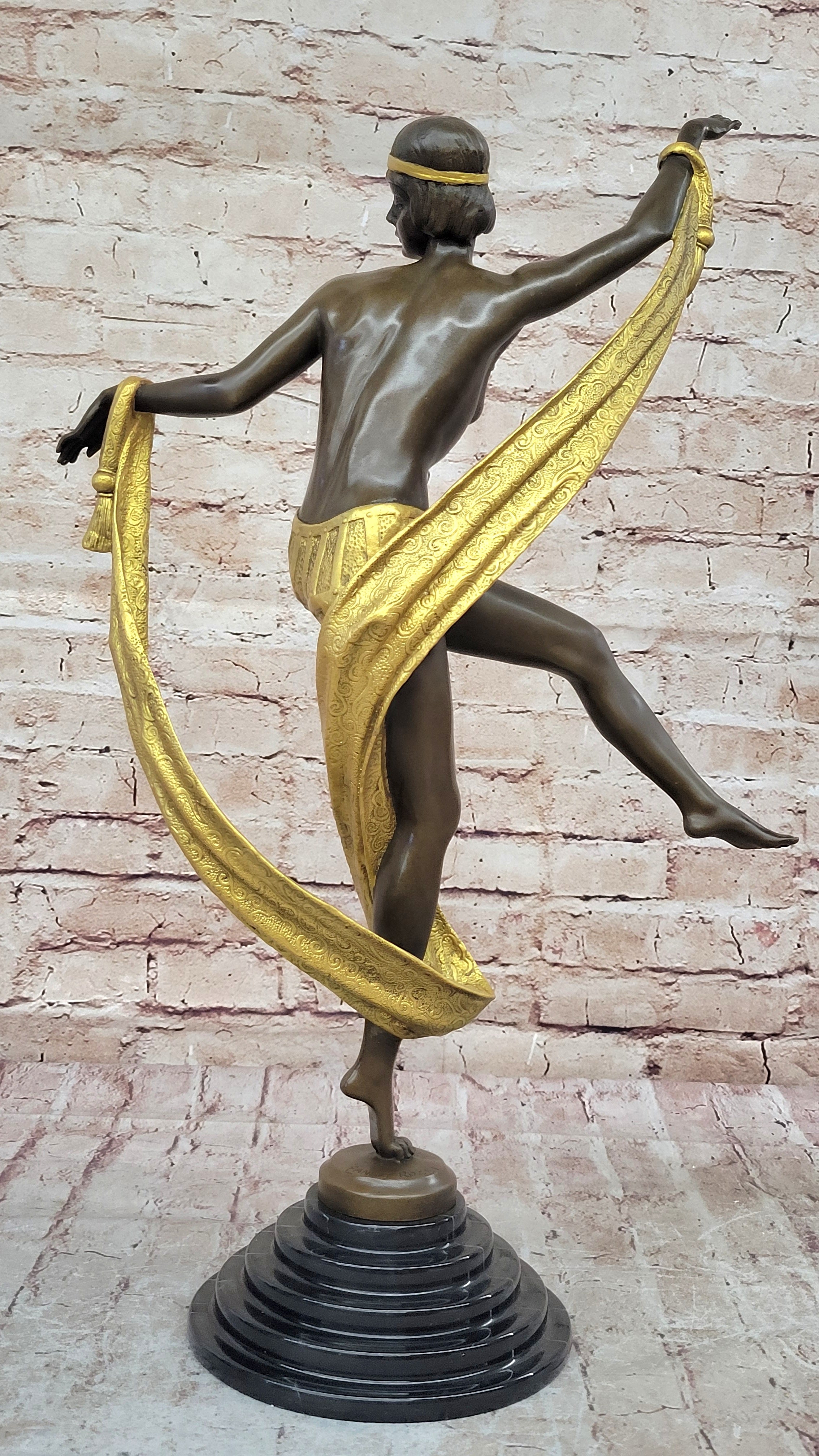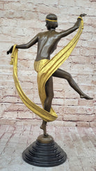 Using the time-honored lost wax method, this sculpture is a testament to the artist's attention to detail and dedication to craftsmanship. The bronze sculpture is accentuated with a rich brown patina finish, enhancing its depth and highlighting the intricate details of the dancer's figure. A touch of gold color adds a luxurious accent, further elevating the Art Deco aesthetic.