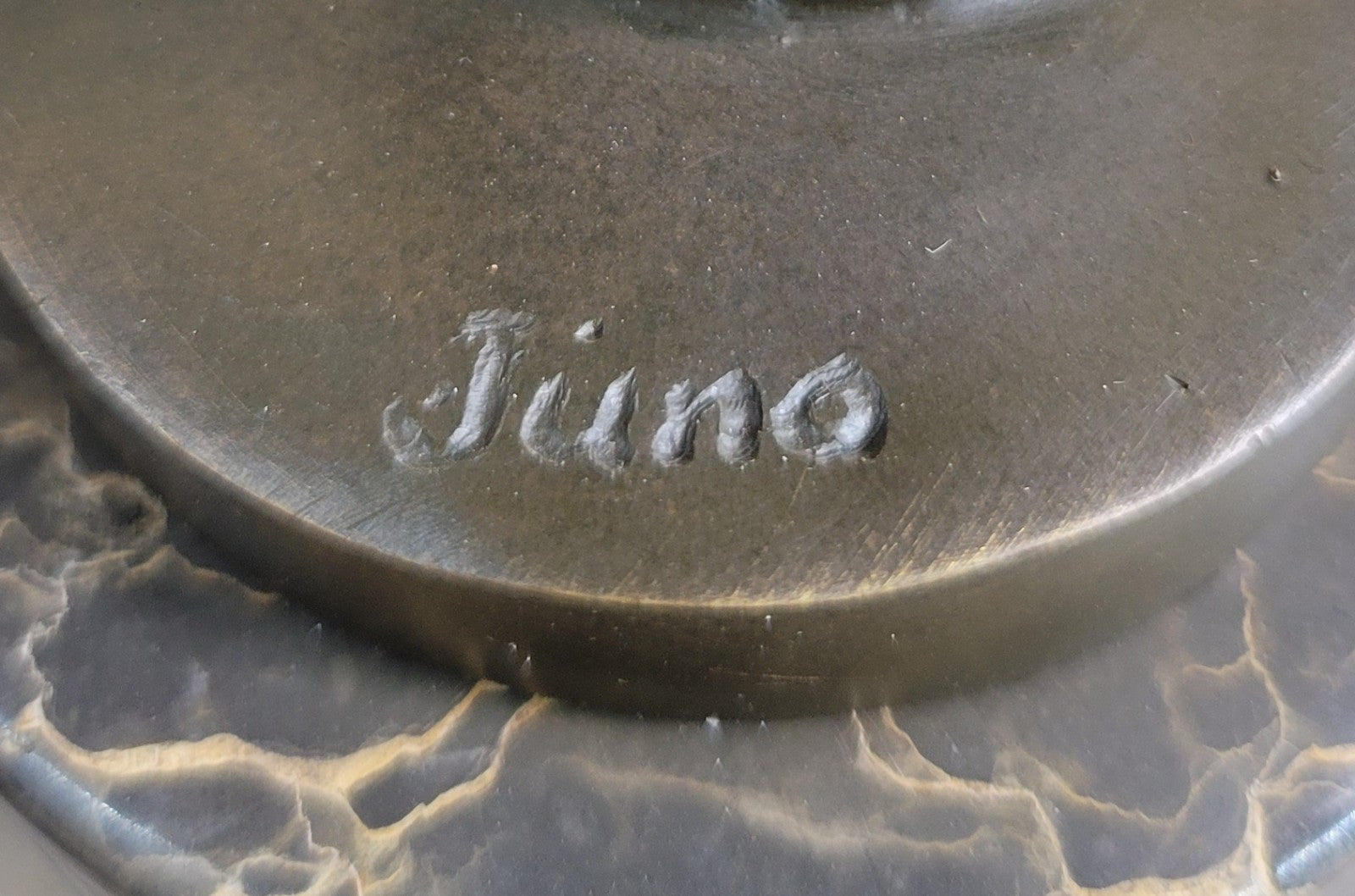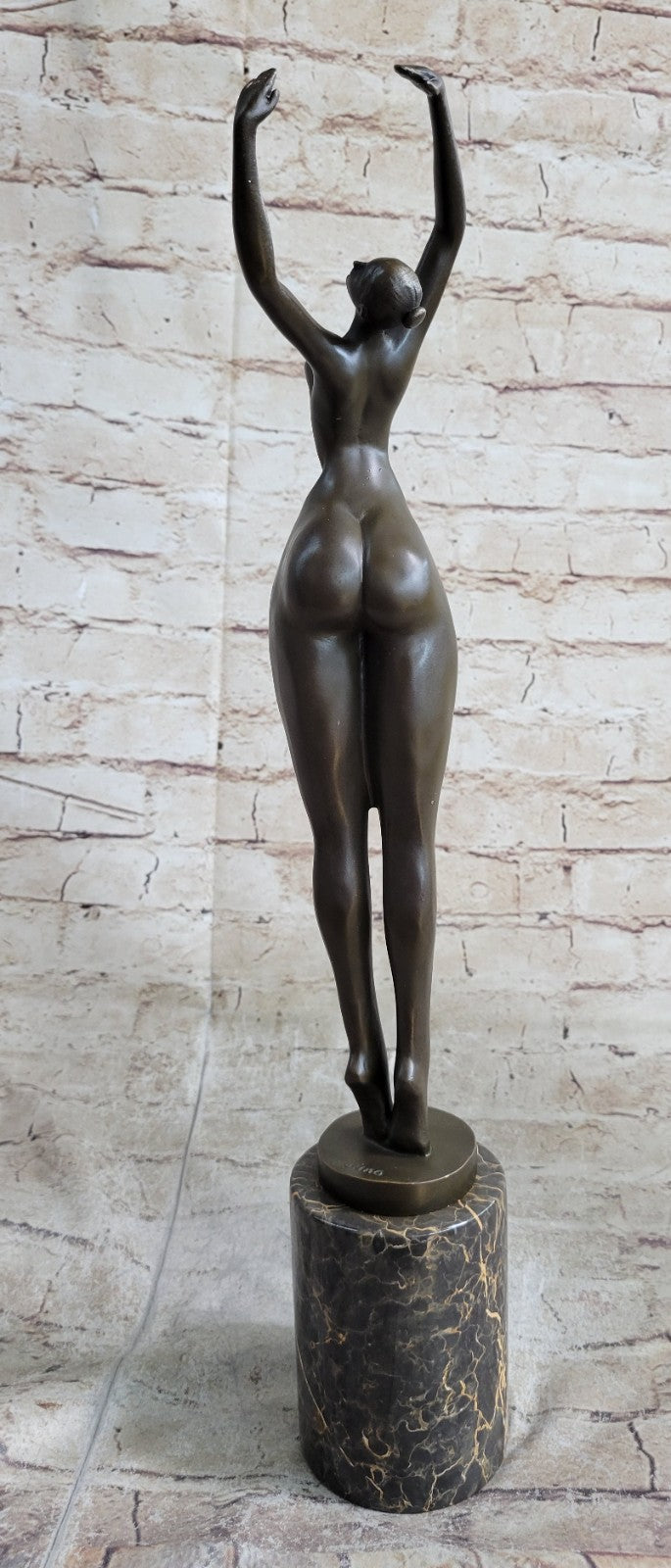 Reminiscent of classic pin-up artistry, the subject exudes confidence as she pushes her chest forward, creating a visually striking silhouette. The detailed craftsmanship is evident in the 100% handmade creation, crafted with precision and care. The sculpture, adorned with a rich brown patina, stands as a testament to the mastery of the "Lost Wax Method," ensuring authenticity and quality. Mounted on a marble base, this unique artwork bears the signature of the artist Juno.