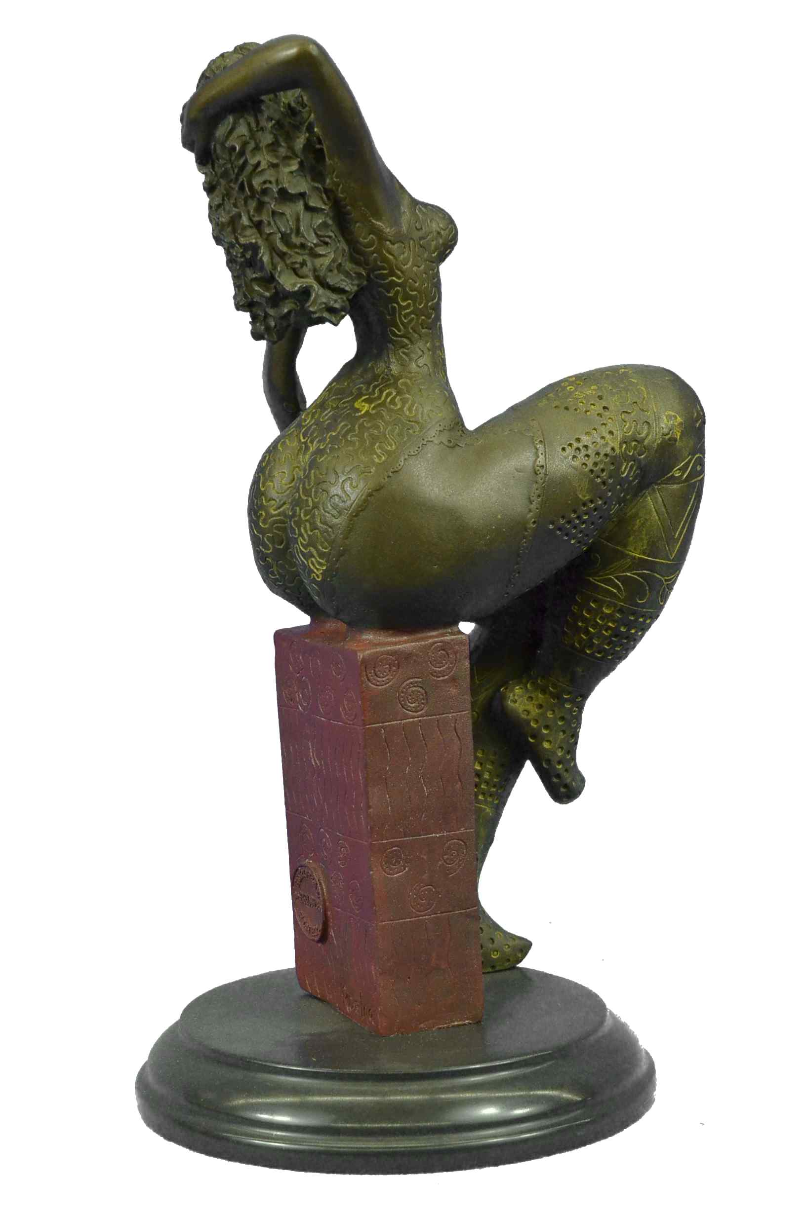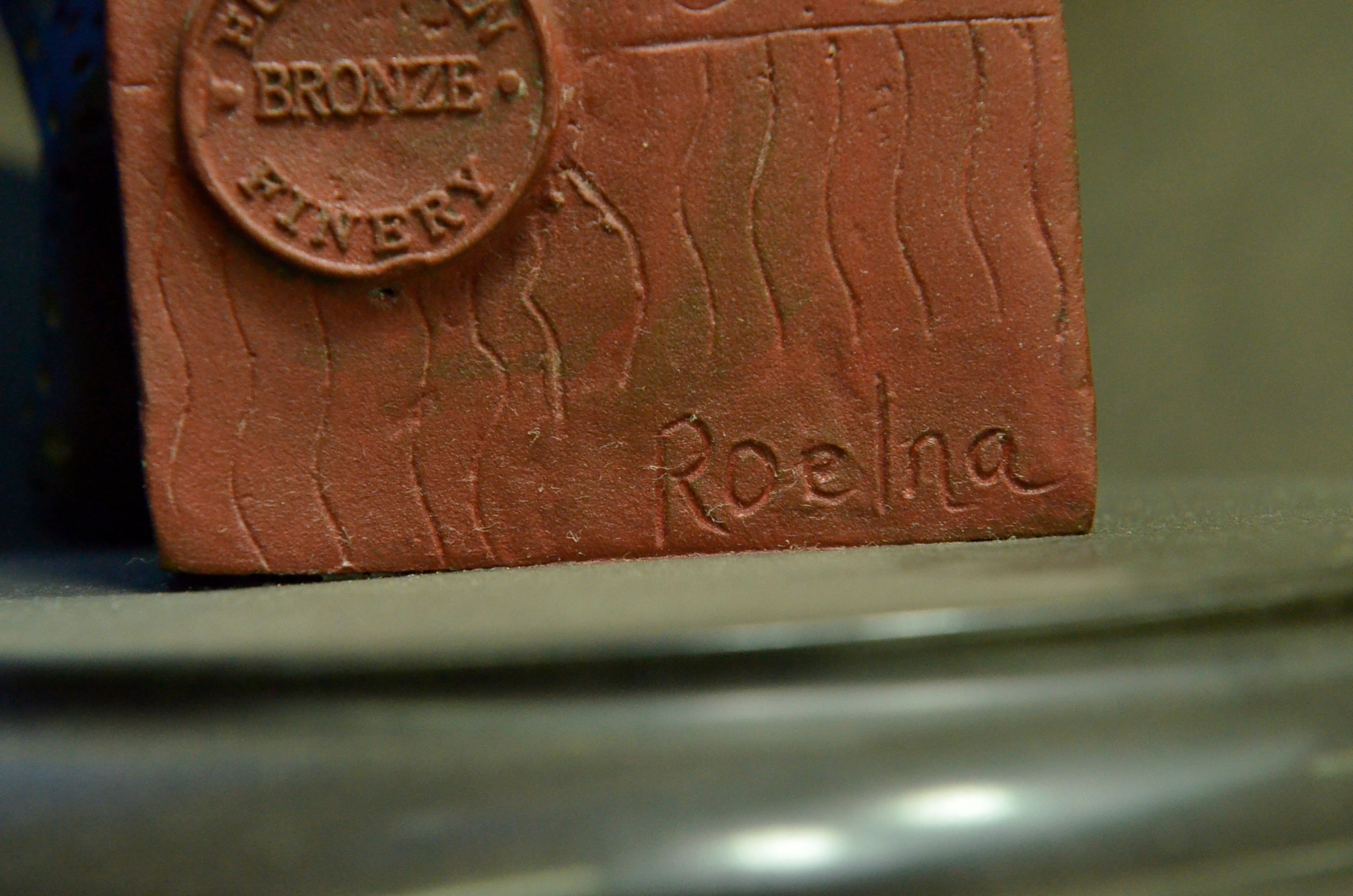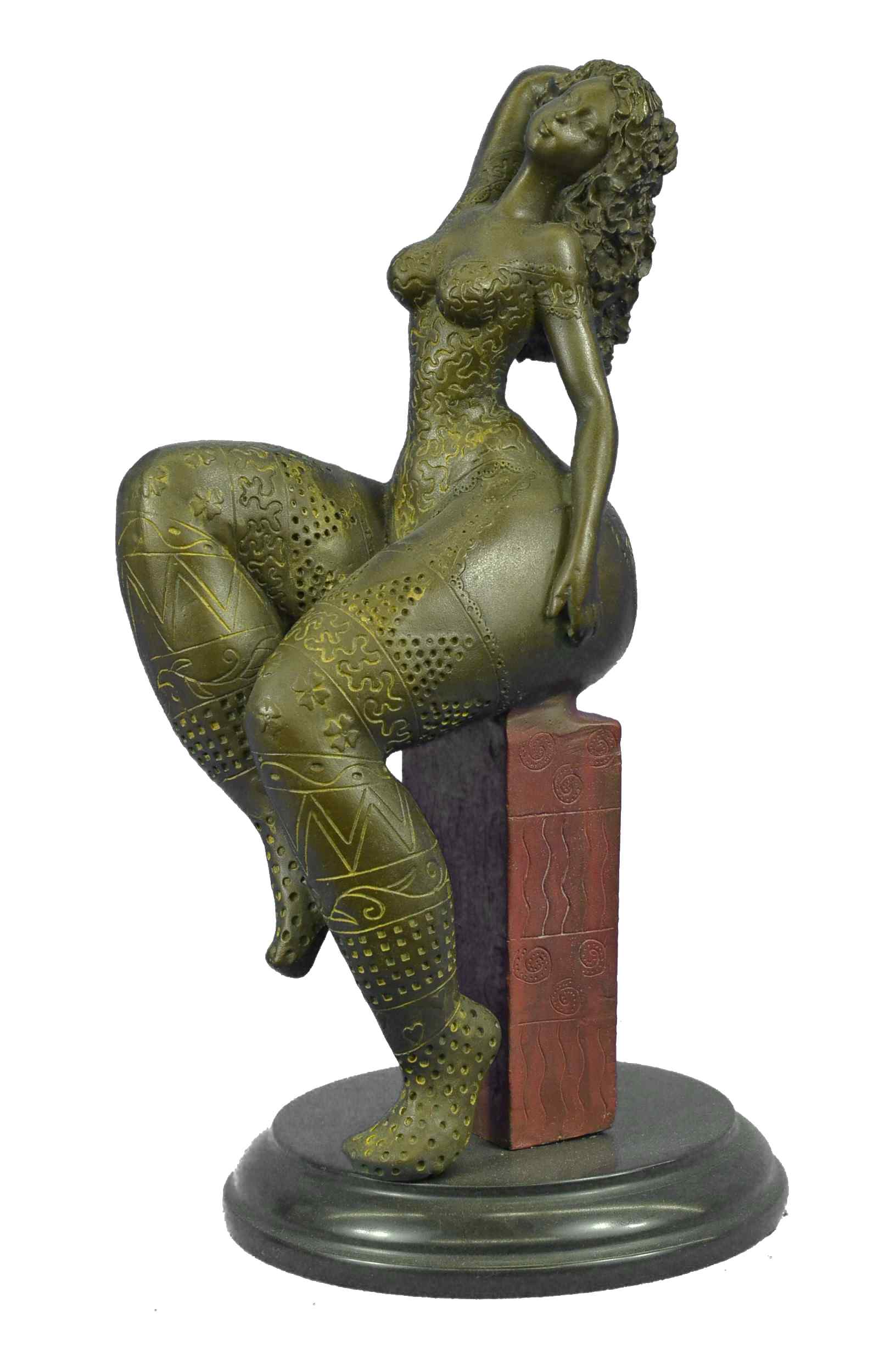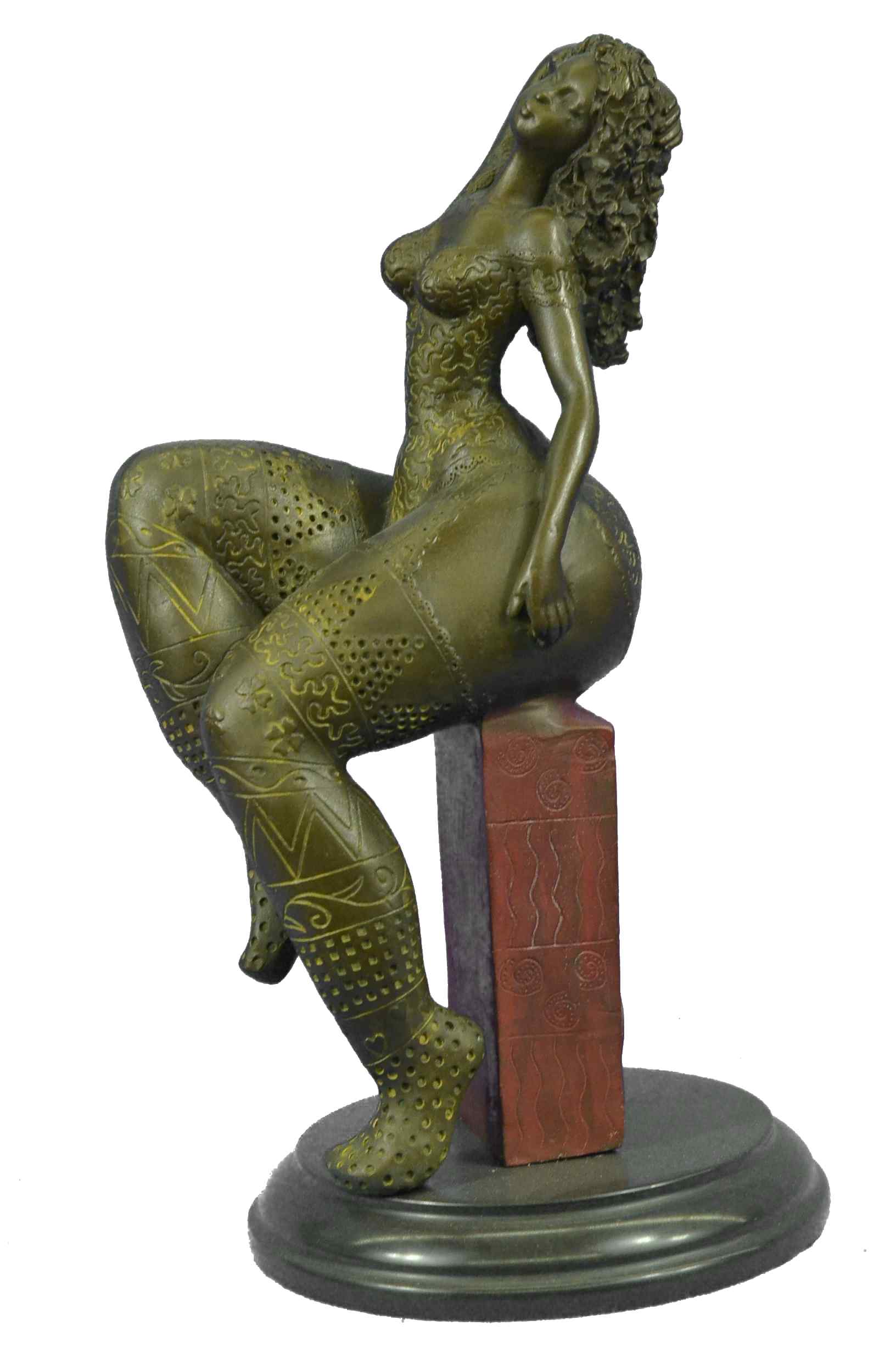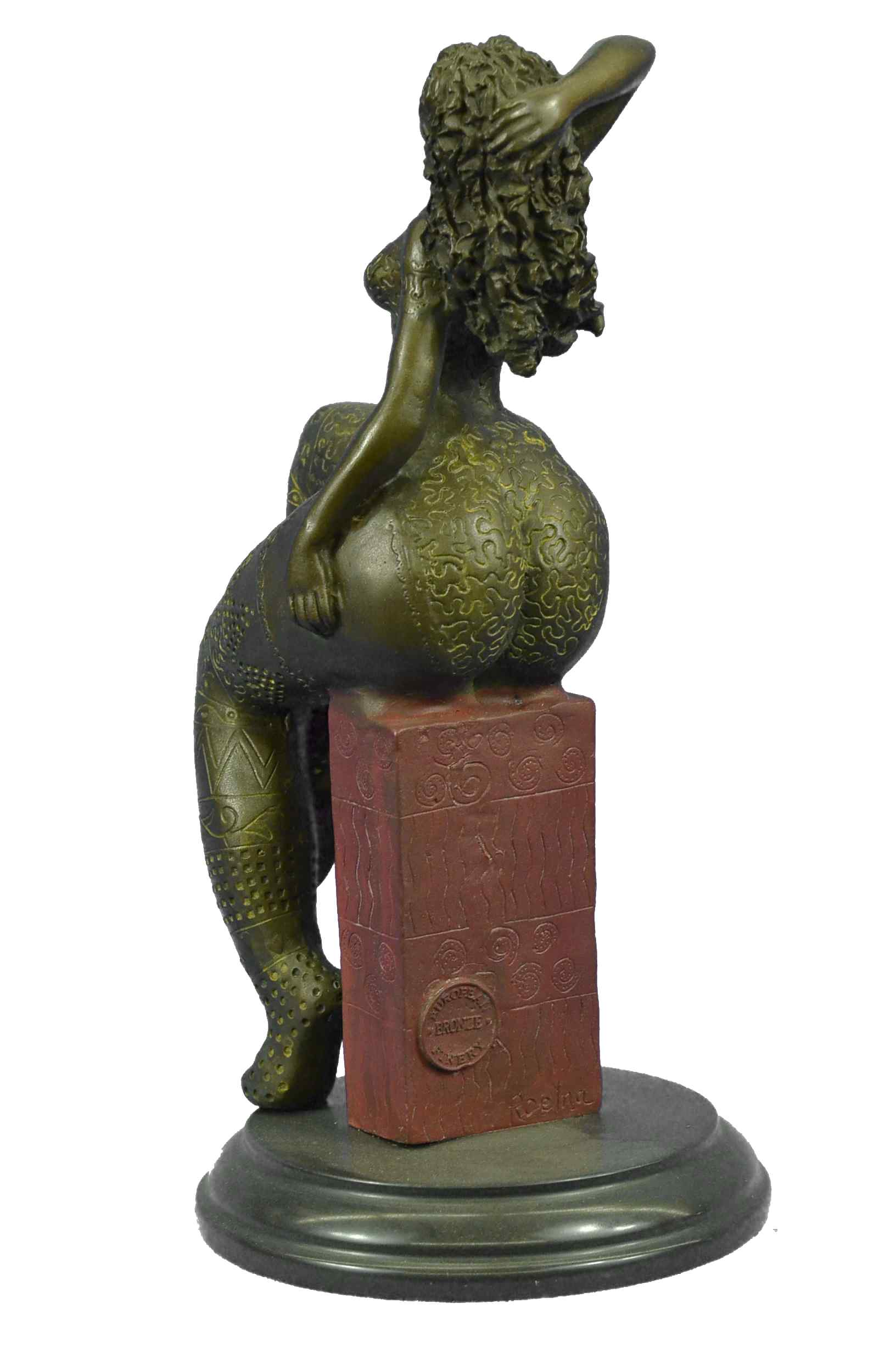 The curvy Lady Dancer is ready to make her next audition in her bikini customs. The composition recalls the Classical sense yet adopts a modern abstract flair that gives her body an added emphasis on her curvaceousness a tribute to Botero. She seems to coyly look up as if blushing due to the gushing admiration she gets from the beholder witnessing her body. The bronze sculpture was captured using the ancient method of lost-wax casting and finished with a brown patina stain for preservation. She is mounted upon a black marble base with the artist Roelna`s signature.Original or Reproduction: Original