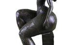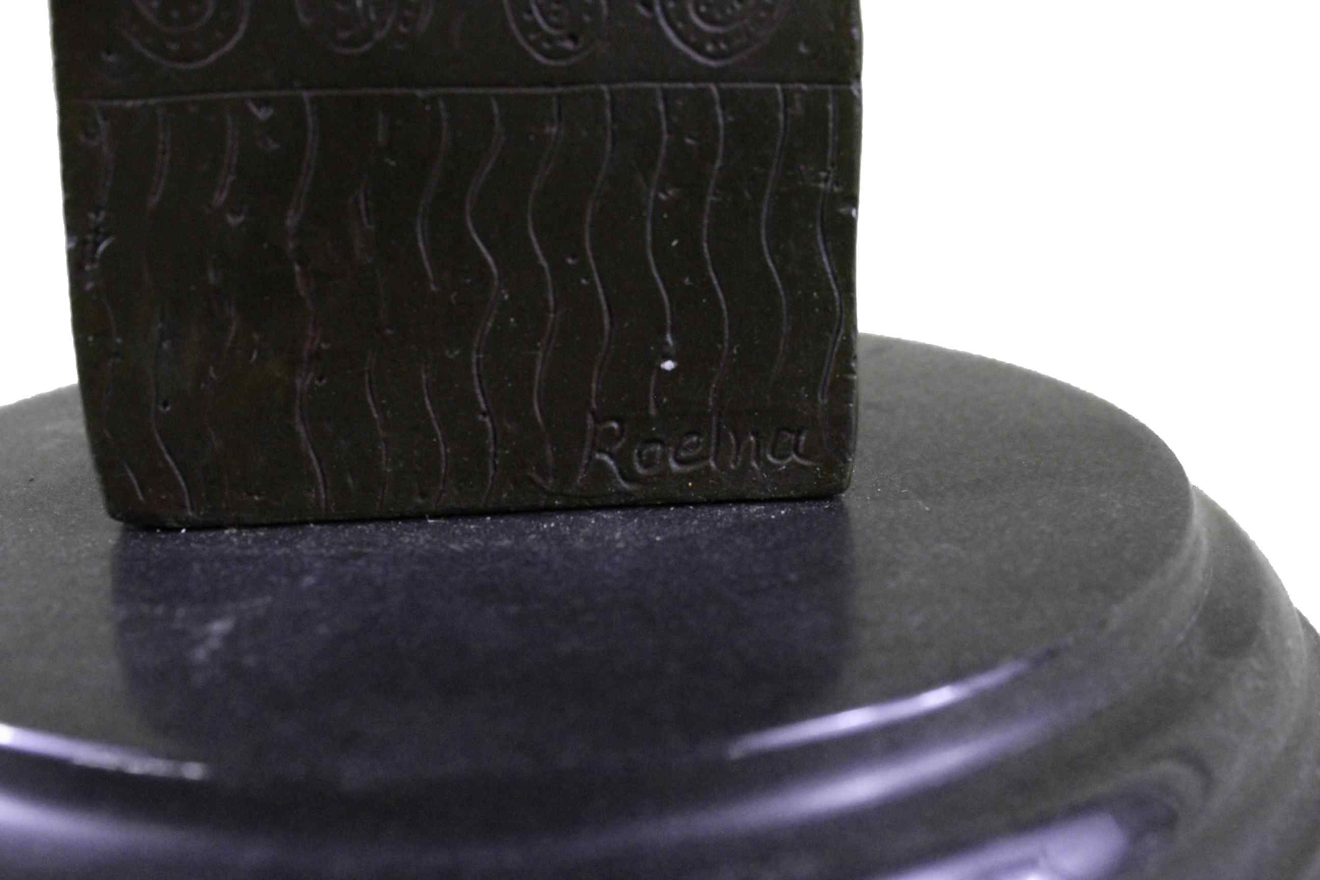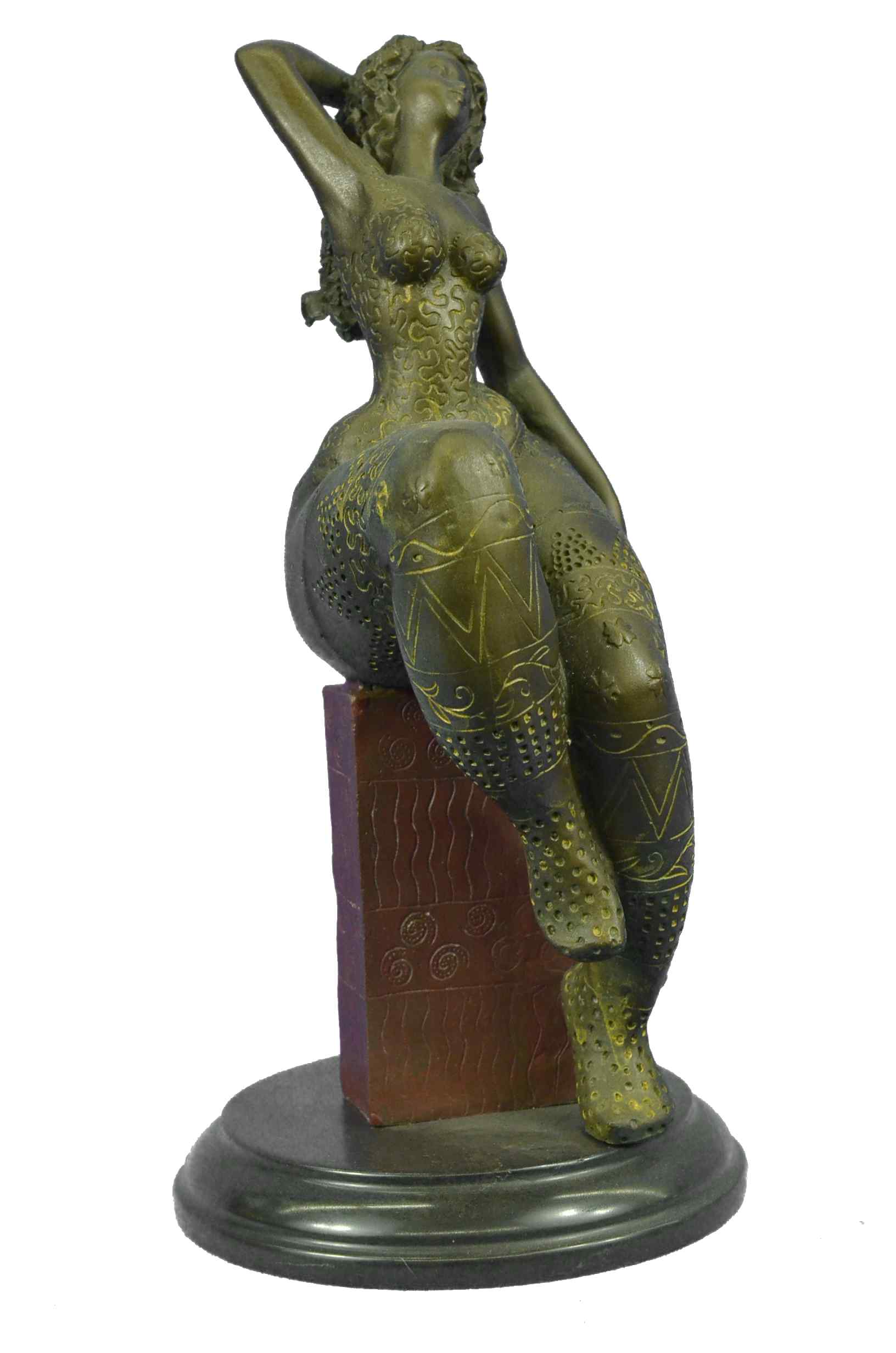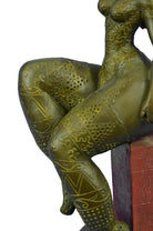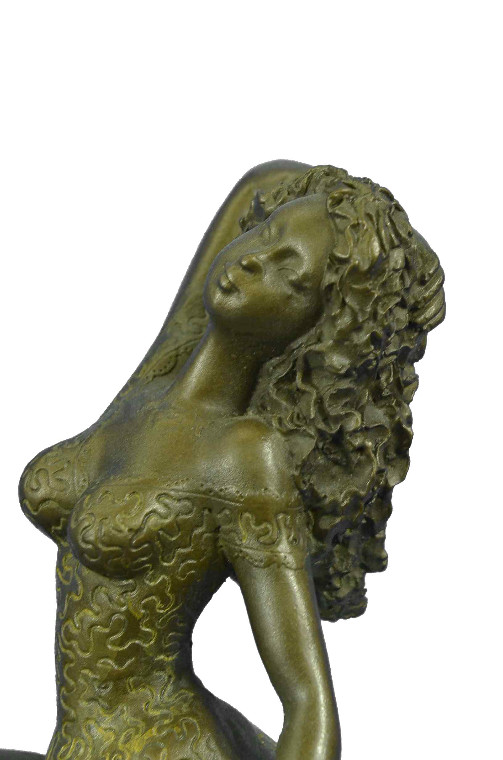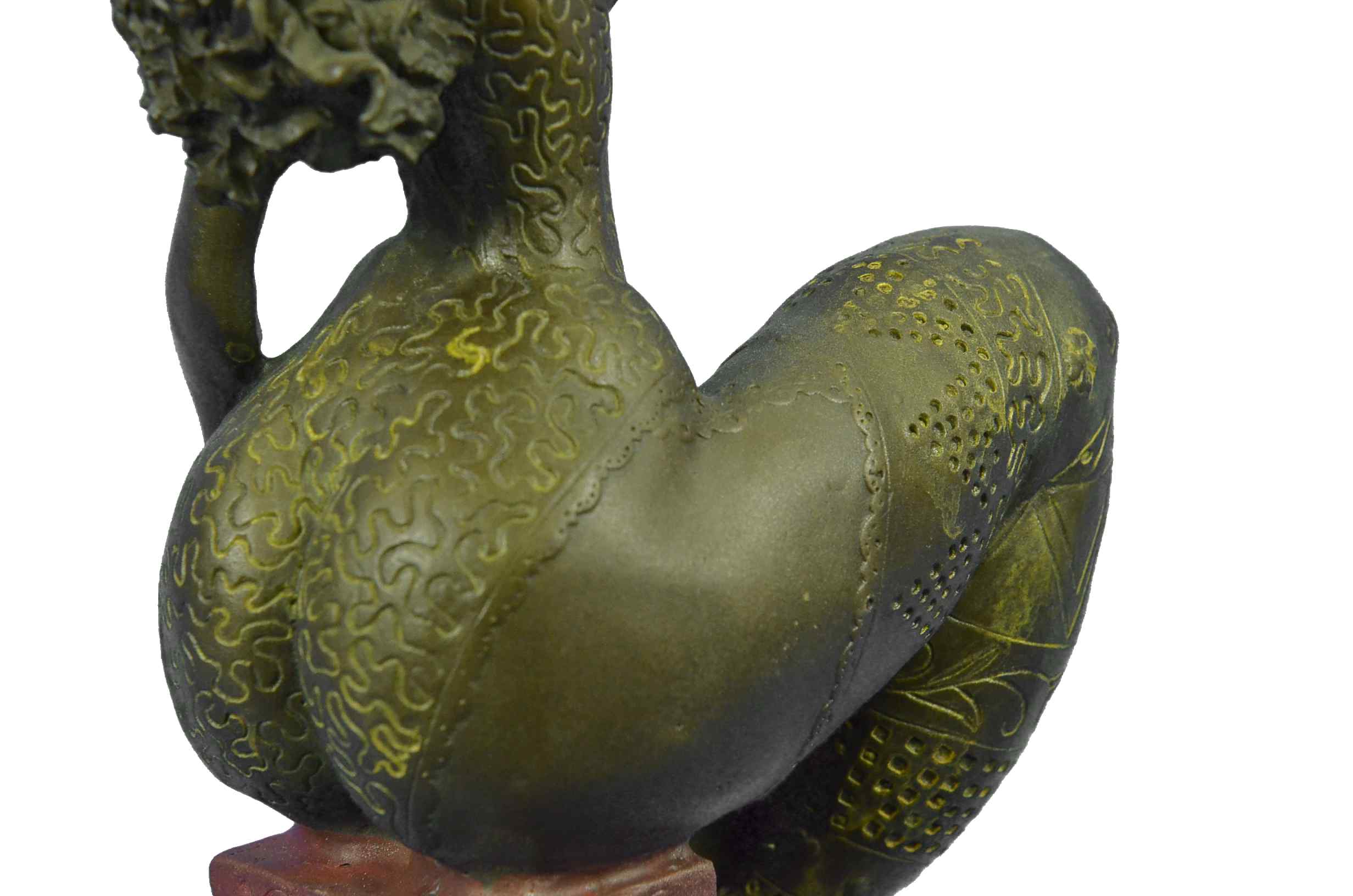 The curvy Lady Dancer is ready to make her next audition in her bikini customs. The composition recalls the Classical sense yet adopts a modern abstract flair that gives her body an added emphasis on her curvaceousness a tribute to Botero. She seems to coyly look up as if blushing due to the gushing admiration she gets from the beholder witnessing her body. The bronze sculpture was captured using the ancient method of lost-wax casting and finished with a brown patina stain for preservation. She is mounted upon a black marble base with the artist Roelna`s signature.Original or Reproduction: Original