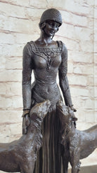 Immerse yourself in a scene of elegance and grace with this stunning bronze sculpture depicting two Afghan hunting hounds greeting their beautiful owner in the twilight of the night. The sculpture captures the perfect symmetry of the hounds as they approach their owner with adoring eyes. The intricate details of the owner's dress, embellished with beads and sequins, shimmer and reflect the hues of the setting sun, adding an enchanting touch to the sculpture.