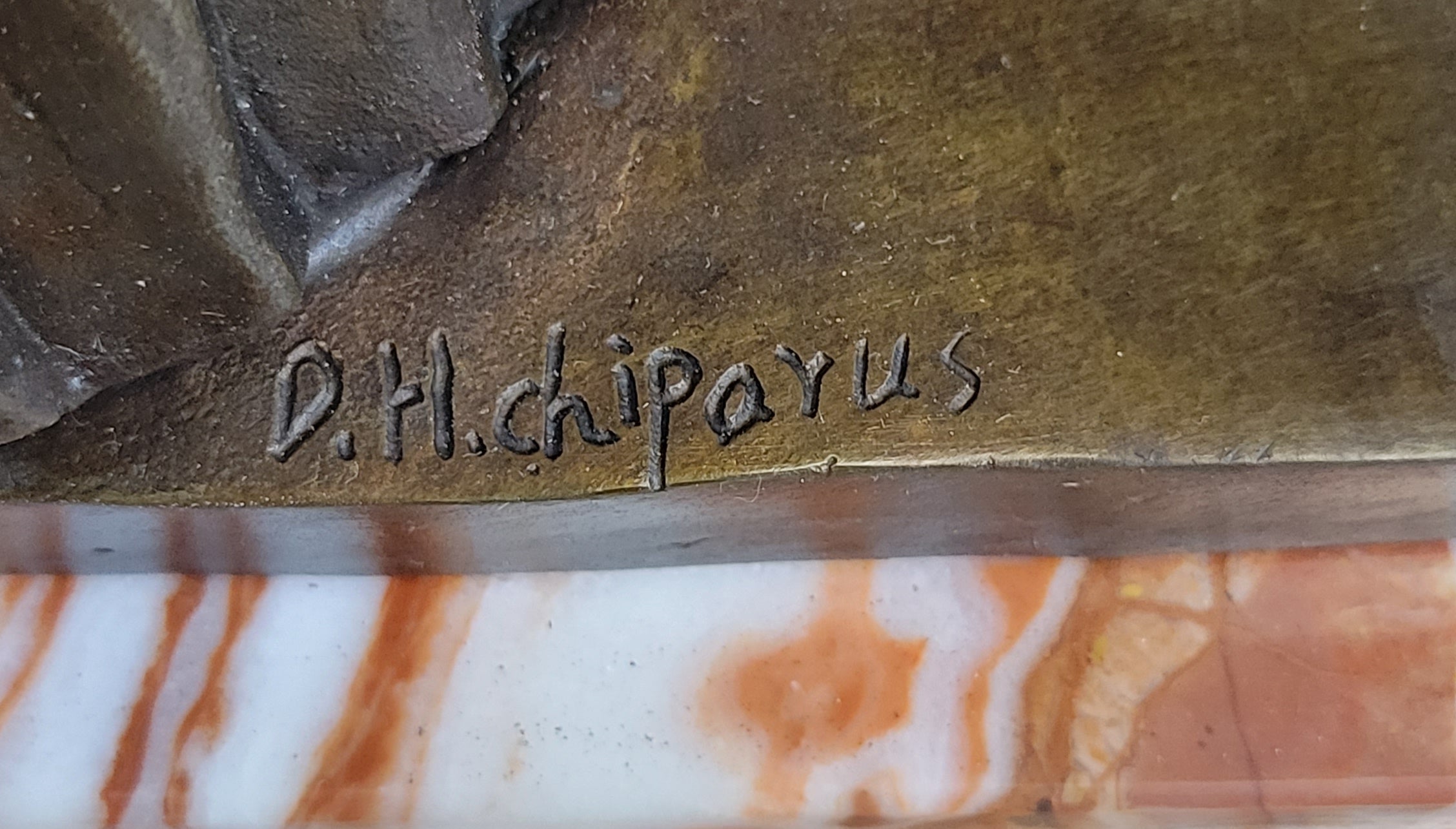 Crafted with utmost care and precision, this handmade bronze sculpture showcases the timeless artistry of the lost-wax casting method. The brown patina finish preserves the sculpture's intricate details and ensures its longevity. Mounted on a variegated red Tennessee marble base, this masterpiece exudes a sense of sophistication and elegance. The signature of the renowned artist D.H. Chiparus adds to its value, signifying the quality and artistry of the sculpture.