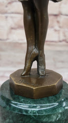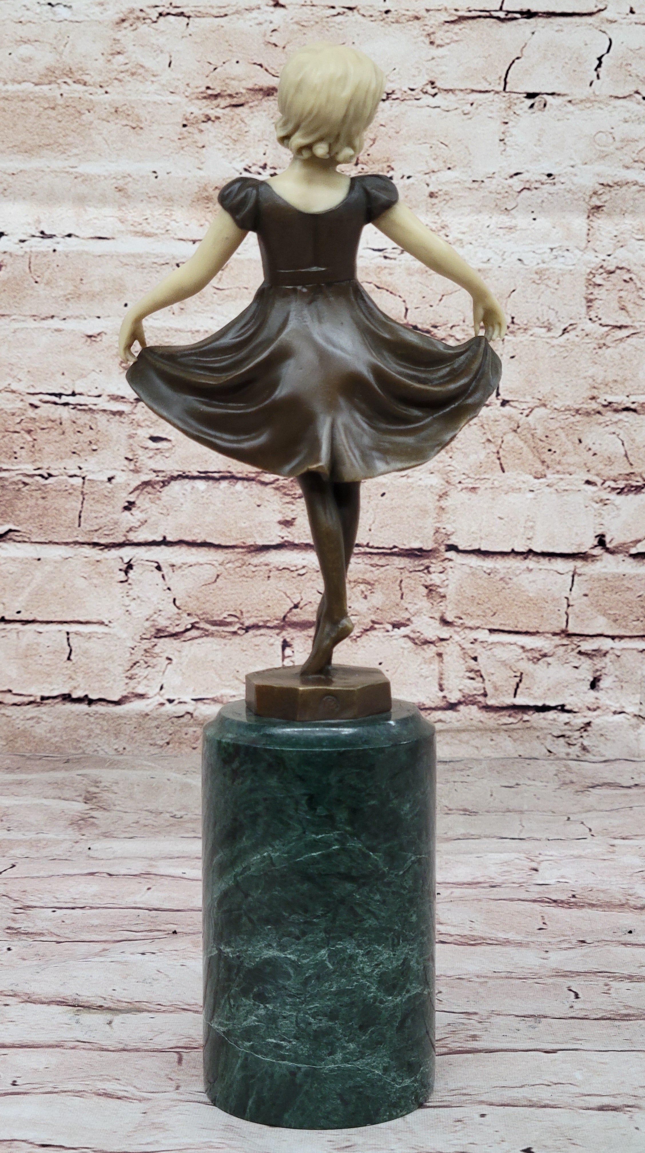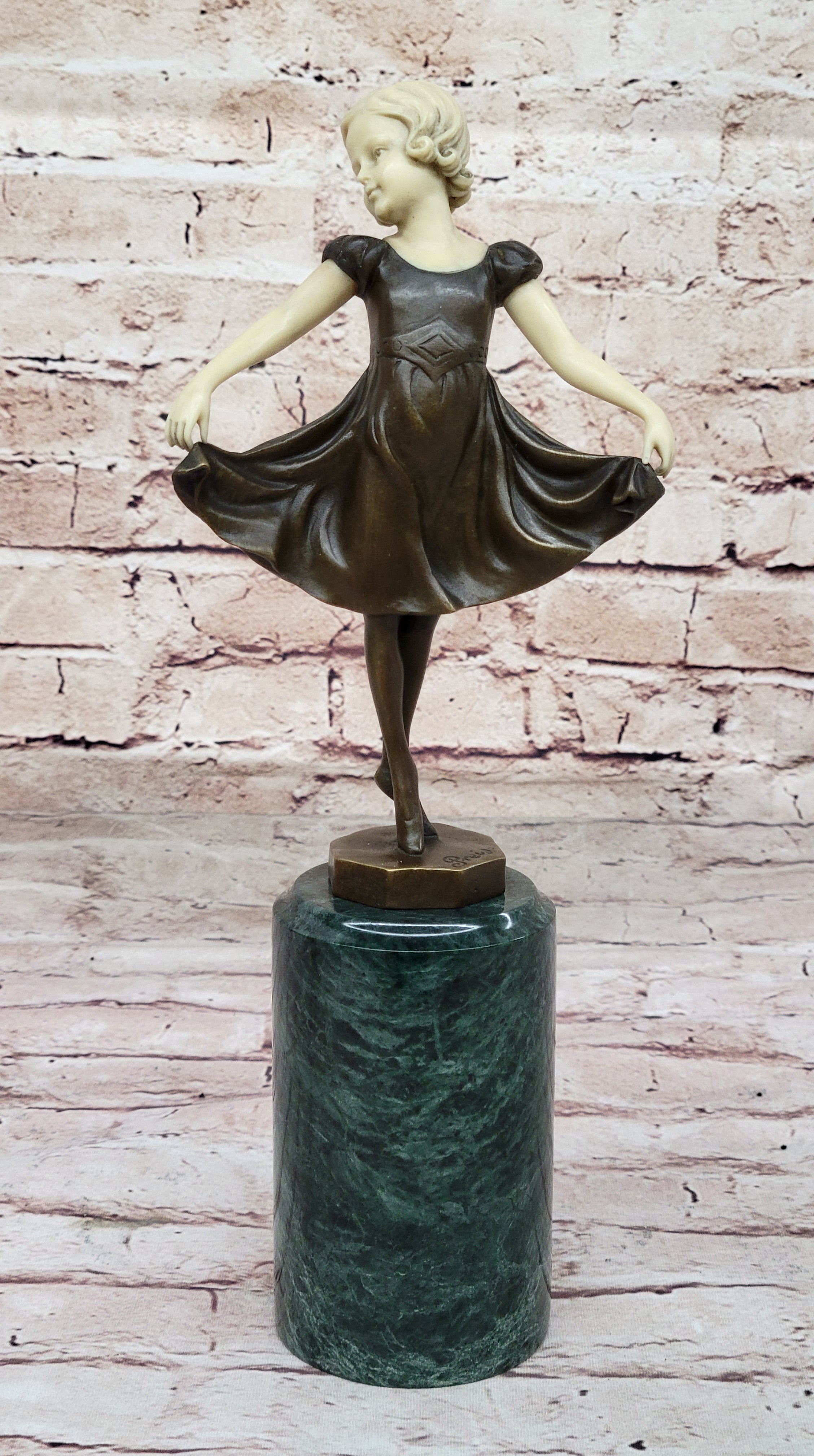 Crafted with meticulous detail using the lost wax method, this bronze sculpture captures the essence of childhood innocence and wonder. Mounted on a green marble base for added sophistication, the sculpture features resin components for the hand and face, allowing for greater precision in capturing the subtle expressions and features of the young girl. Signed by the artist Preiss, this sculpture is a timeless celebration of youth and the joy of performing.Bronze Dimensions with Marble Base: Height 13" X Width 5"