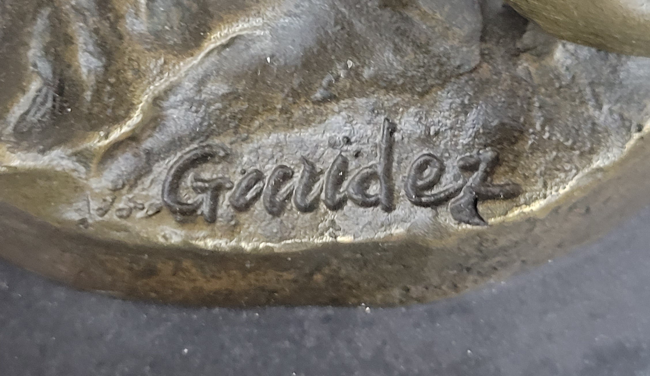 Crafted from 100% bronze and resting on a round black marble base, this piece exudes a timeless elegance that will complement any decor. Signed by the renowned artist Gaudez, it bears the mark of quality and artistry. Whether displayed as a focal point in your collection or as a symbol of enduring love in your living space, this sculpture invites you to connect with its narrative and adds a touch of emotional depth to your surroundings.Bronze Dimensions with Marble Base: Height 18.5" X Width 8"