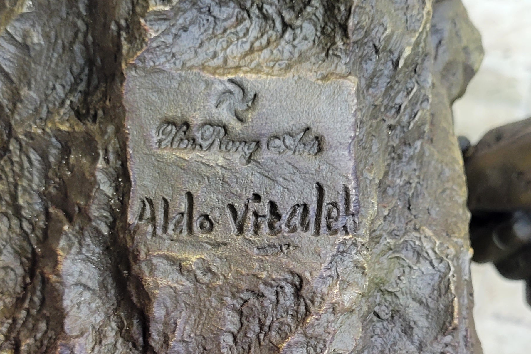 This bronze sculpture serves as a celebration of Michael Jackson's enduring legacy, encapsulating the essence of his iconic dance moves. His profound influence on music, dance, and culture is undeniable, with his artistry continuing to inspire generations of artists around the world. Meticulously crafted using the revered lost wax method, the sculpture rests atop a black marble base, lending it an air of sophistication and permanence. The artist's signature, Aldo Vitaleh, underscores the authenticity and reverence embedded in this tribute to Michael Jackson's remarkable career and cultural influence. Whether showcased in a personal collection or shared in a public setting, this sculpture honors the King of Pop's extraordinary impact on the world.Bronze Dimensions with Marble Base: Height 23" X Width 15"