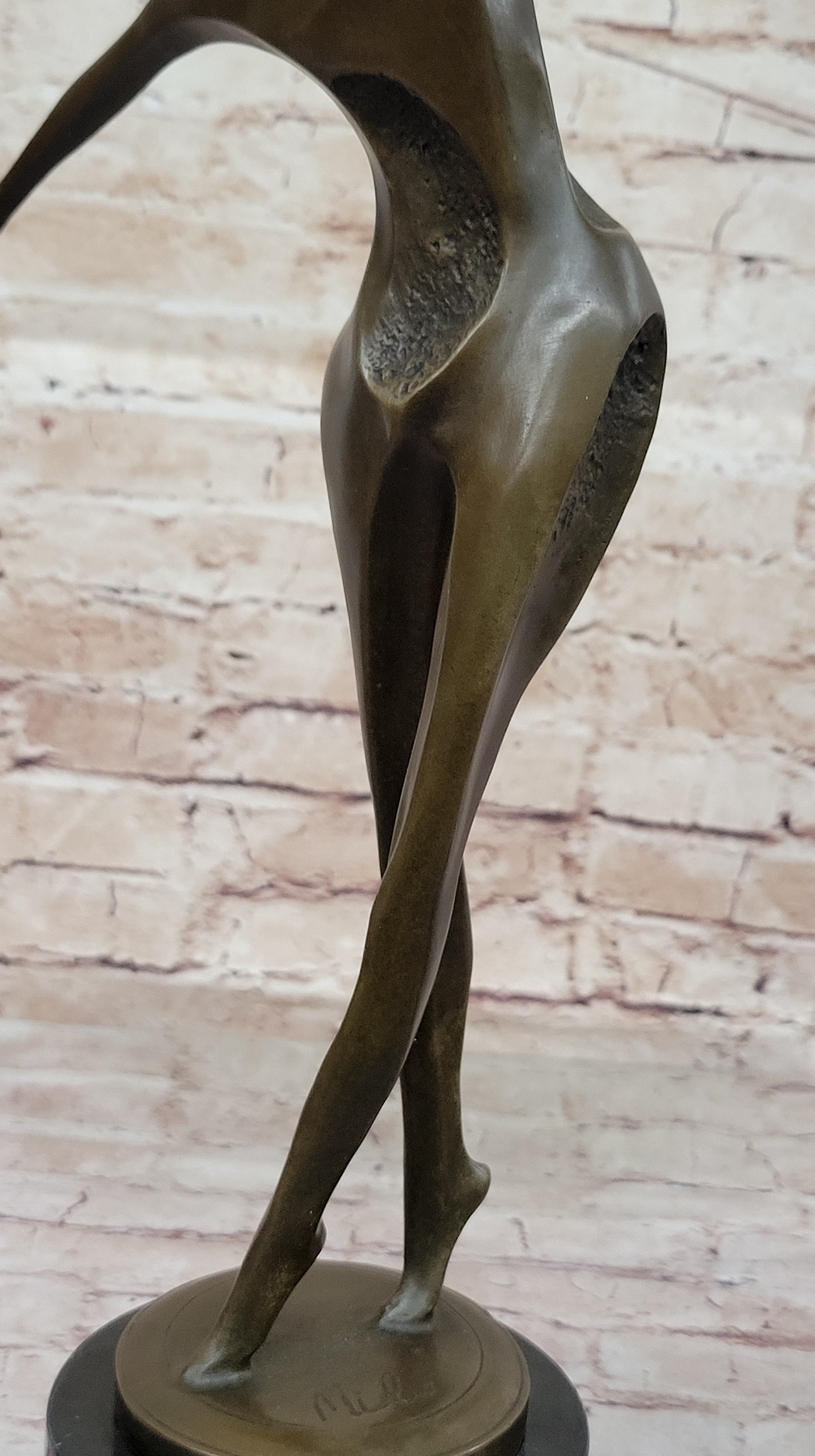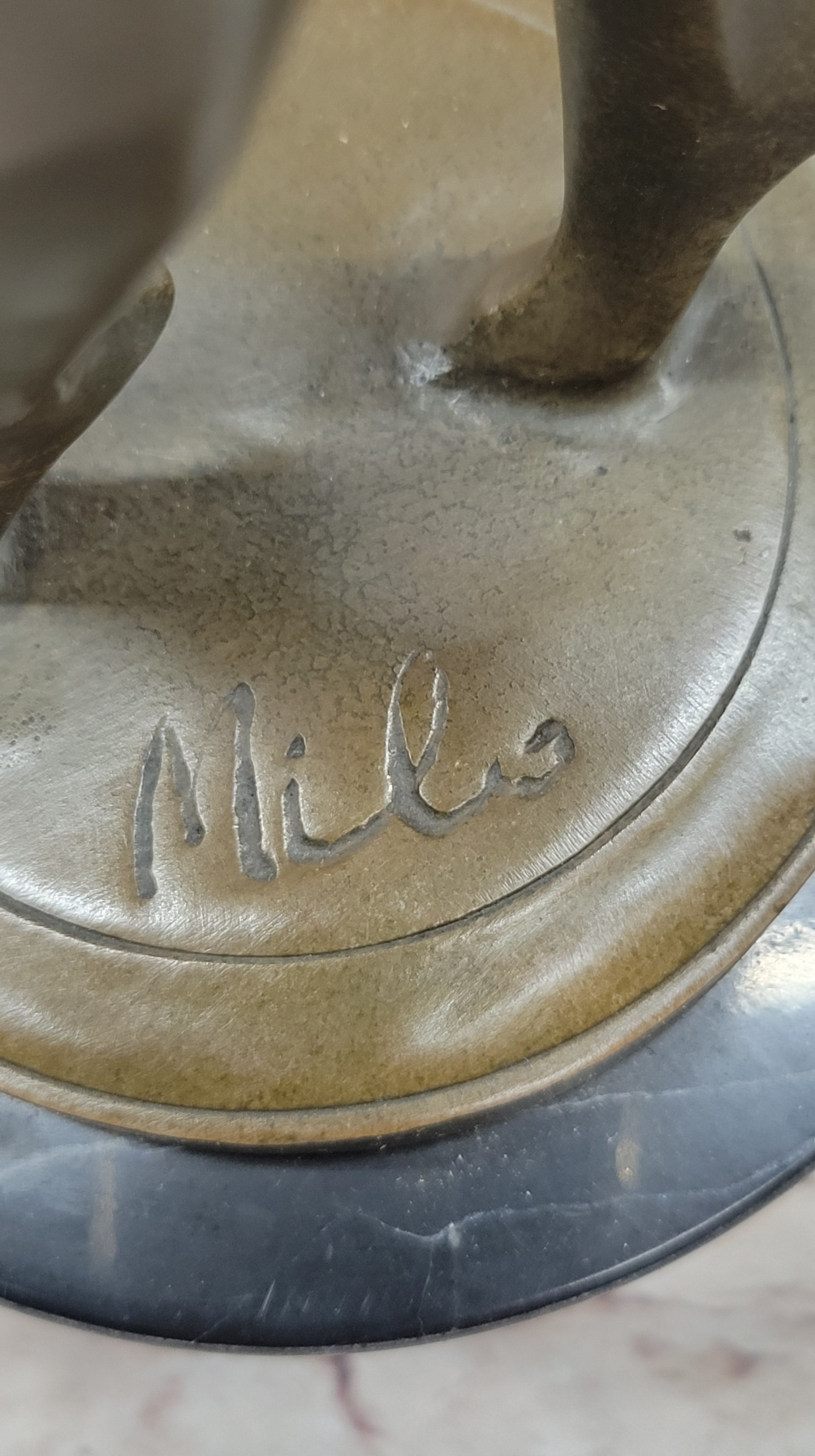 Resting on a round black marble base, the sculpture exudes elegance and sophistication, making it suitable for display on a table or shelf. The combination of the bronze material and the marble base creates a striking contrast that accentuates the beauty of the artwork. Milo's signature on the sculpture further adds to its authenticity and artistic value.