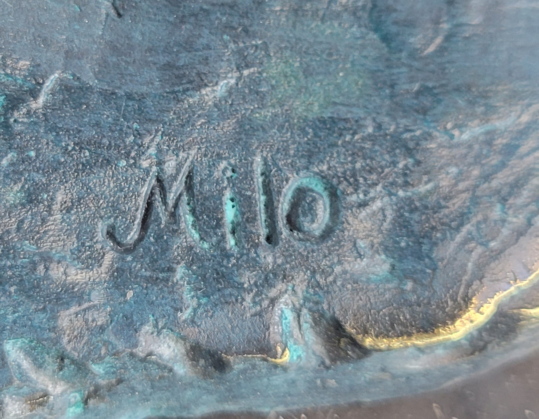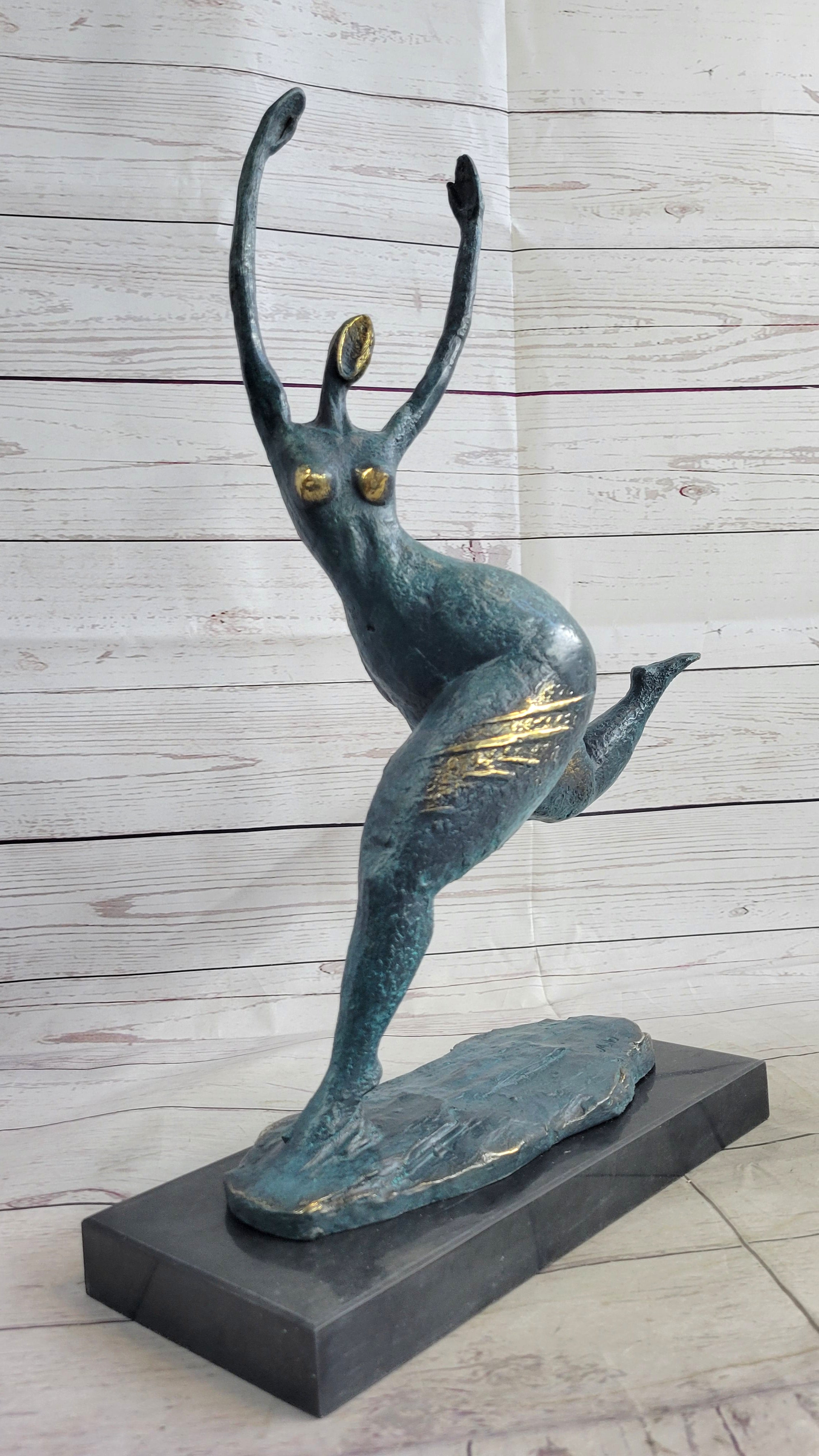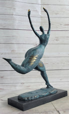 An abstract female dancer sculpture. You can just tell this is a powerful dancer in the sharpness of her position. This wonderfully curvaceous woman bears the wide hips commonly attributed to femininity and fertility. It is a 100% bronze, cast using the lost wax method. It stands tall on a black marble base. This sculpture is signed by Milo.Bronze Dimensions with Marble Base: Height 18 1/2" X Width 14"