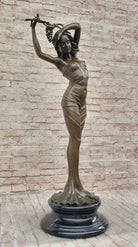 This exquisite sculpture stands on a black marble base, enhancing its visual appeal and making it an exceptional addition to any art collection or decor. Whether displayed in a private space or shared with others, this bronze masterpiece is sure to provoke intrigue and admiration for its portrayal of feminine grace and artistic expression.Bronze Dimensions with Marble Base: Height 33" X Width 11"