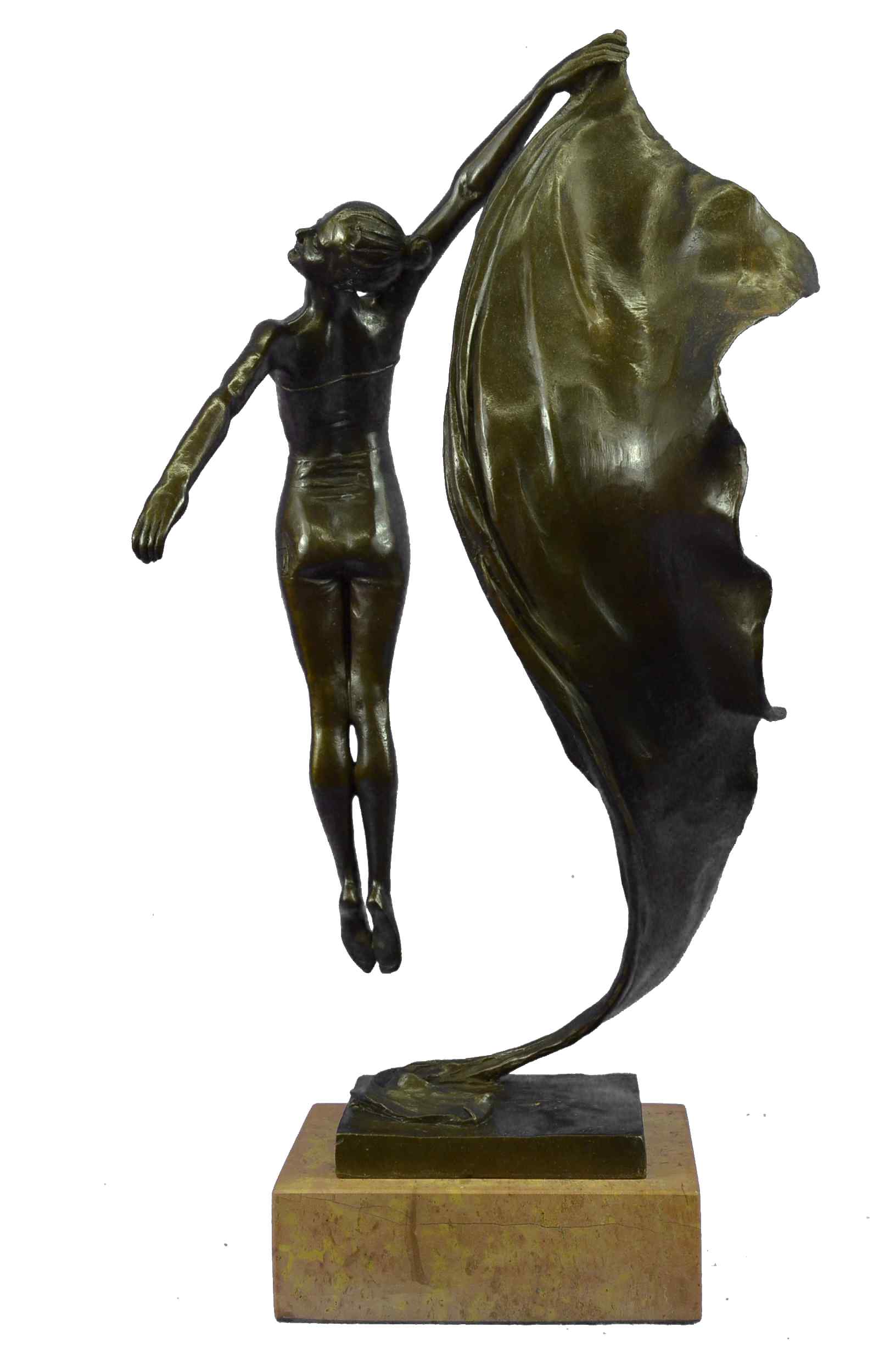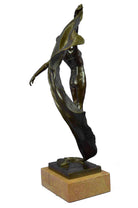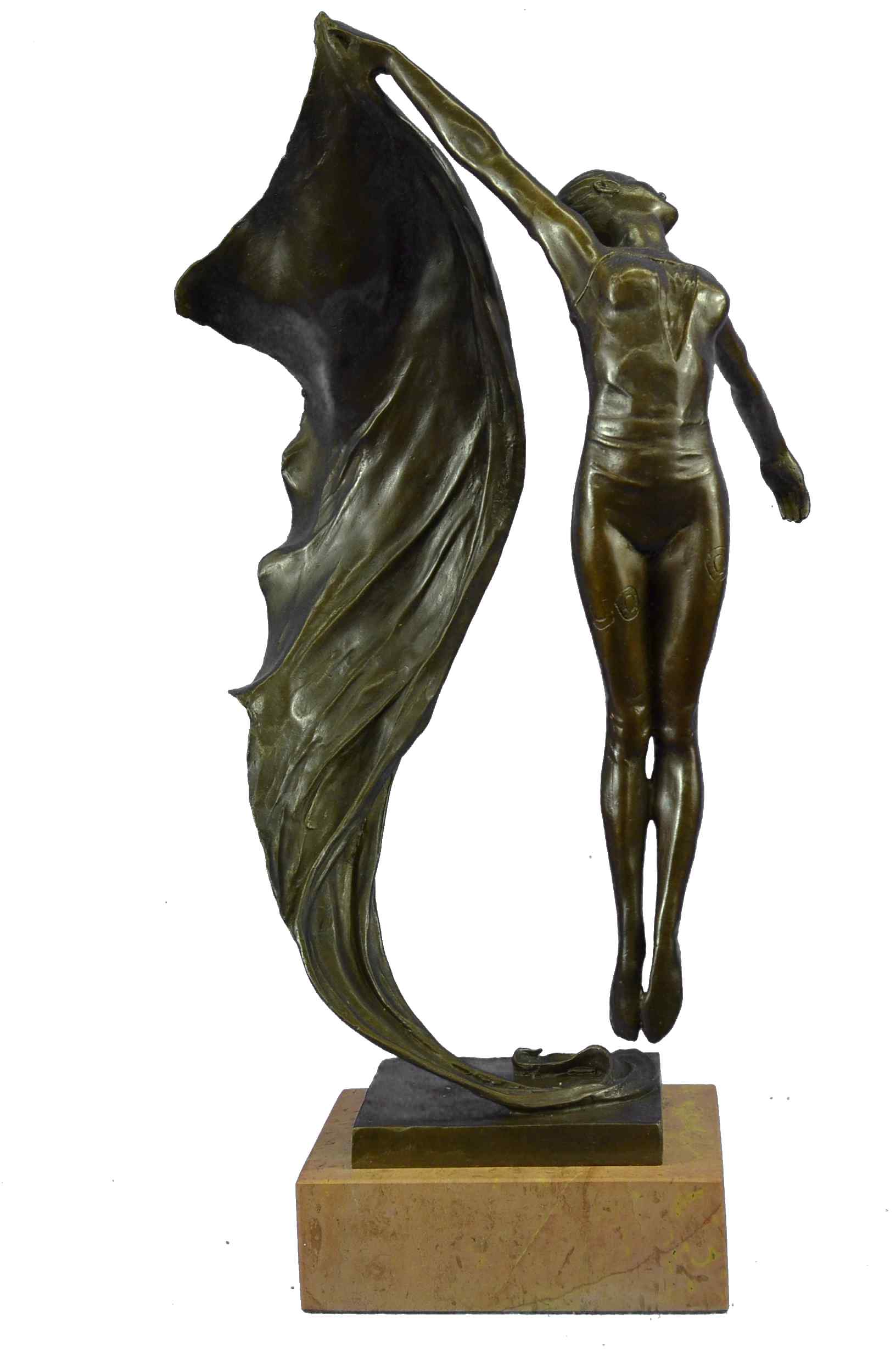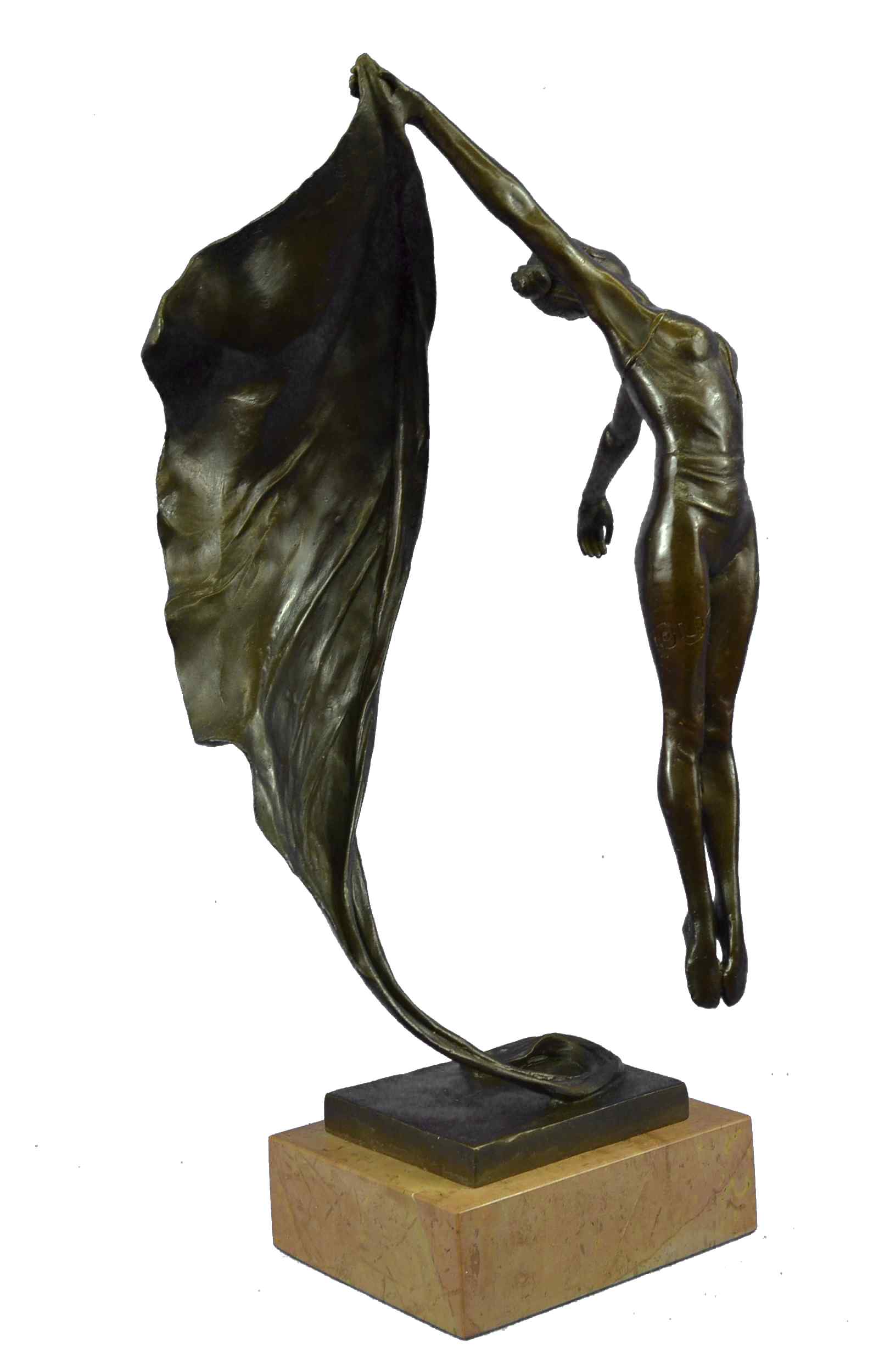 The nude aerialist is seen leaping into the air as a fabric banner, coated in a vibrant green patina, twines itself around her sculpted body.This work of art rejoices the female figure and shows attention to the body under the influence of movement. But most importantly, it`s essence characterizes the spirit within the body that wishes to bound out into everything and everywhere. She was cast using the archaic method of lost wax casting and her skin tone stained with a brown patina finish. The sculpture is mounted upon a black marble base with he artist Aldo Vitaleh`s signature.Bronze Dimensions with Marble Base:Height 19" x Width 12"