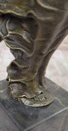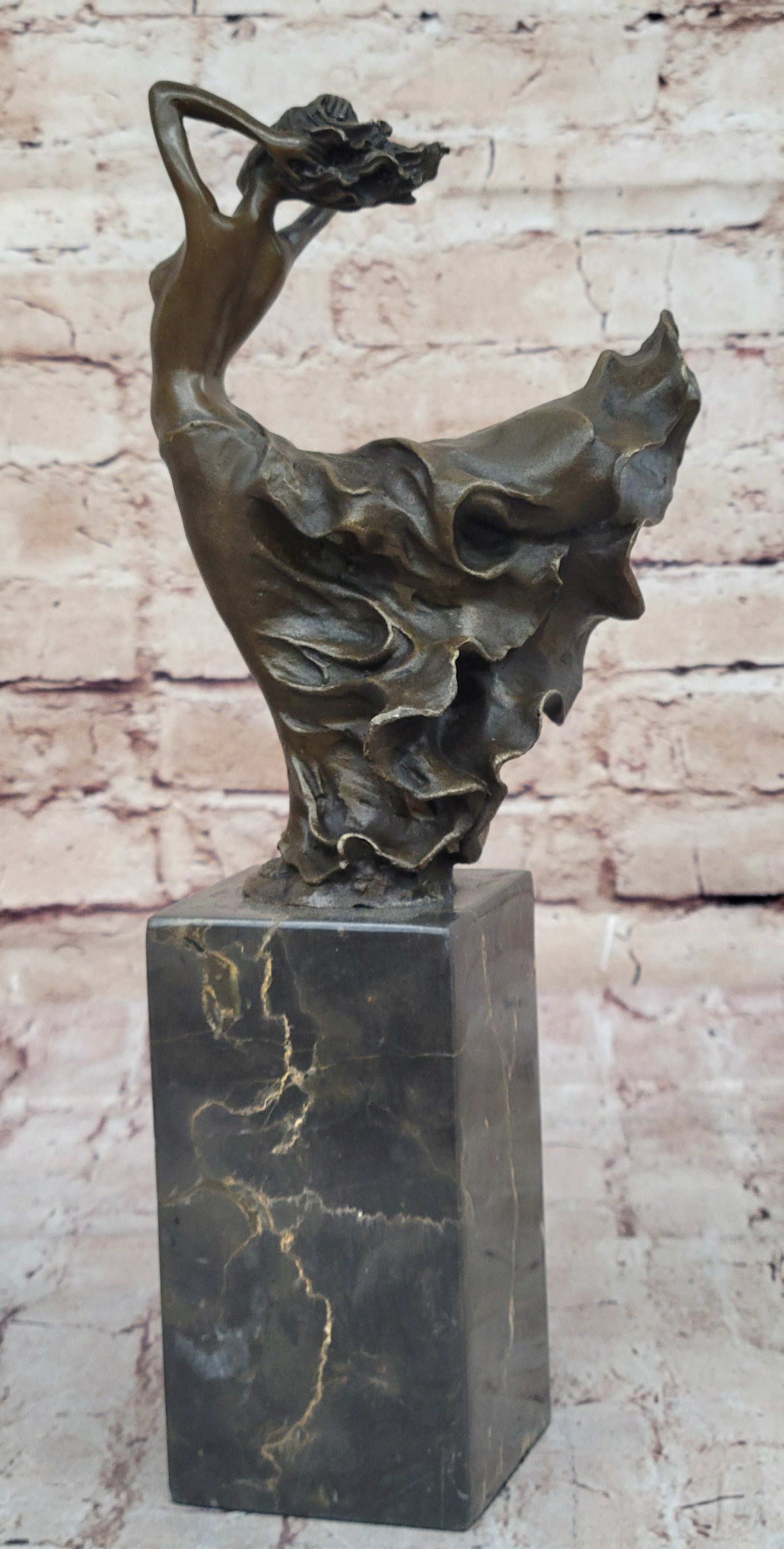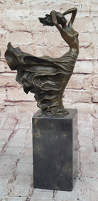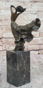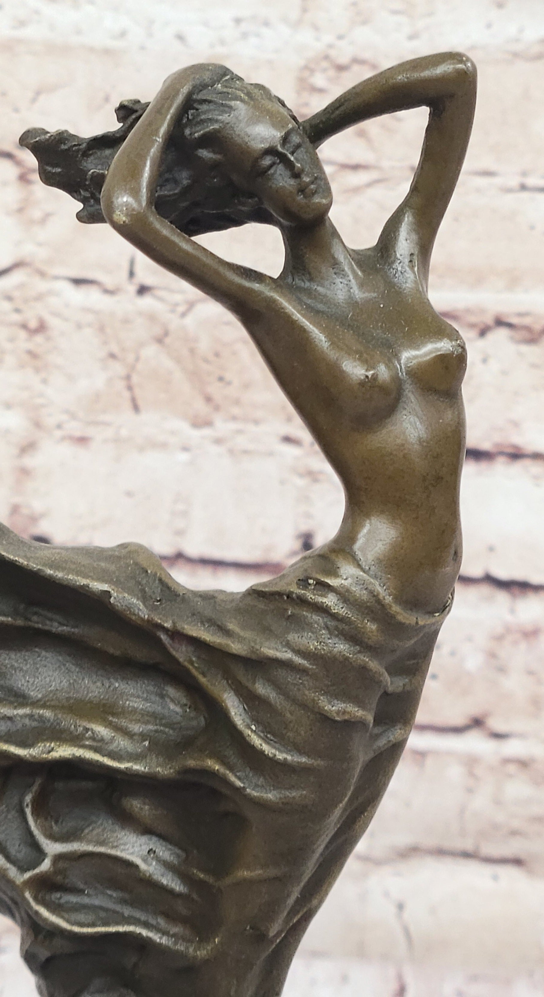 The sculpture is mounted on a polished brown marble base, providing a solid and sophisticated foundation that complements the bronze figure. The contrast between the bronze and marble materials highlights the intricate details and flowing lines of the woman's form, making this piece a stunning addition to any collection.