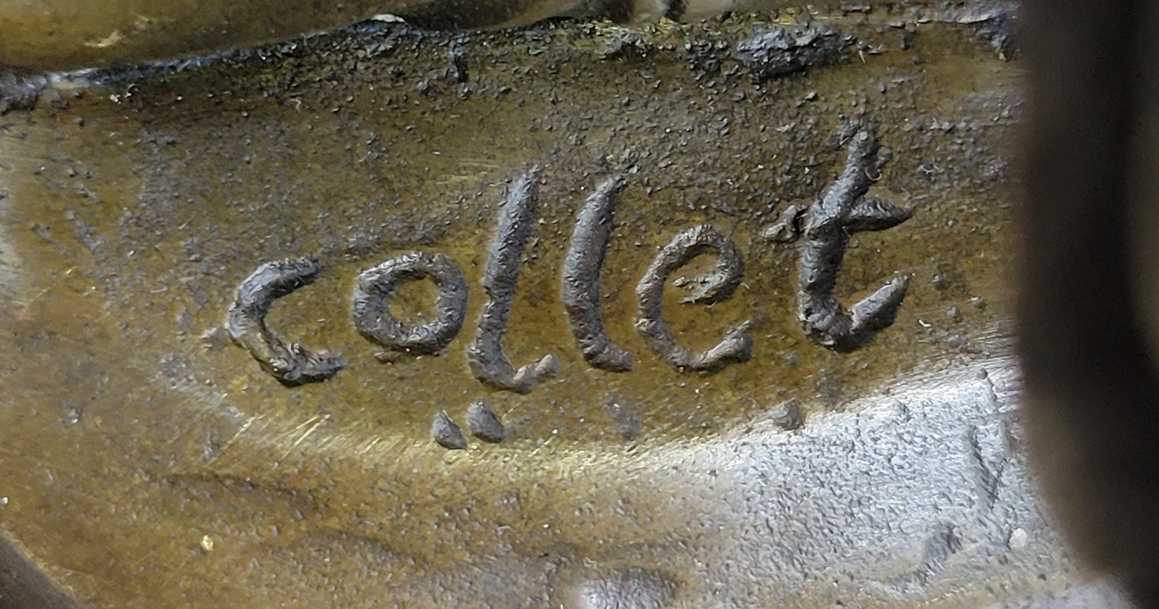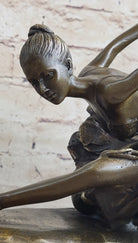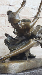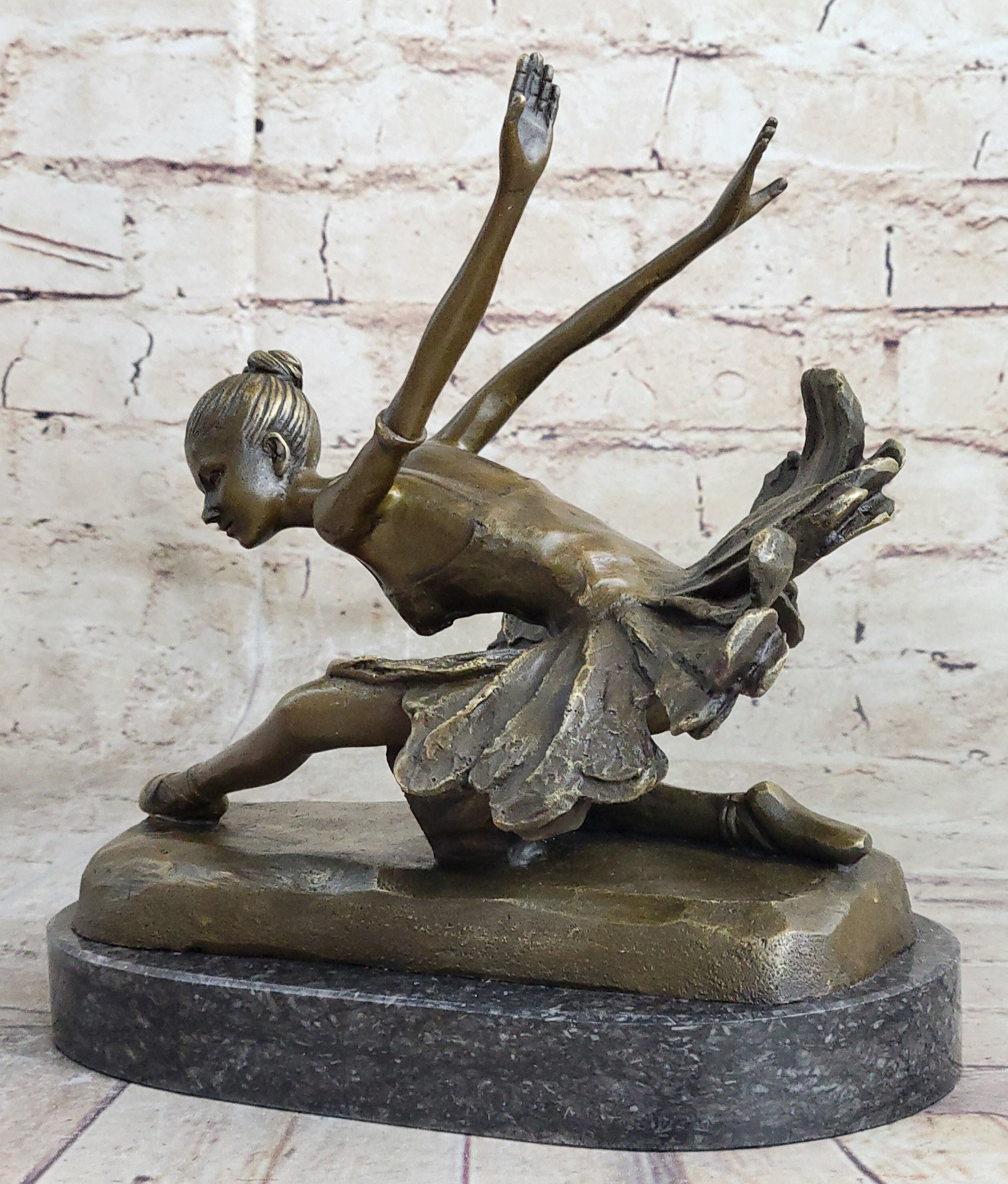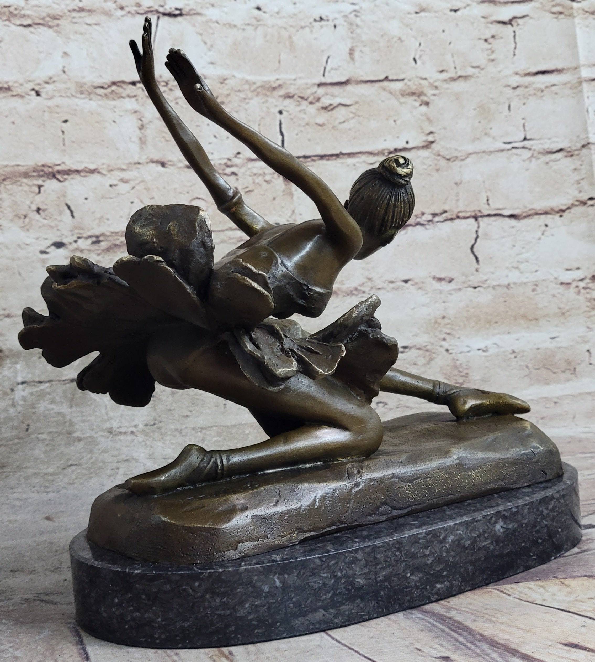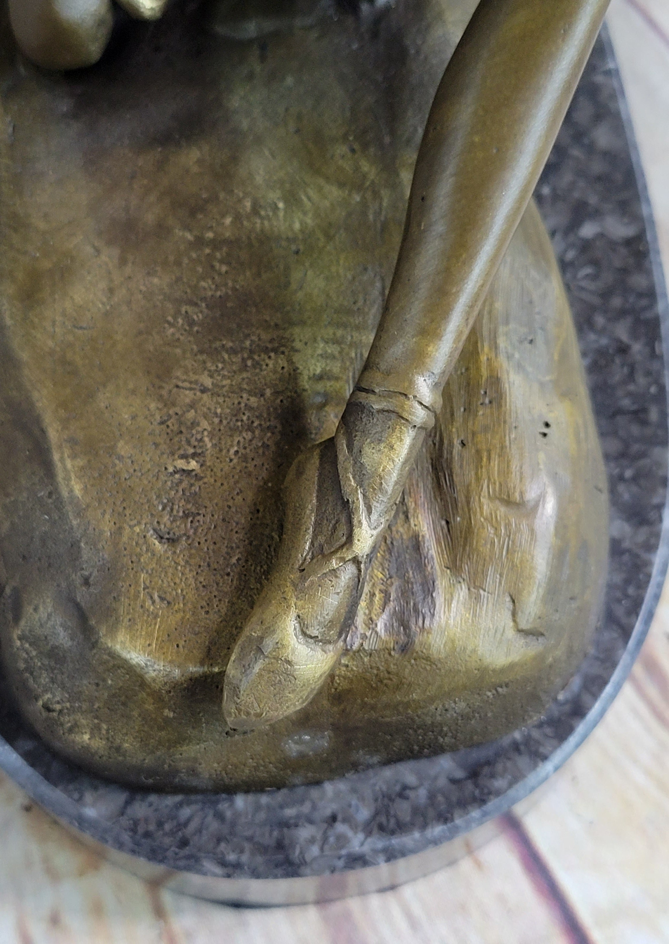 The sculpture was created using the "Lost Wax Method" and finished with a brown patina. Mounted on a classic black marble base, it exudes elegance and timeless beauty. This sculpture is entirely handmade and 100% bronze, signed by the artist Collet. It is a stunning work of art that captures the essence of ballet and is sure to bring joy and beauty to any home or space.Bronze Dimensions with Marble Base: Height 8.5" X Width 9"