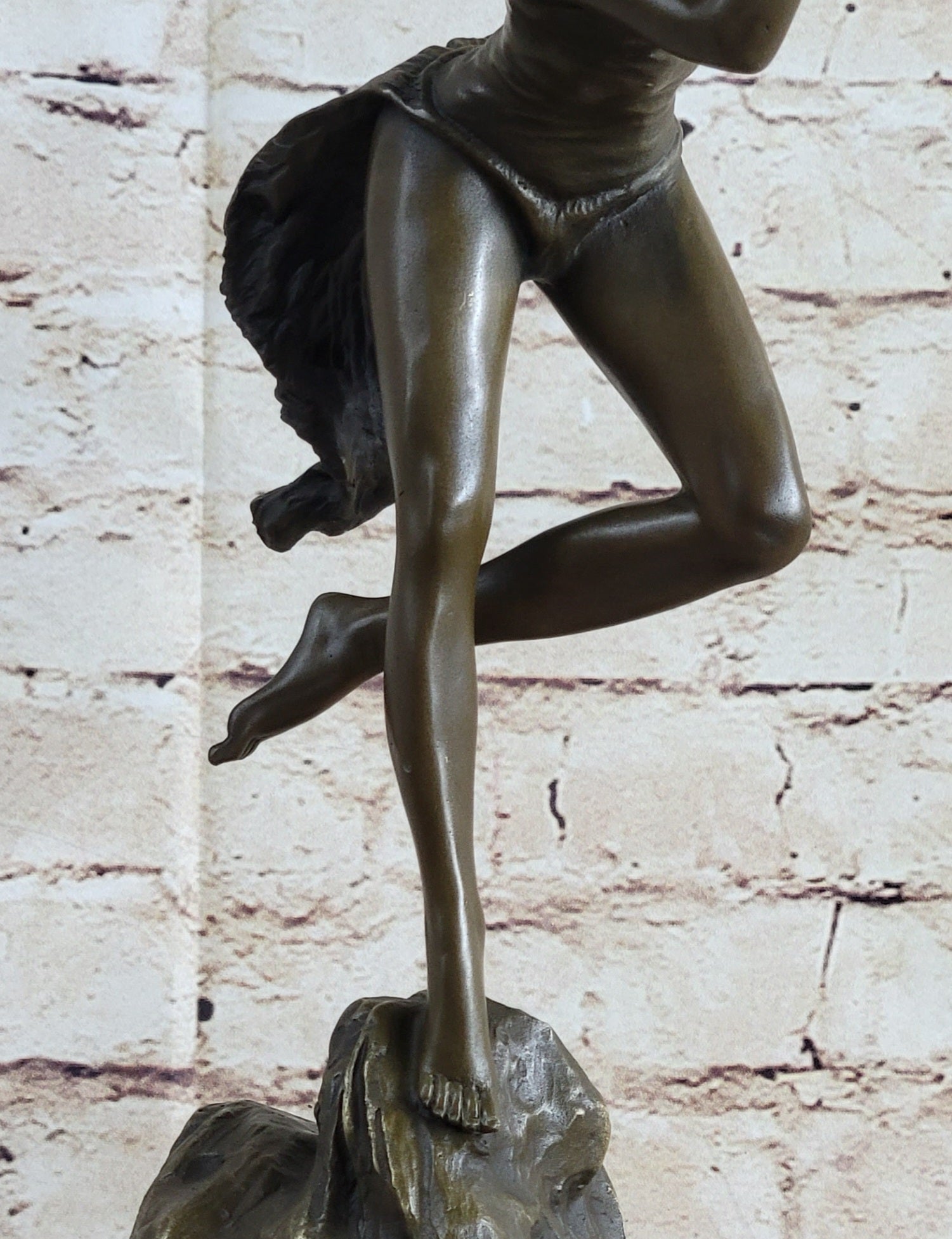 Crafted using the revered lost wax method, this bronze sculpture stands as a testament to the enduring tradition of artisanal craftsmanship. Mounted on a black marble base, it commands attention with its presence and beauty. Signed by the artist, it bears the mark of authenticity and excellence, inviting viewers to immerse themselves in the timeless allure of the wood nymph's song and dance.Bronze Dimensions with Marble Base: Height 14" X Width 10"