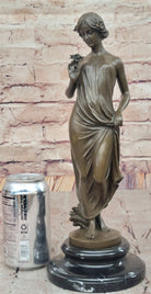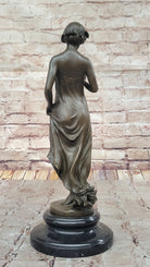 In this enchanting bronze sculpture, we are transported into a moment of quiet contemplation and gentle allure. The young lady depicted in this artwork stands poised, her gaze fixed lovingly upon a delicate flower held delicately in her hand. There's a sense of anticipation and quiet joy in her expression, hinting at the possibility of a cherished gift from an admirer. Her attire, an elegant and figure-hugging gown, adds to the overall sense of sophistication and grace.