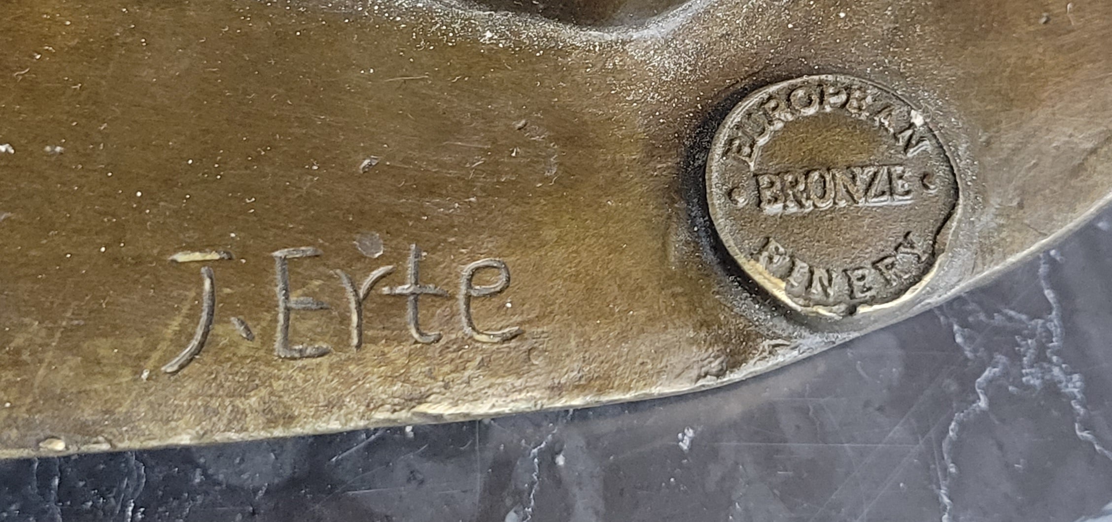 This beautiful sculpture of a tango dancer will leave you in pure amazement and excitement. The stunning beauty really is gorgeous, her aqua dress flows down her body giving her the most elegant look, it cuts really low up front revealing most of her chest. Even without a partner she is still working the crowd as she sways her hips to the music, that is loudly coming out the speakers. She closes her eyes to stay in tune with the beat of the song and with both hands she holds each side of her exquisite dress up. Her hair is placed neatly in a low bun, with a gold head band to match her cute heels. This sculpture was cast using the ancient old "Lost Wax Method" stained in a brown patina finish for preservation. 100% handmade and 100% bronze, mounted atop a black marble base and signed by the artist J.Erte.Bronze Dimensions with Marble Base:Height 21" x Width 11"