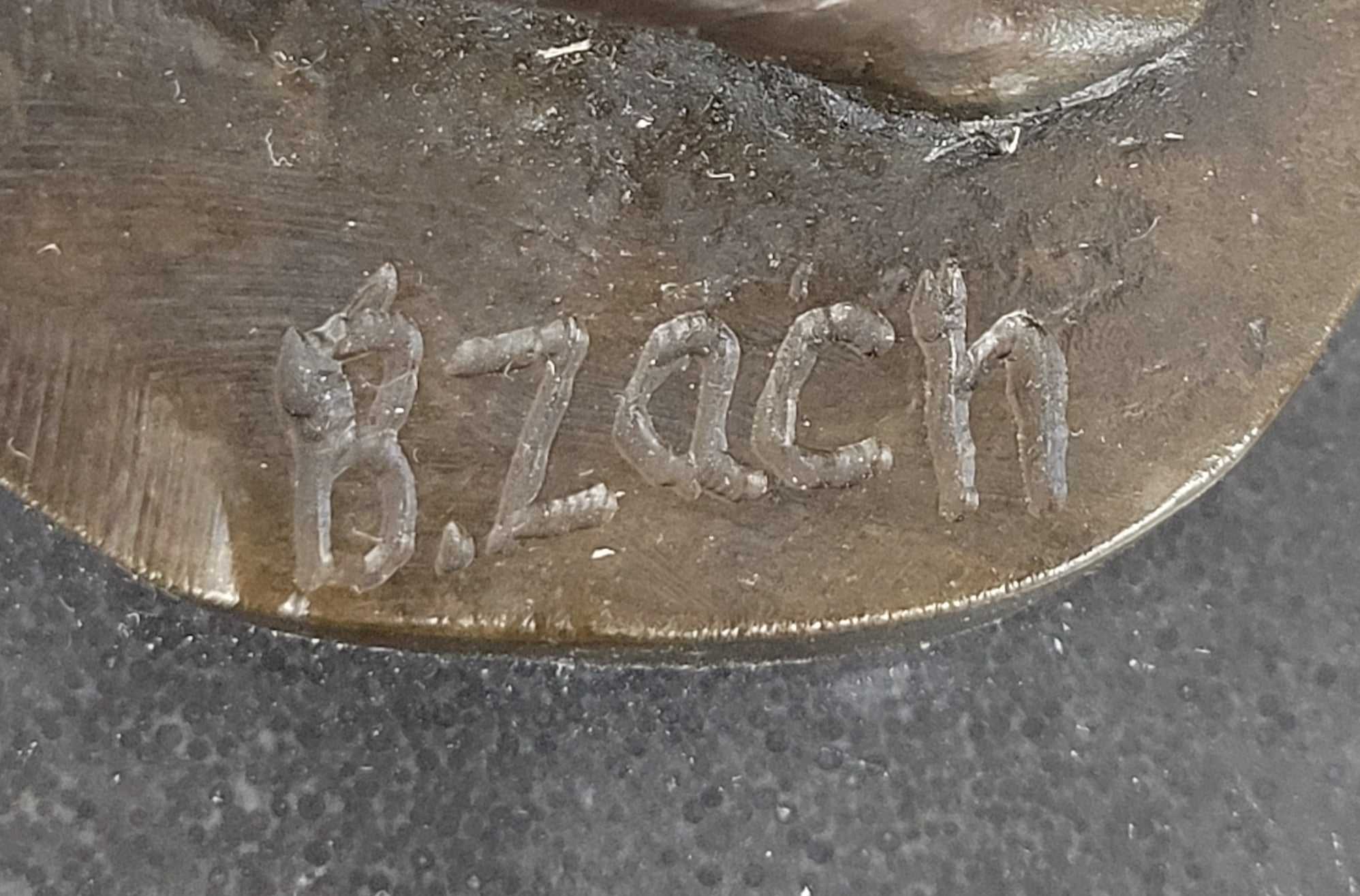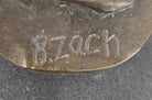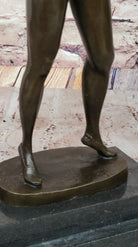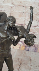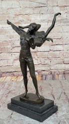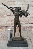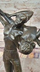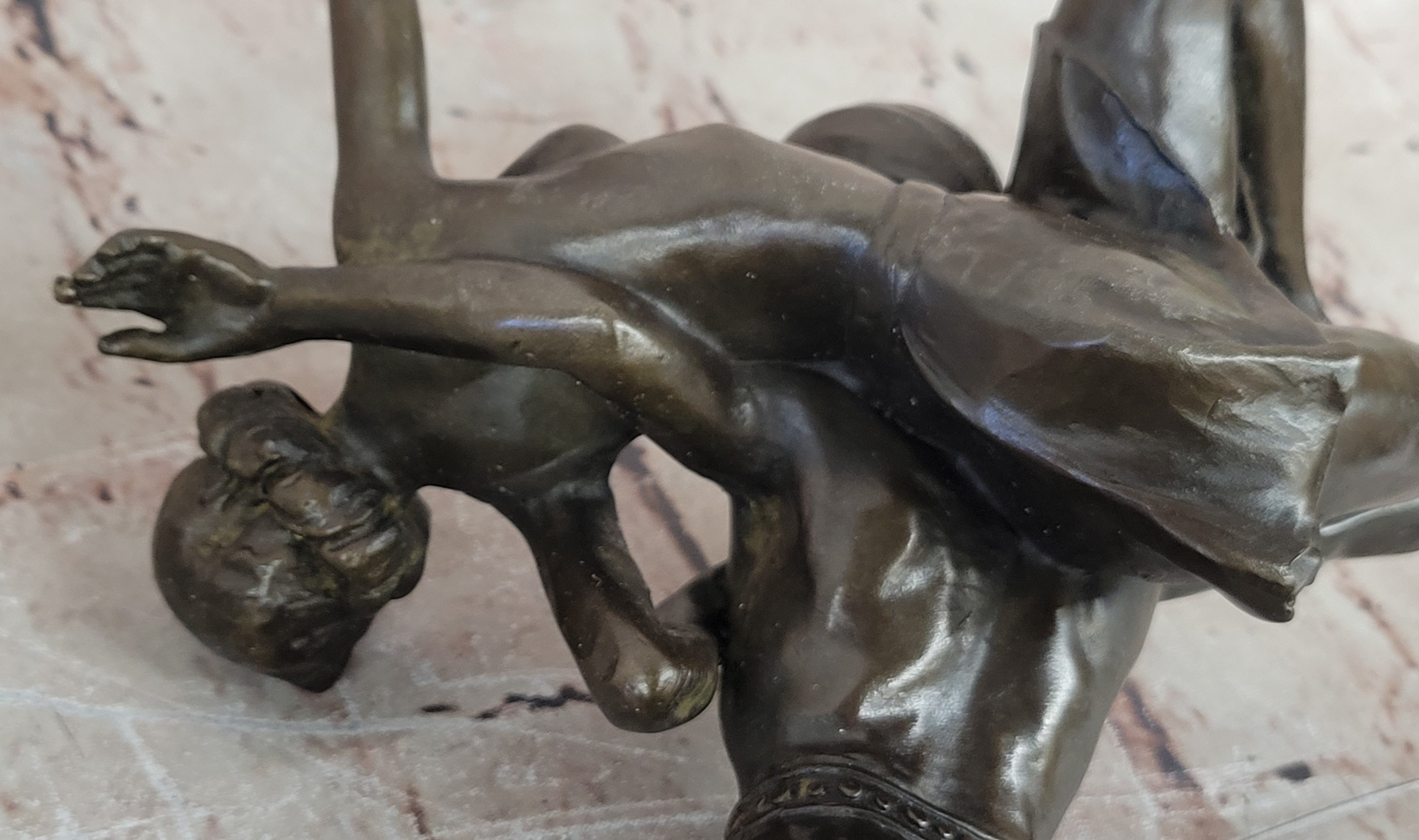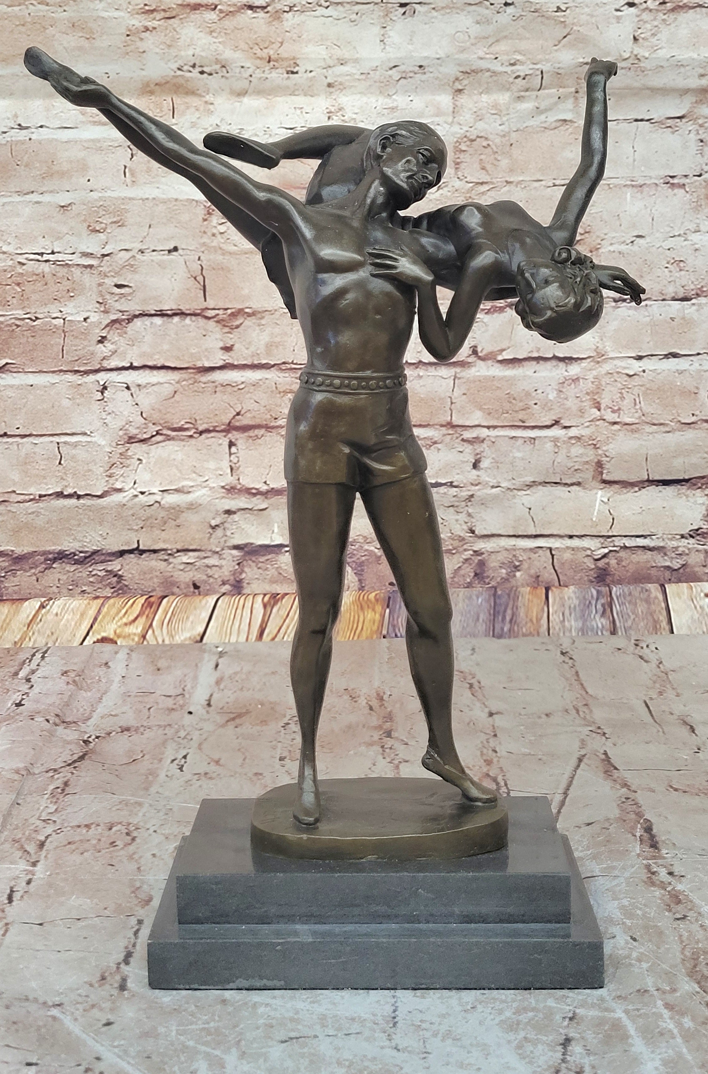 This sculpture is spectacular and divine to the last little detail. The strong male carries the female on his left arm without a sign of any struggle he lifts her whole body as he raises his arm higher. His other arm is aligned with her left leg which is lifted straight out in a stiff pose, while her other leg is bend at the knee to the side as her foot touches her left legs inner thigh. She is gracefully and elegantly leaning back from his arm, while she grabs on to his chest with her left hand since the other is raised up high. He look as though he is lifting a feather and he lifts his left foot a little. They are casted using the ancient old "Lost Wax Method" stained in brown patina. 100% handmade and 100% bronze, mounted atop a black marble base and signed by the artist B. Zach.Bronze Dimensions with Marble Base:Height 15" x Width 9"