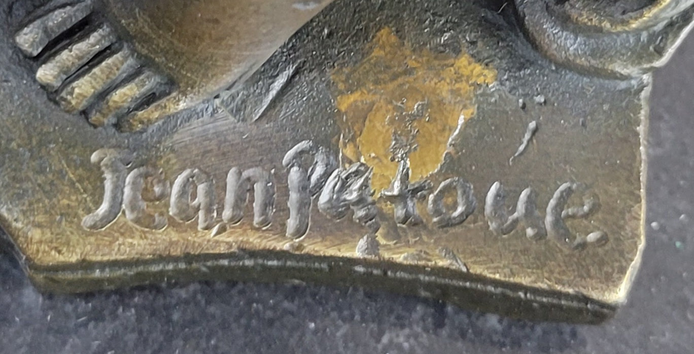 Crafted entirely from bronze and mounted on a black ornamental marble base, this sculpture is a testament to the timeless beauty of Art Nouveau. The choice of materials not only ensures its durability but also highlights the intricate details of the sculpture, from the delicate folds of the garment to the fine features of the woman's face. The artist, Jean Patou, has skillfully captured the essence of elegance and poise, creating a piece that resonates with viewers on both an aesthetic and emotional level.