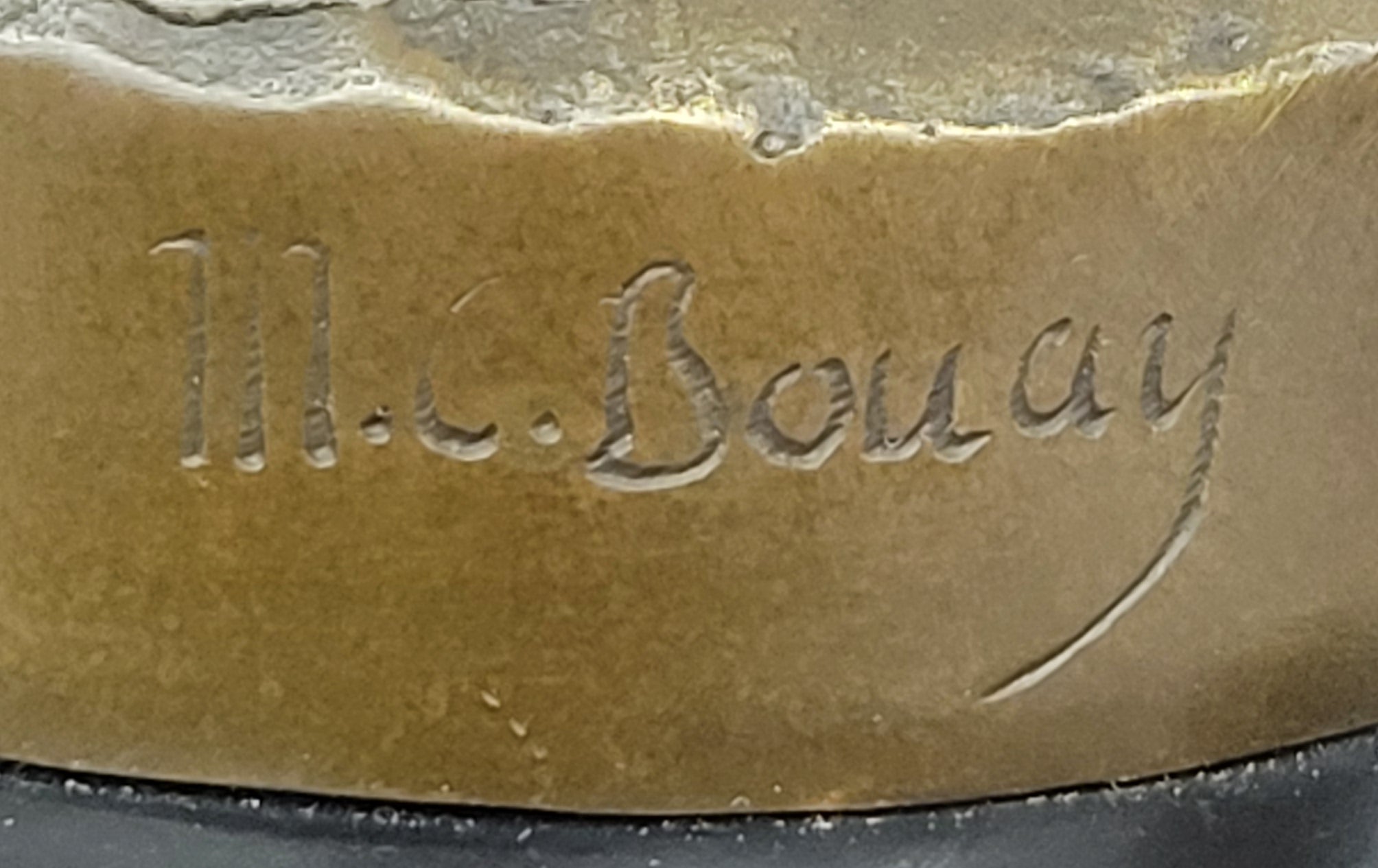 As a centerpiece in any art collection or an elegant addition to your living space, M.C. Bouay's Dancer of Tambourine invites you to immerse yourself in the world of fine art. The harmonious fusion of the lost wax method, the round marble base, and the rich brown patina elevates this sculpture beyond a mere art piece, turning it into a captivating symbol of beauty and movement frozen in bronze.Bronze Dimensions with Marble Base:24.5" X Width 7"